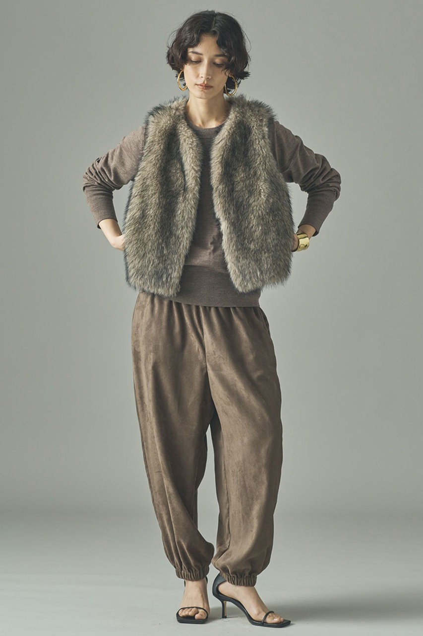 本物のファーのような高級感が魅力のフェイクファーベスト。ミンクのような長めの毛足が、リアルな表情を演出します。