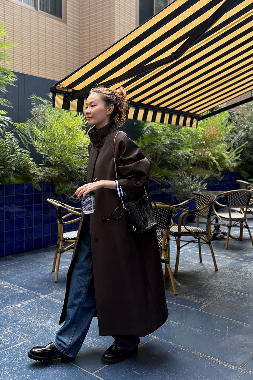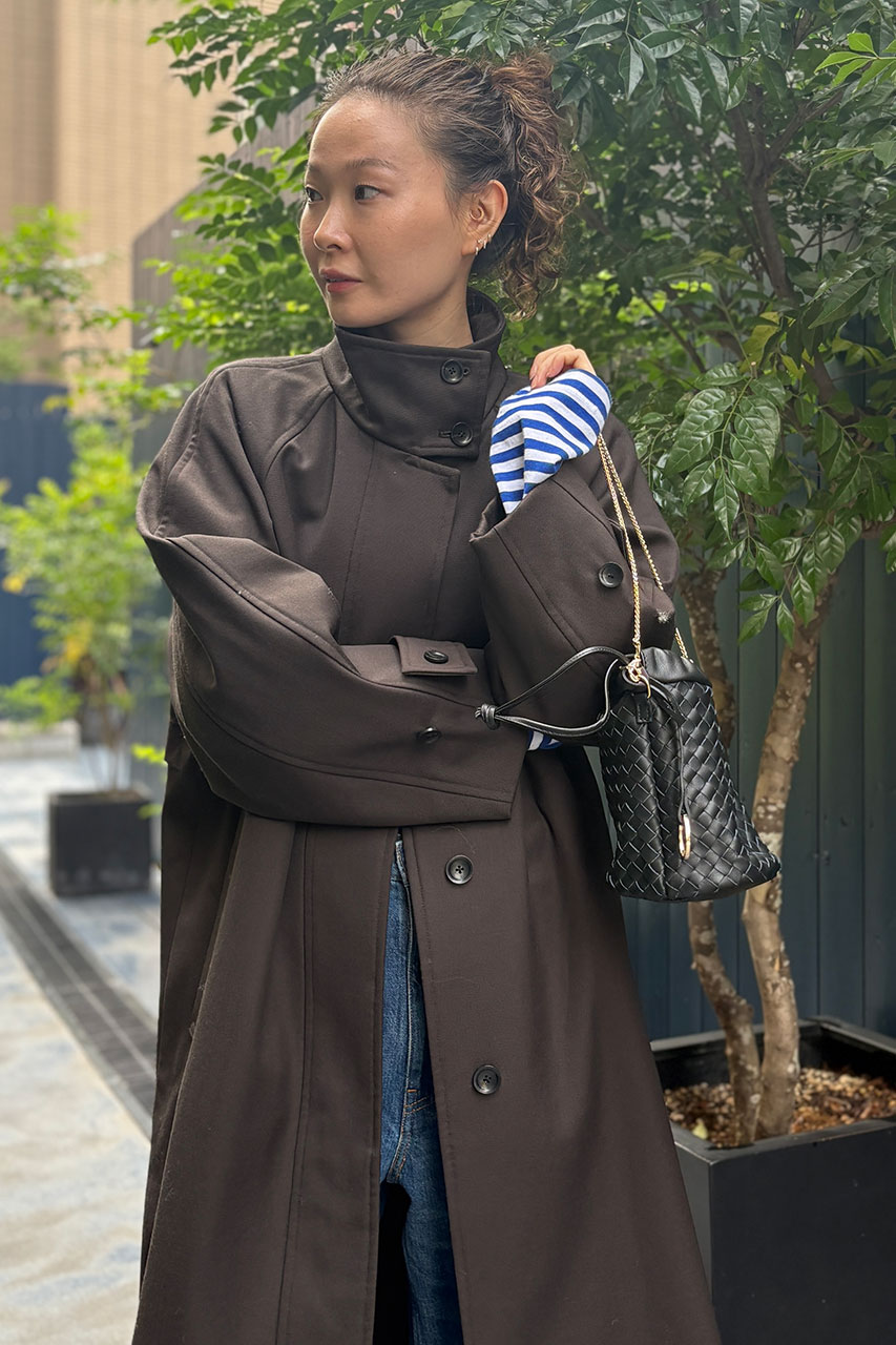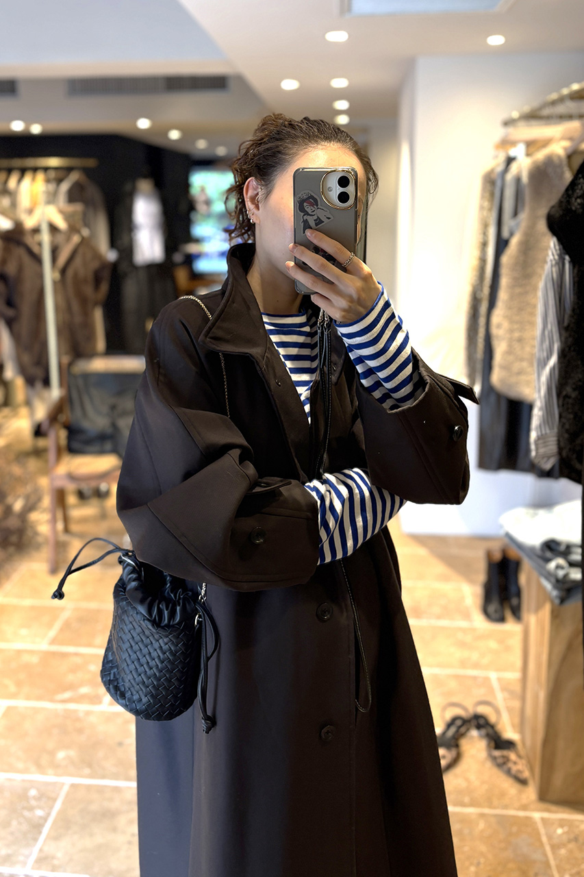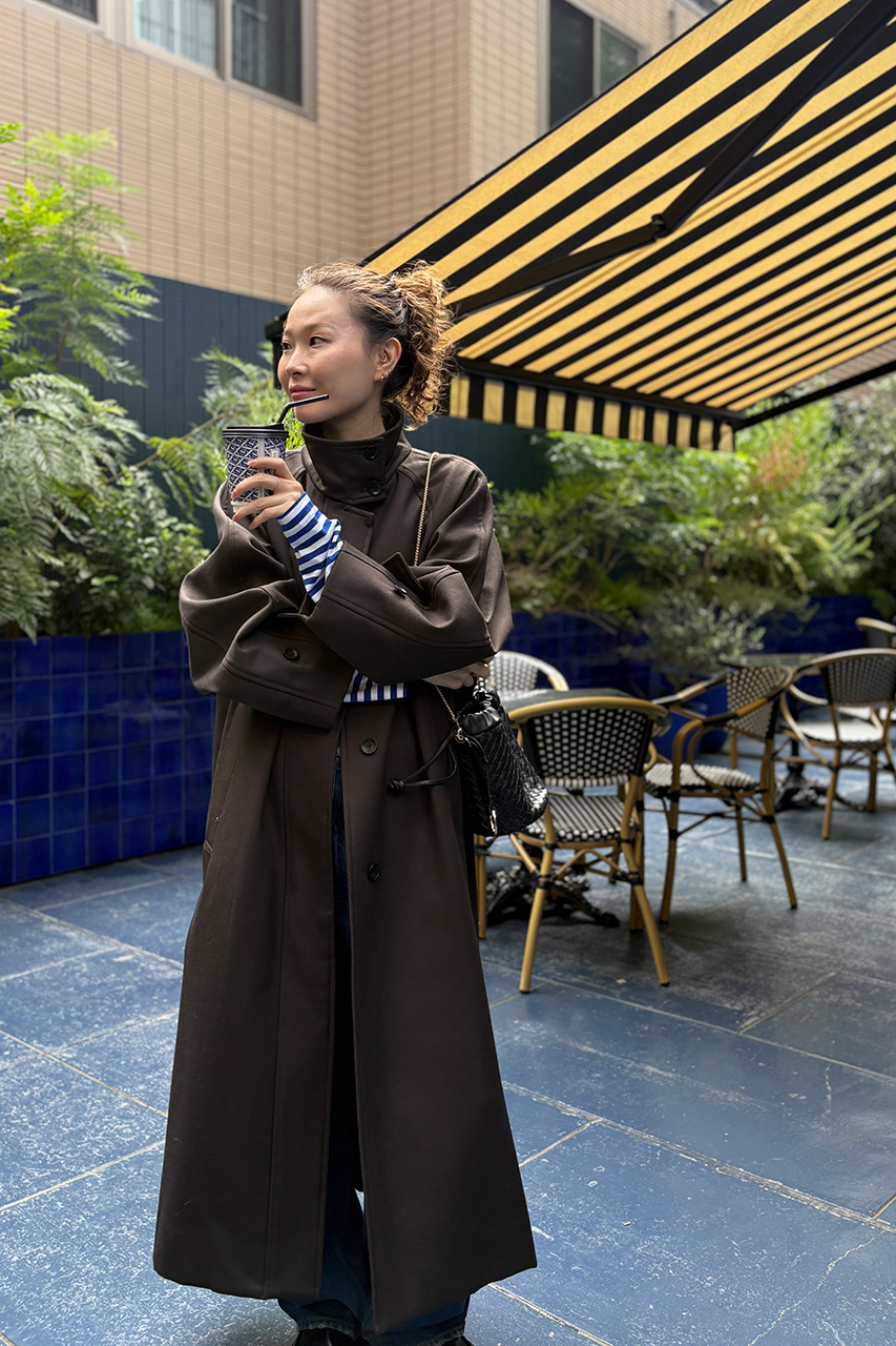 ブルーのボーダーロンTと女性らしいカーヴィーデニムを合わせた大人カジュアルスタイルに、秋にぴったりのこっくりとしたブラウンのロングコートを羽織って大人な雰囲気に着こなしました。袖口からちらりと覗くボーダーがアクセントになっています。コートは日本が誇るウール産地、尾州で高密度ギャバに中綿ボンディング加工を施した逸品です。トレンチコート感覚で羽織れて、トレンド感と暖かさを両立できる人気のアイテムです。