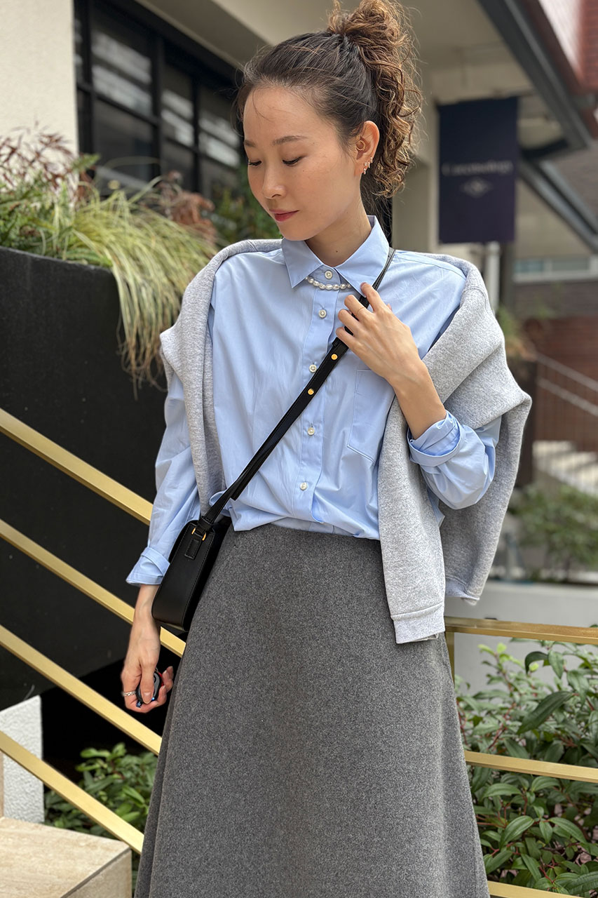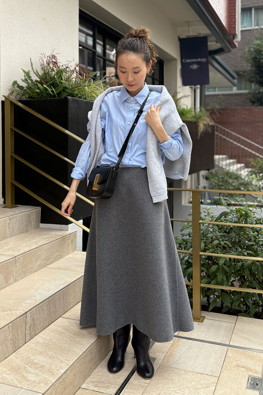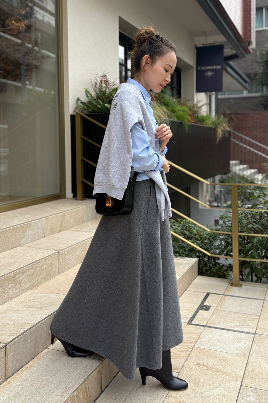 ウールボンディング素材のしっかりとした張り感を活かした上品なフレアシルエットスカートをメインに、肩にかけたスウェットが気温調整しやすくおしゃれに決まるスタイリングにしてみました。スカートは斜めに走るサイドの切り替えが立体感を強調し、足首が見える絶妙な着丈がスタイリングに抜け感をプラスしてくれます。今シーズン注目のロングブーツと合わせで、今年らしいバランスで着こなしたのがポイントです。