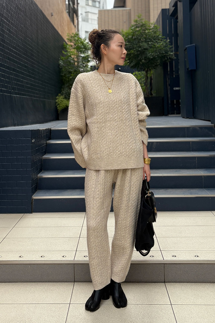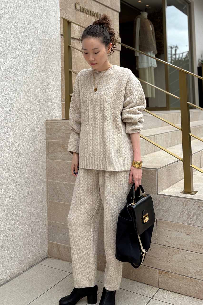温かみのあるケーブルニットはセットアップでご用意しています。