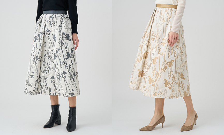 ハリのある生地の特性を活かし、タックを施したふんわりとしたシルエットが綺麗なスカート。