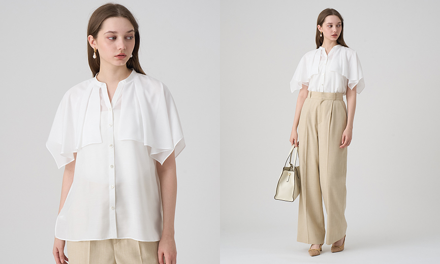 スキッパー衿のケープラッフルブラウス。