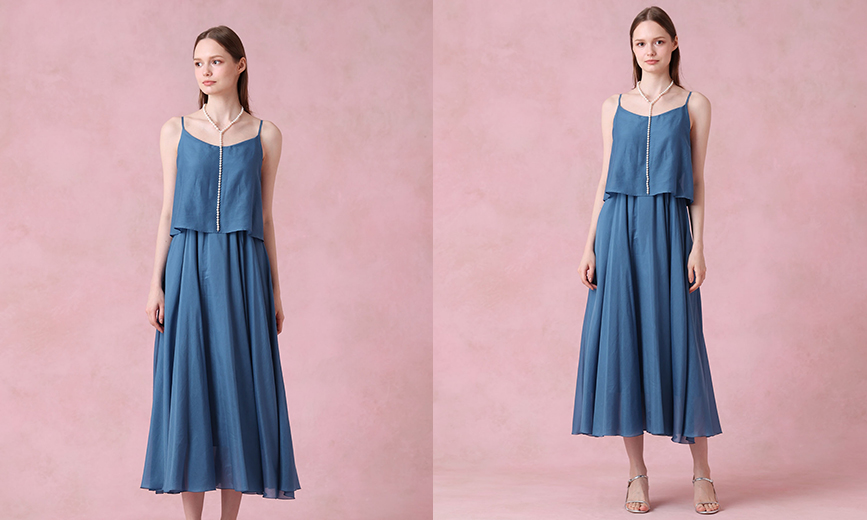 上身頃はキャミソールをレイヤードしたようなデザインで、ウエストからゆるやかに流れるスカートがエフォートレスな印象。