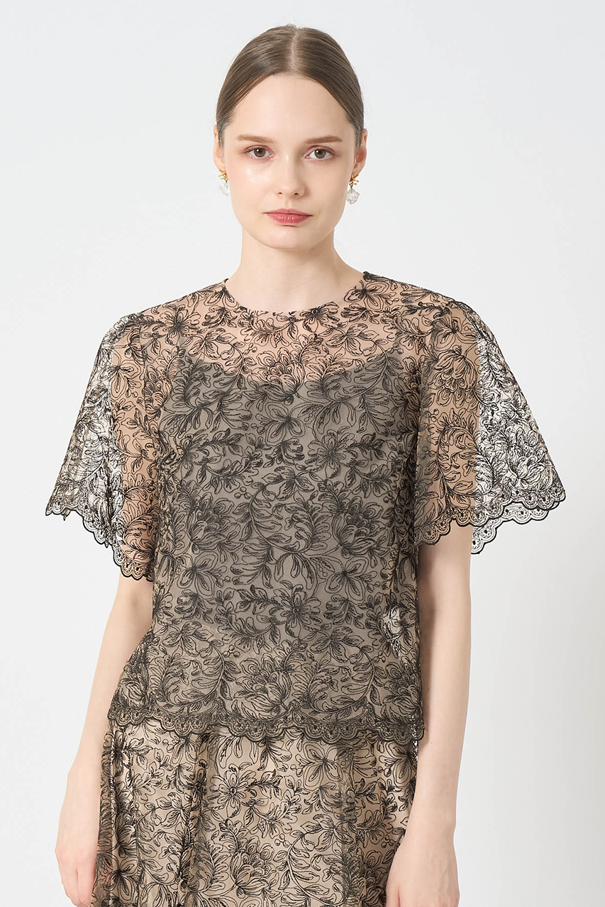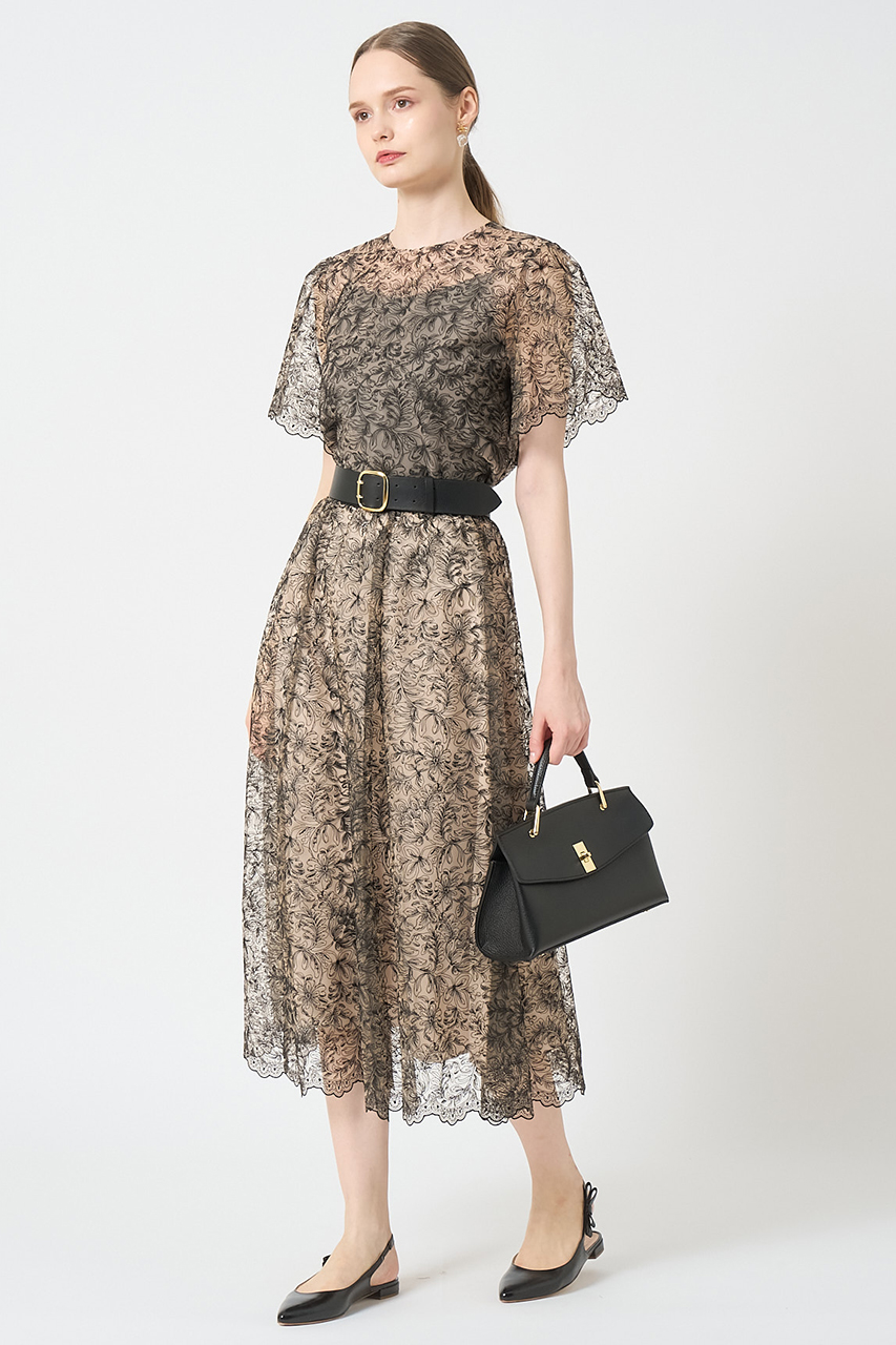 繊細なチュールにステッチで描かれたレースの模様は、糸の重なりで濃淡を表現。重くなり過ぎず軽やかな生地に仕上げています。