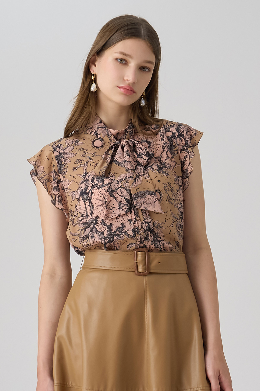 スタンドカラーに取り外しのボウタイを付けたブラウス。
