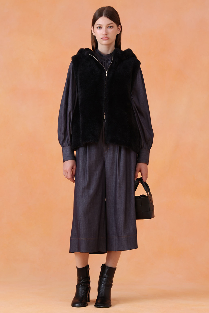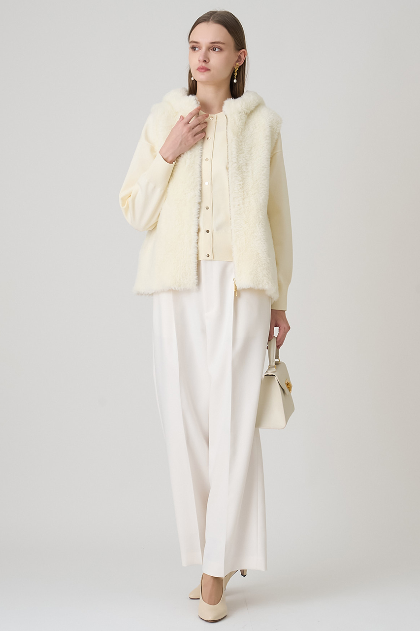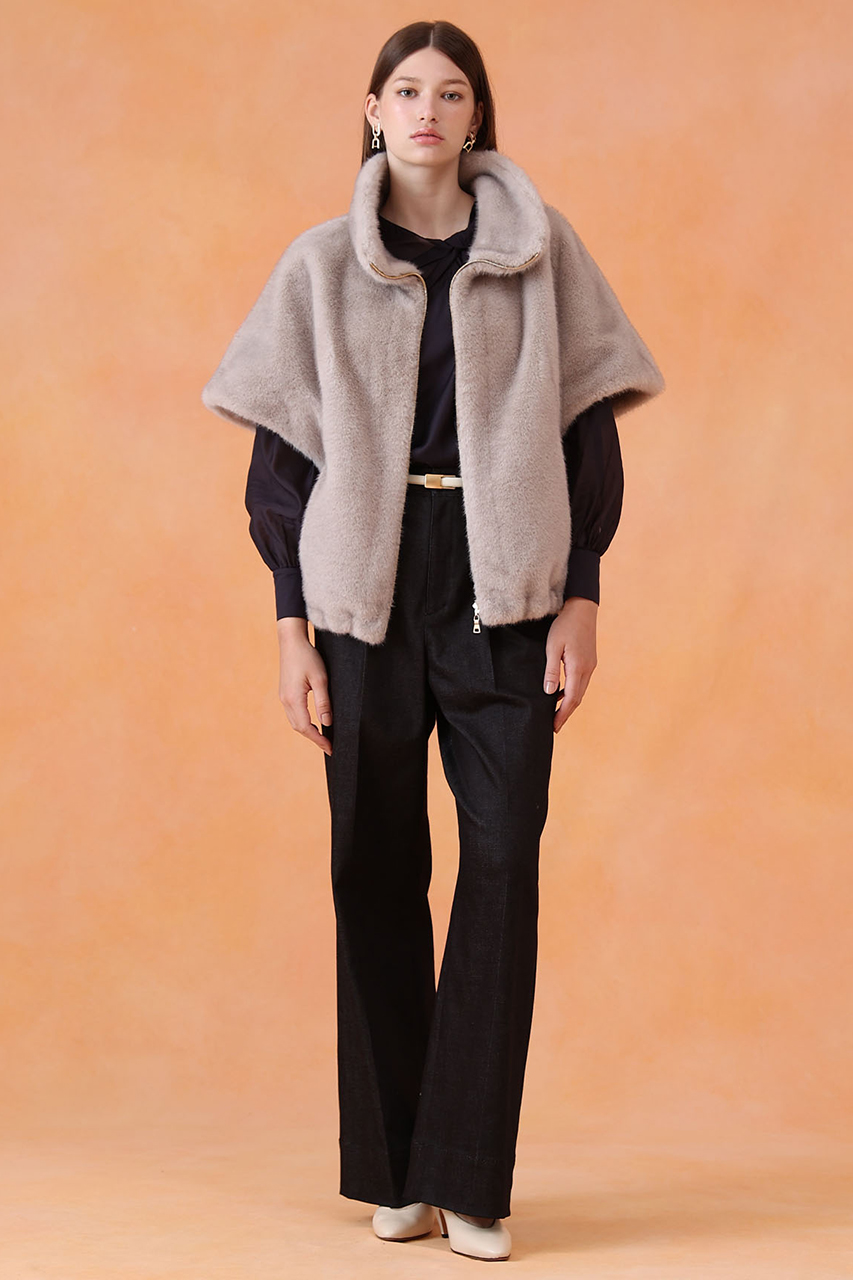 軽く、キレイ目にカジュアルダウンできるフェイクファーアイテムはスタイリングに抜け感をプラスしてくれるのでお勧めです。