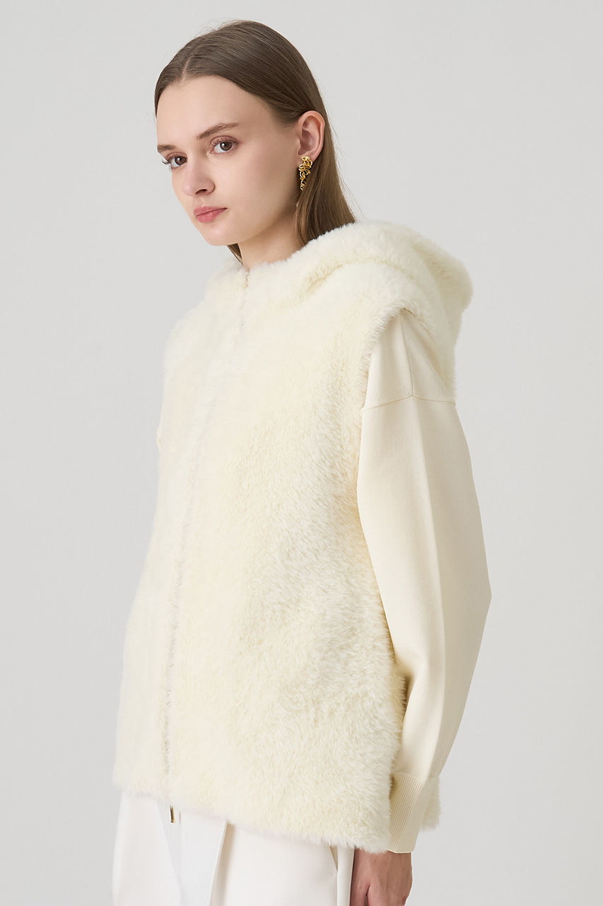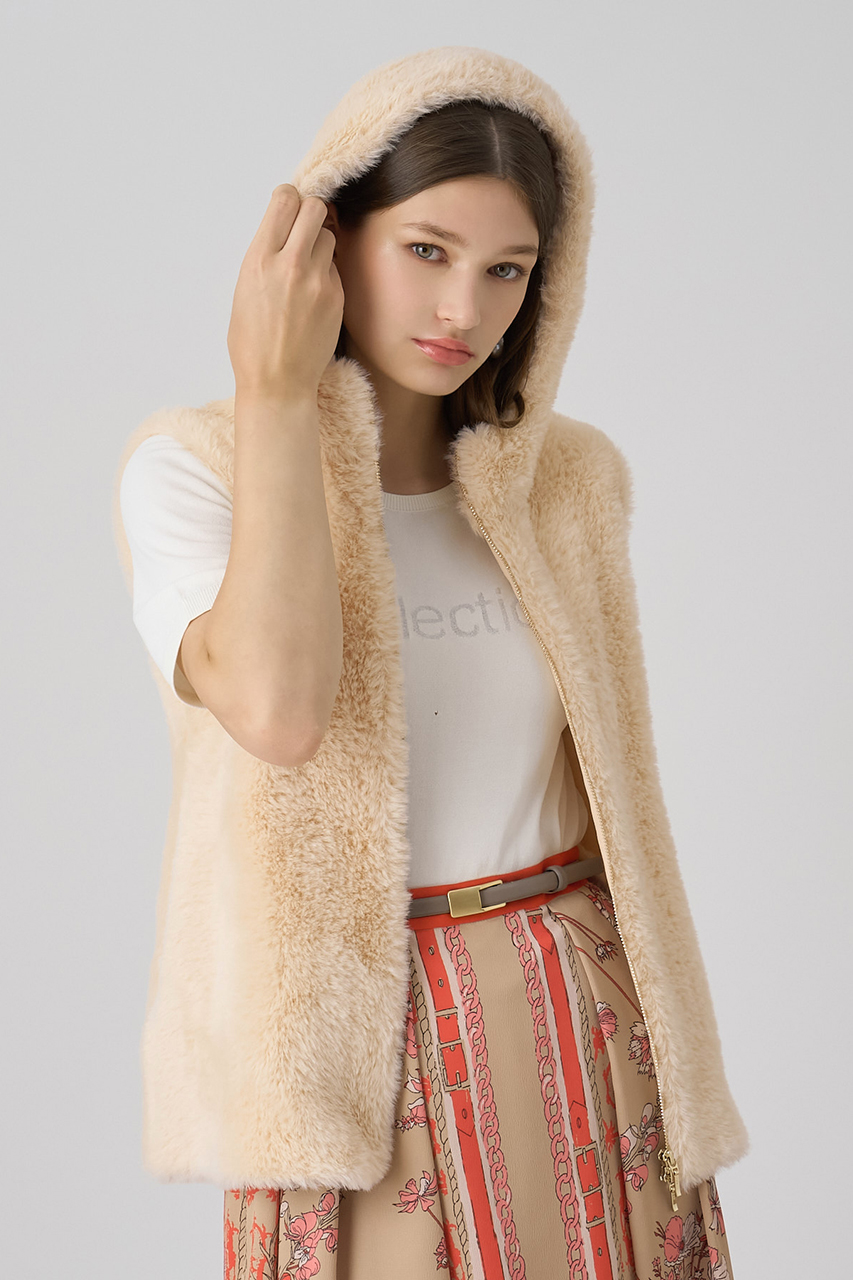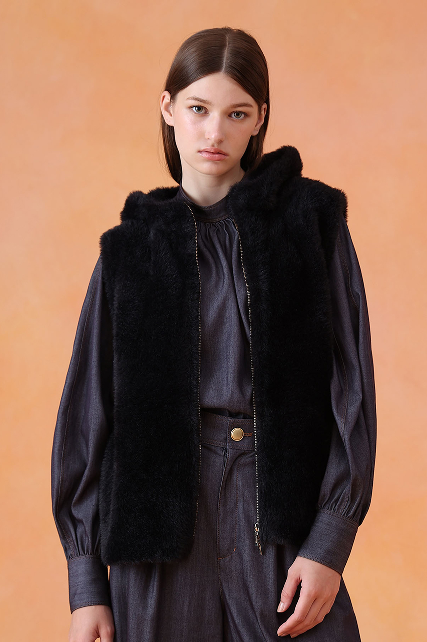 今シーズンも引き続きトレンドのファーライクアイテム。逆開きのファスナー仕様のフーディージレ。