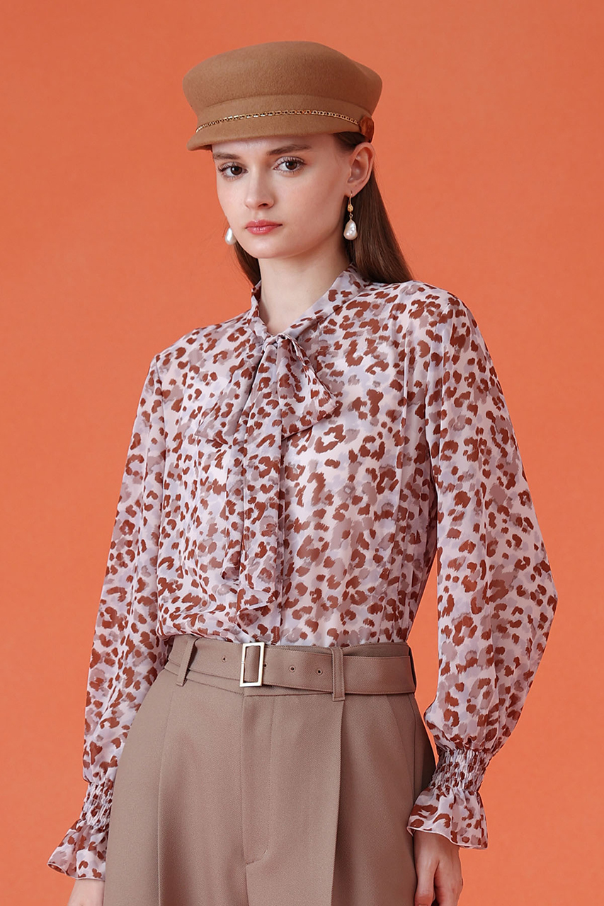 軽やかなシフォン素材を使用。優しいペールピンクをグラウンドにグレー系とブラウンのミディな色味のレオパード柄に仕上げました。