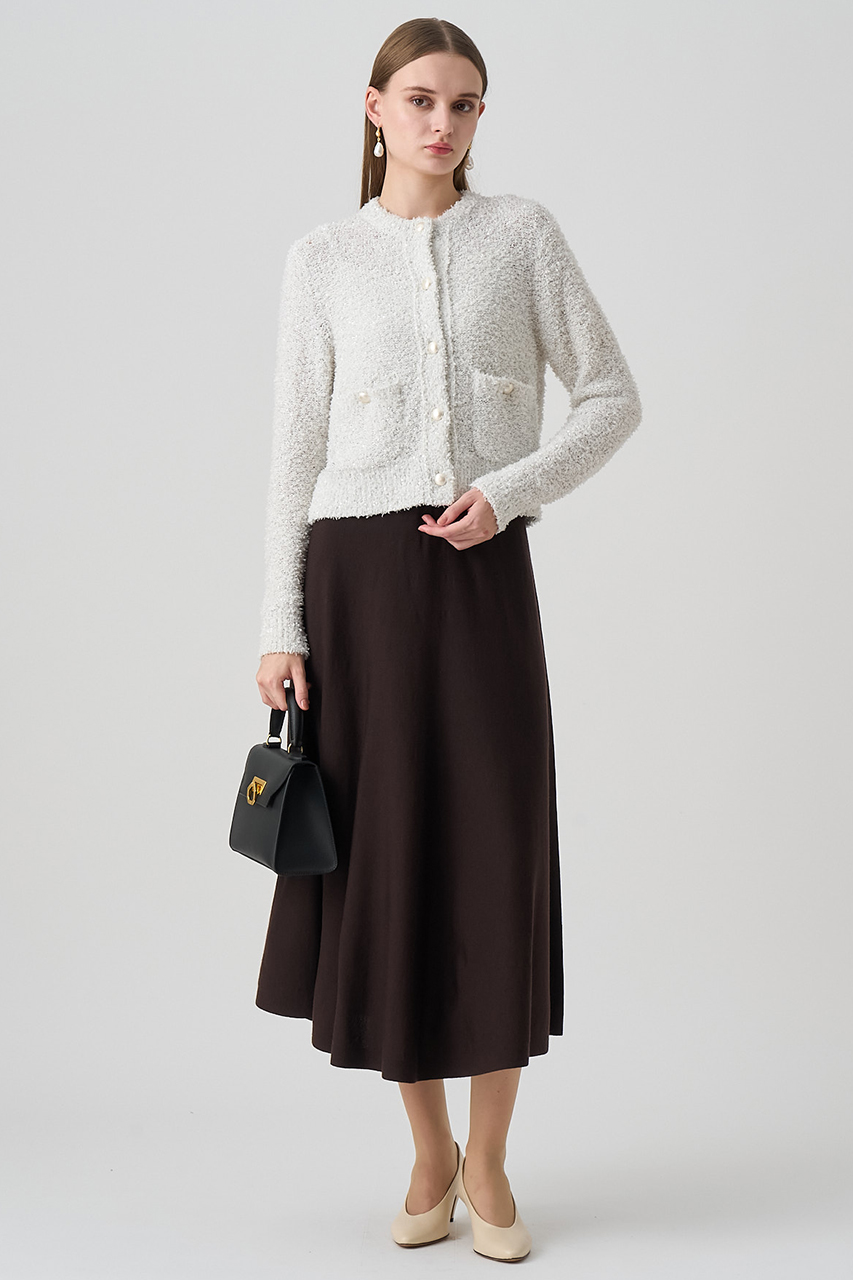 ニットをアウトしたり、ブラウスはインにしたりなど、秋らしいベーシックカラーの様々なカラーと合せやすいスカートです。