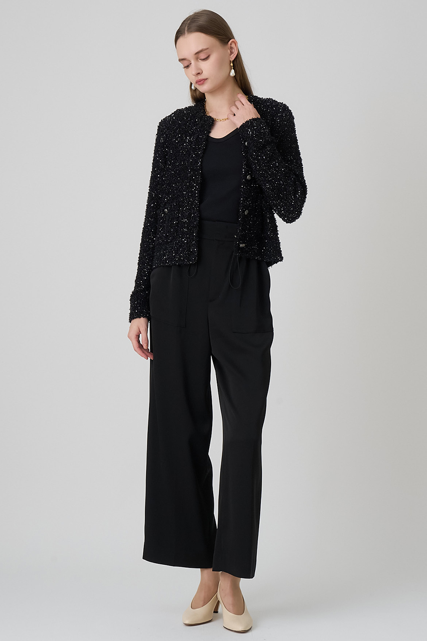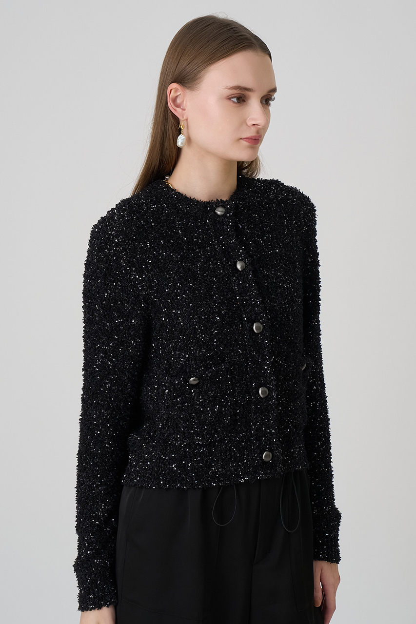 スパンコールに合わせたシルバー系のメタルボタンがポイント。