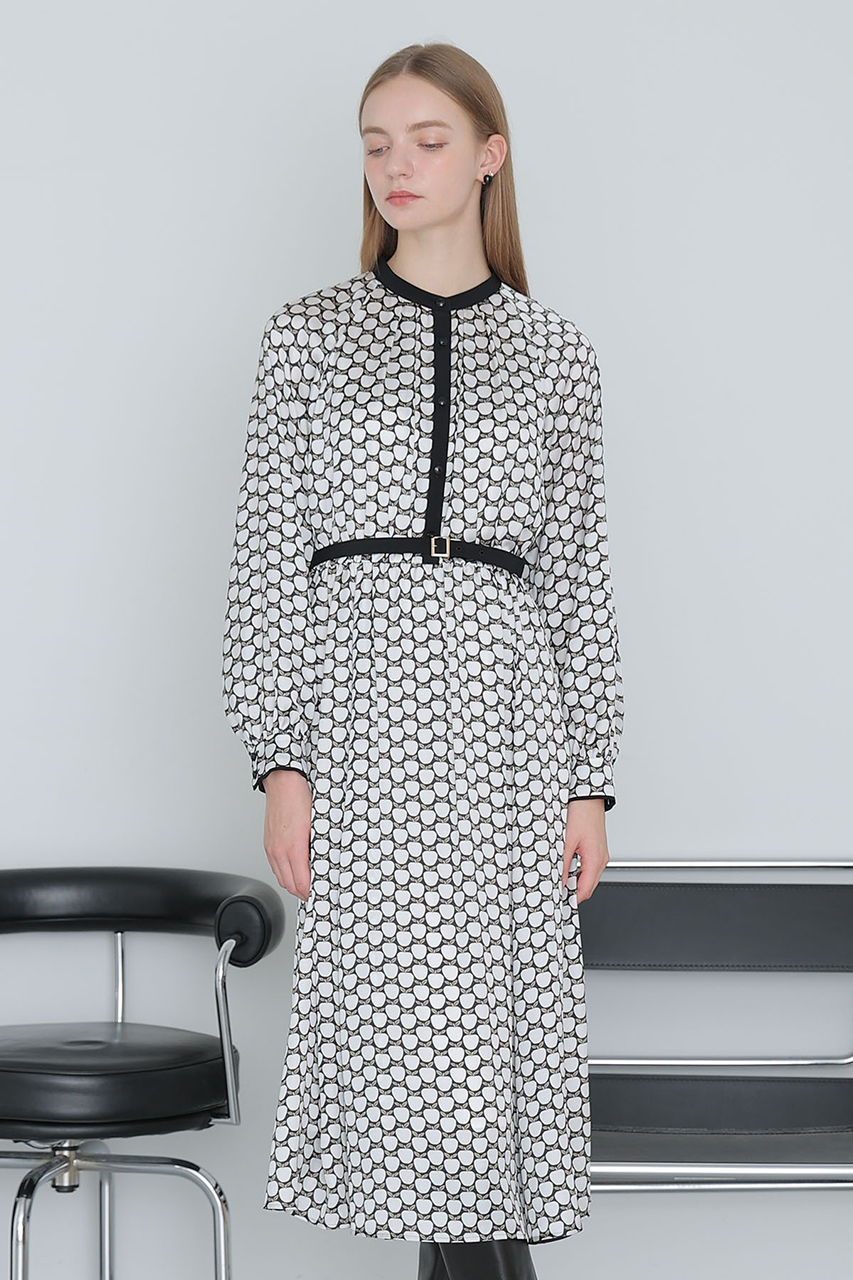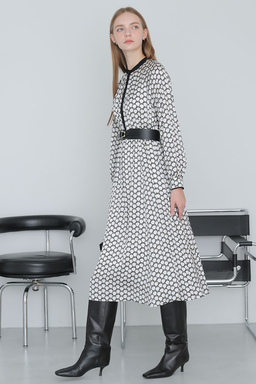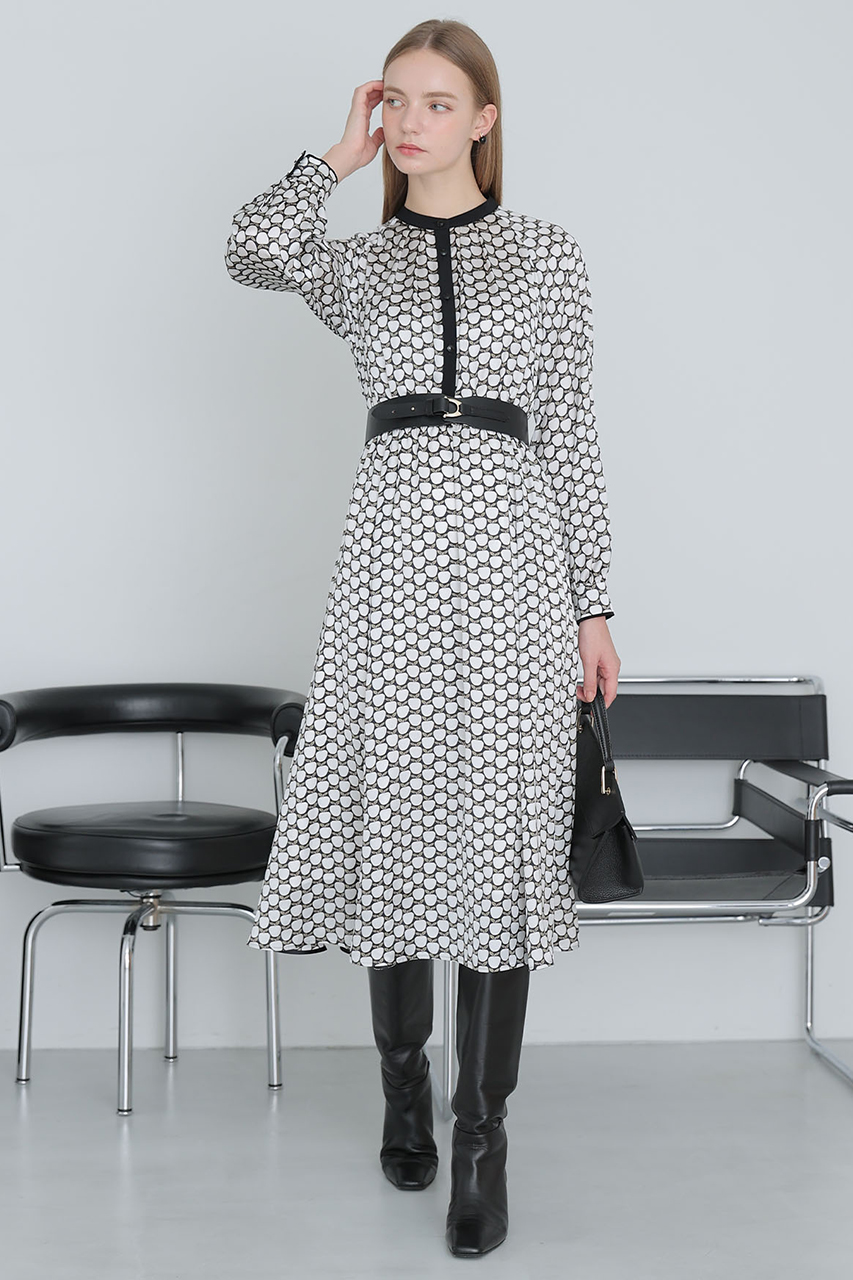 前立てとベルト、カフス先の配色使いがデザインポイントのギャザーフレアワンピースです。