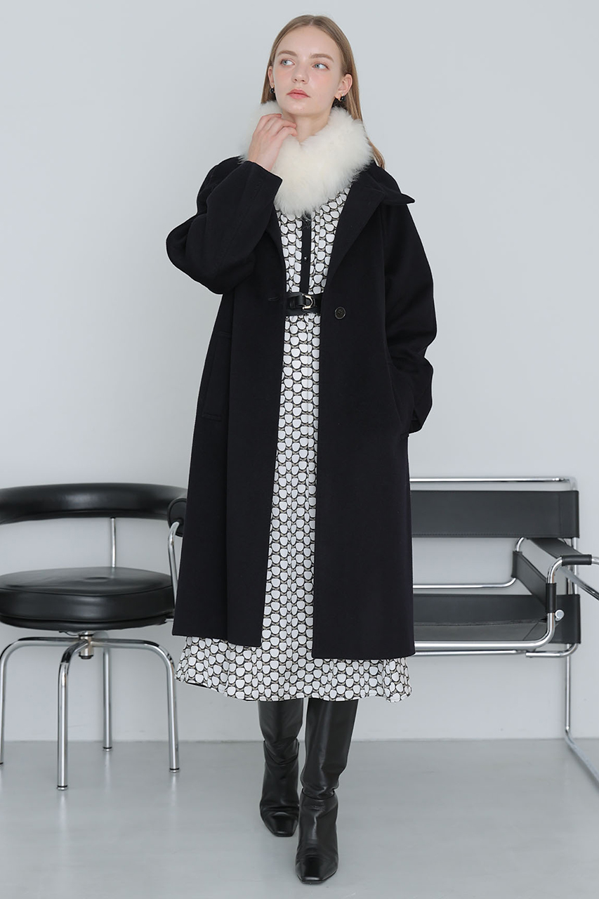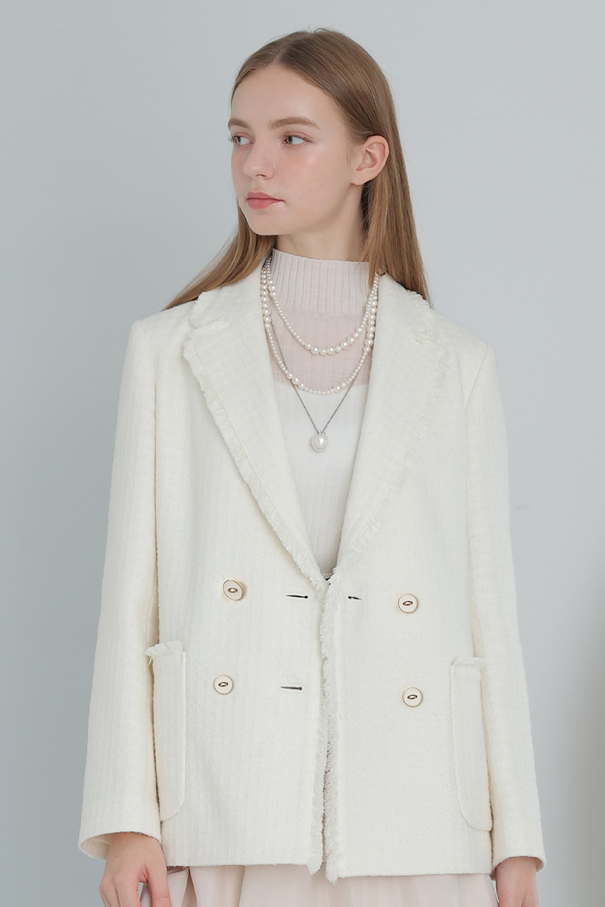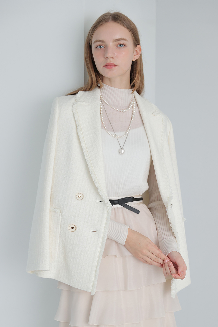 大き目な衿と前端には、オリジナルで他の糸から作られたフリンジを施して、顔回りを華やかに演出します。
