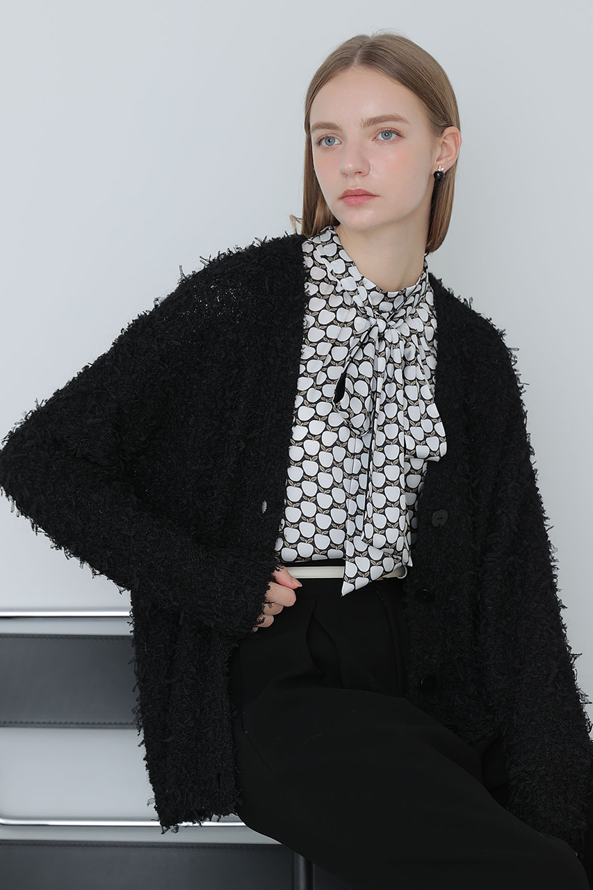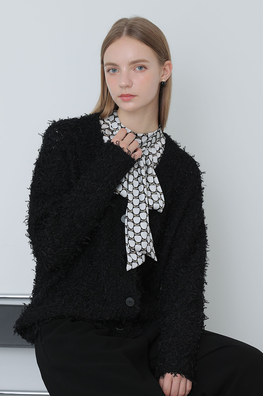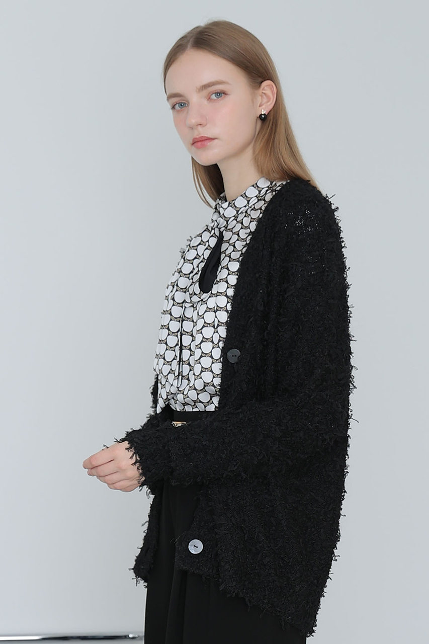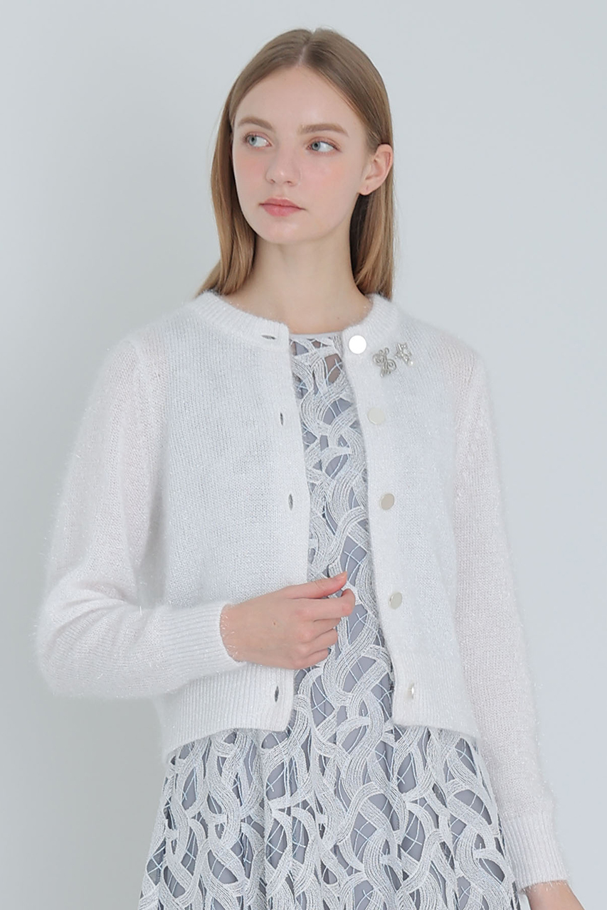 1枚羽織るだけでインパクトのあるラメフィルムのシャギーカーディガン。