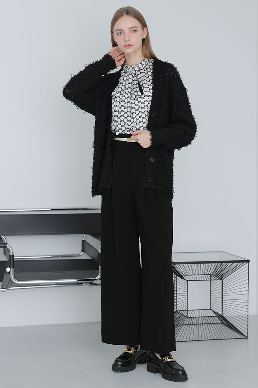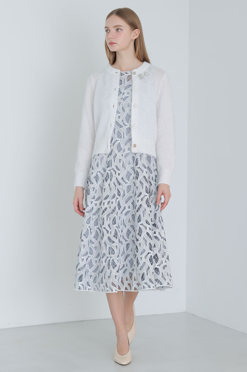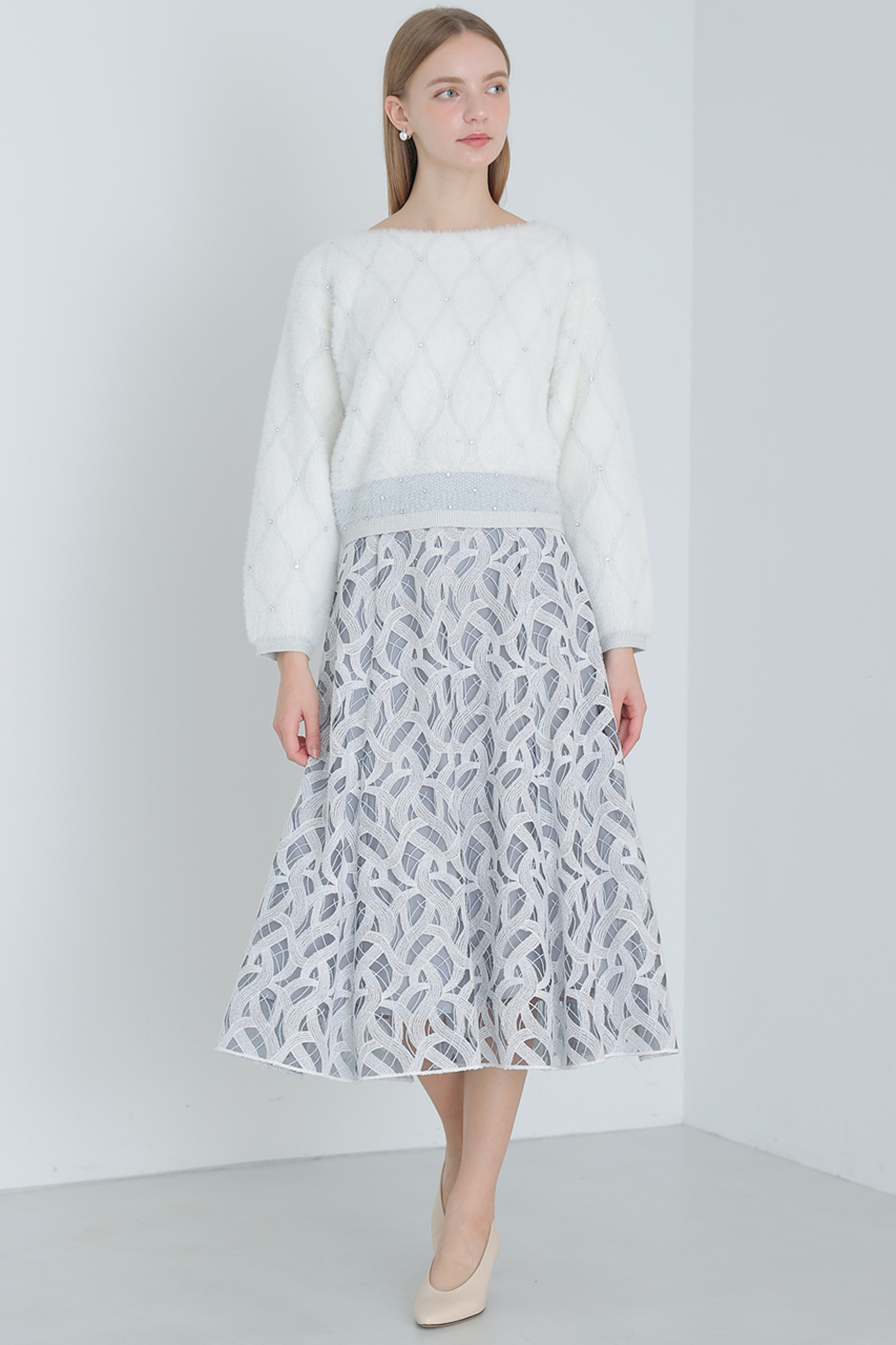 ストレッチ糸を引き揃えながらのジャガード編み(繊細なフェザーヤーンをファーの様に密集させて編む)のため重くなりがちなところ、今シーズンは試作を重ね軽い仕上がりを実現しました。