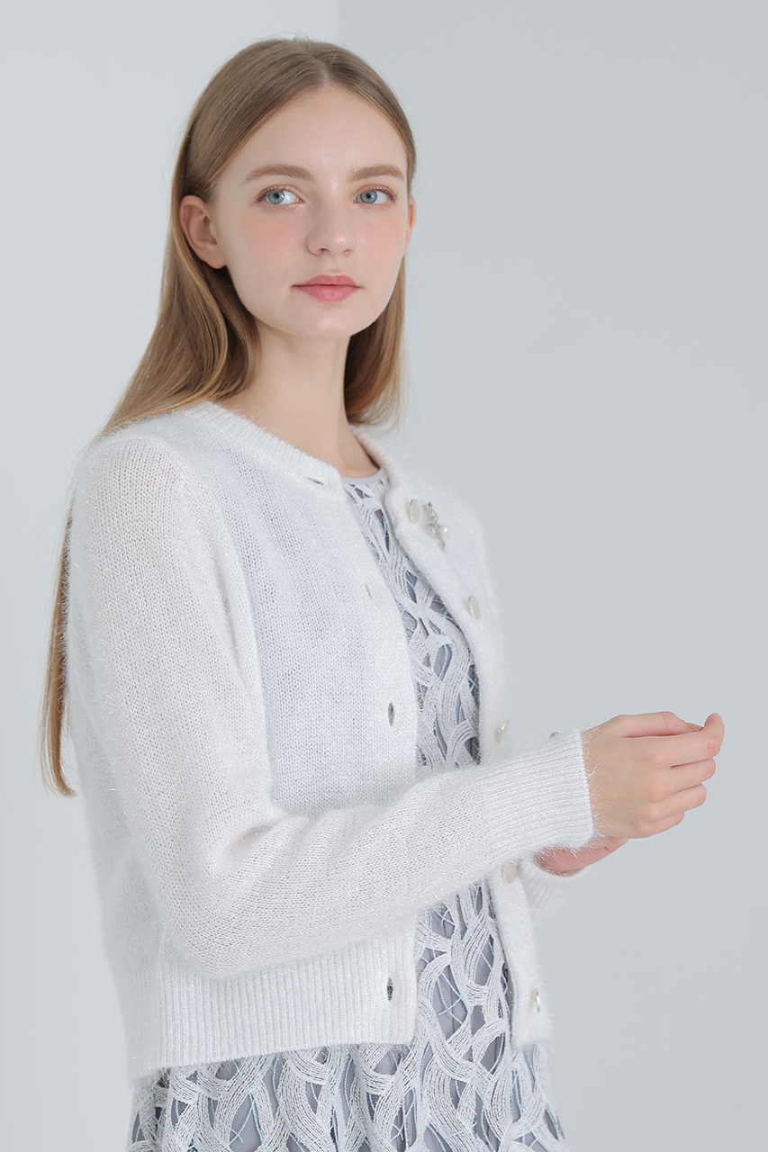 形はベーシックなクルーネックカーディガンで、ワンピースの羽織りとしてや、前を留めてプルオーバーのように着こなして。メタルボタンがポイントです。