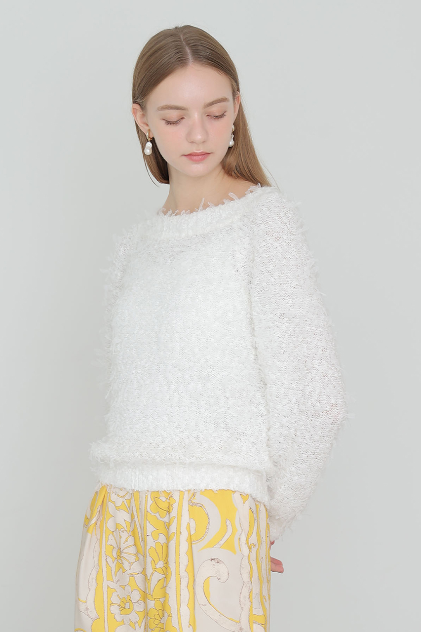 チュールモールとモヘアを編み込んだ新しいシャギーの編地です。チュールを割いたようなニット糸とキッドモヘアの組み合わせ。