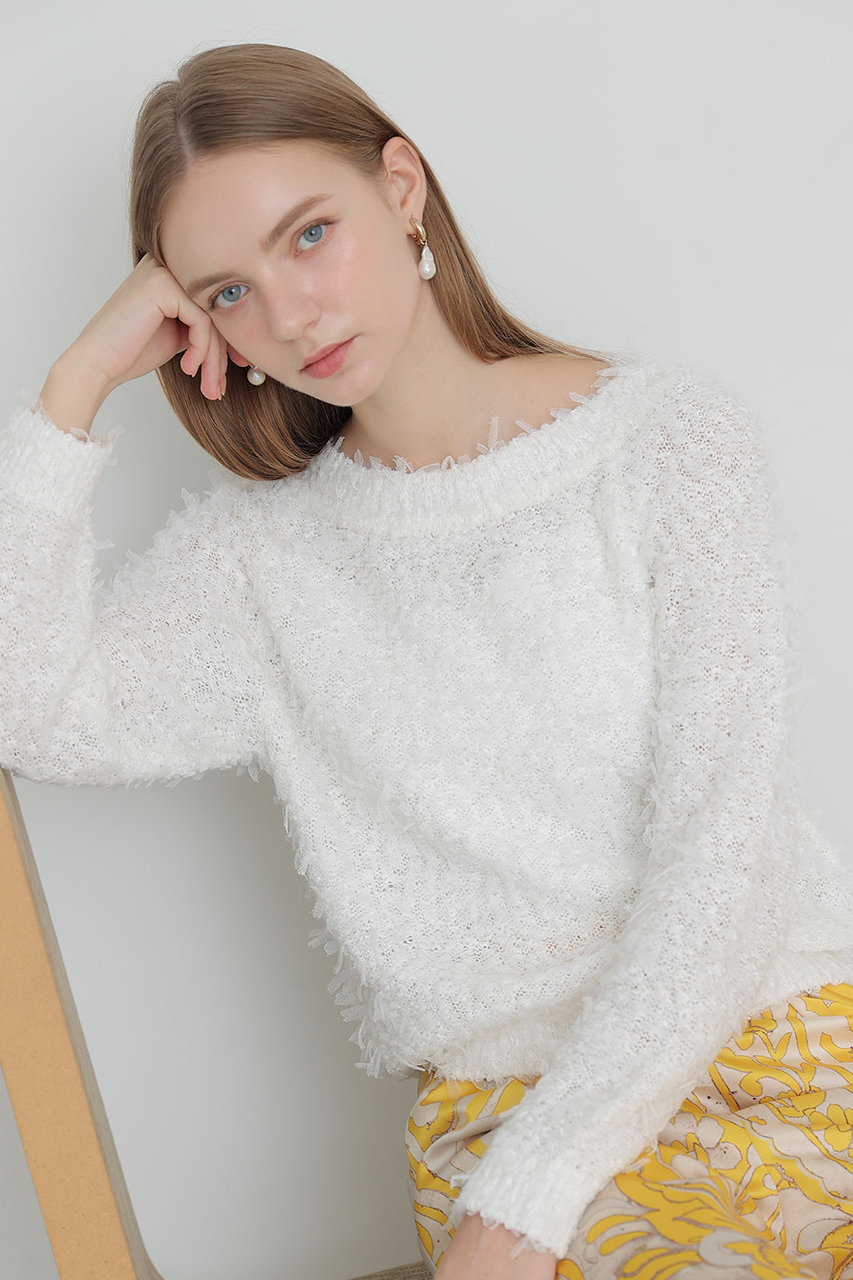 広めなボートネックプルオーバーは気分でオフショルダーのようにも着用可能。