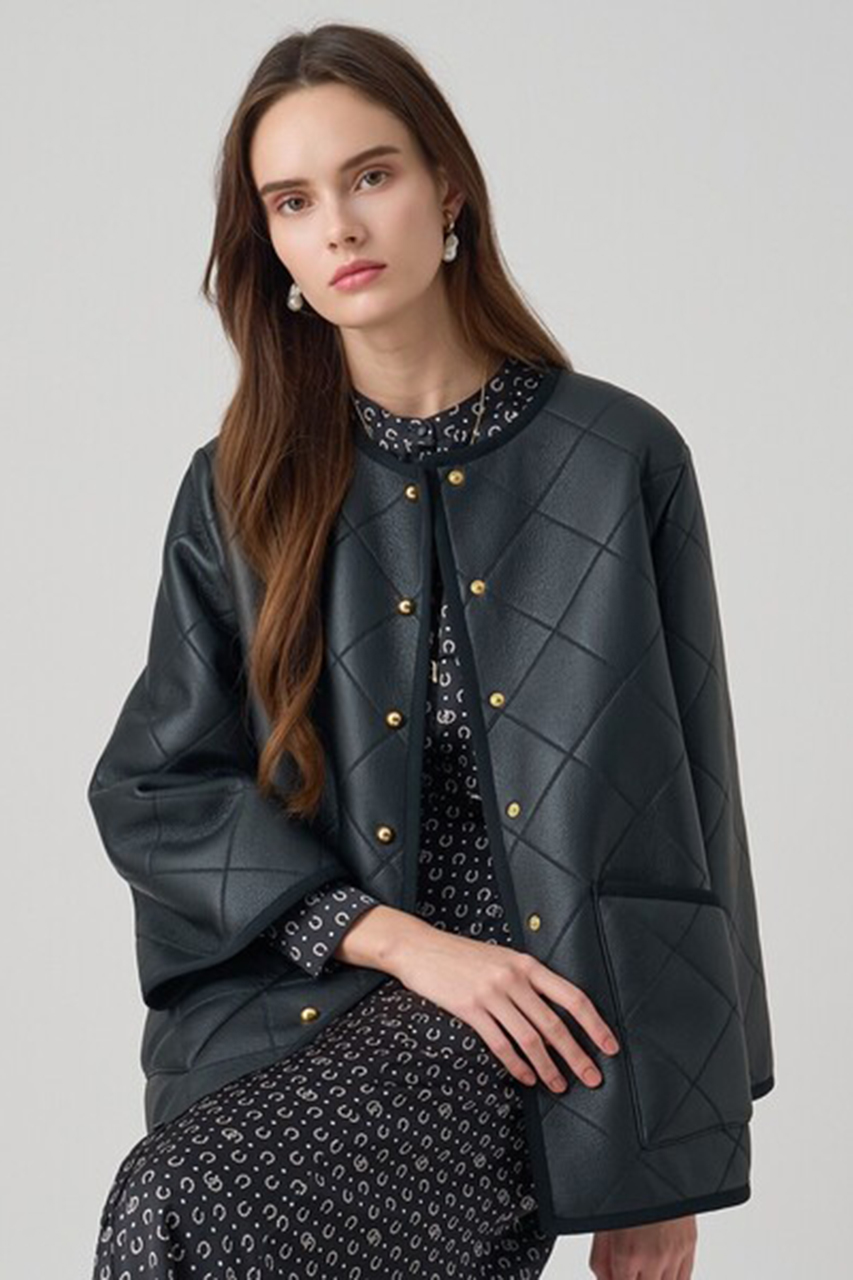 艶のあるフェイクレザーと、柔らかいボアをボンディングし、上からキルト加工を施したハーフコート。