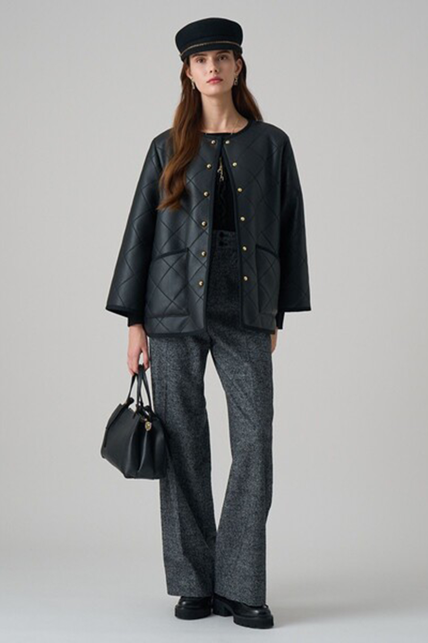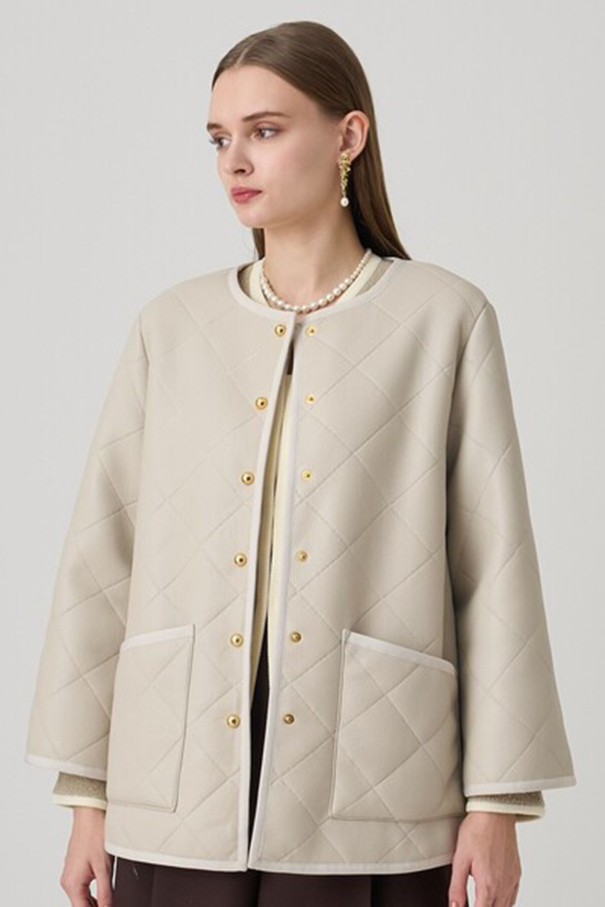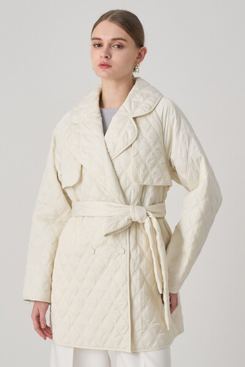 テーラー衿やフラップディテールを落とし込んだトレンチライクなキルティングコート。