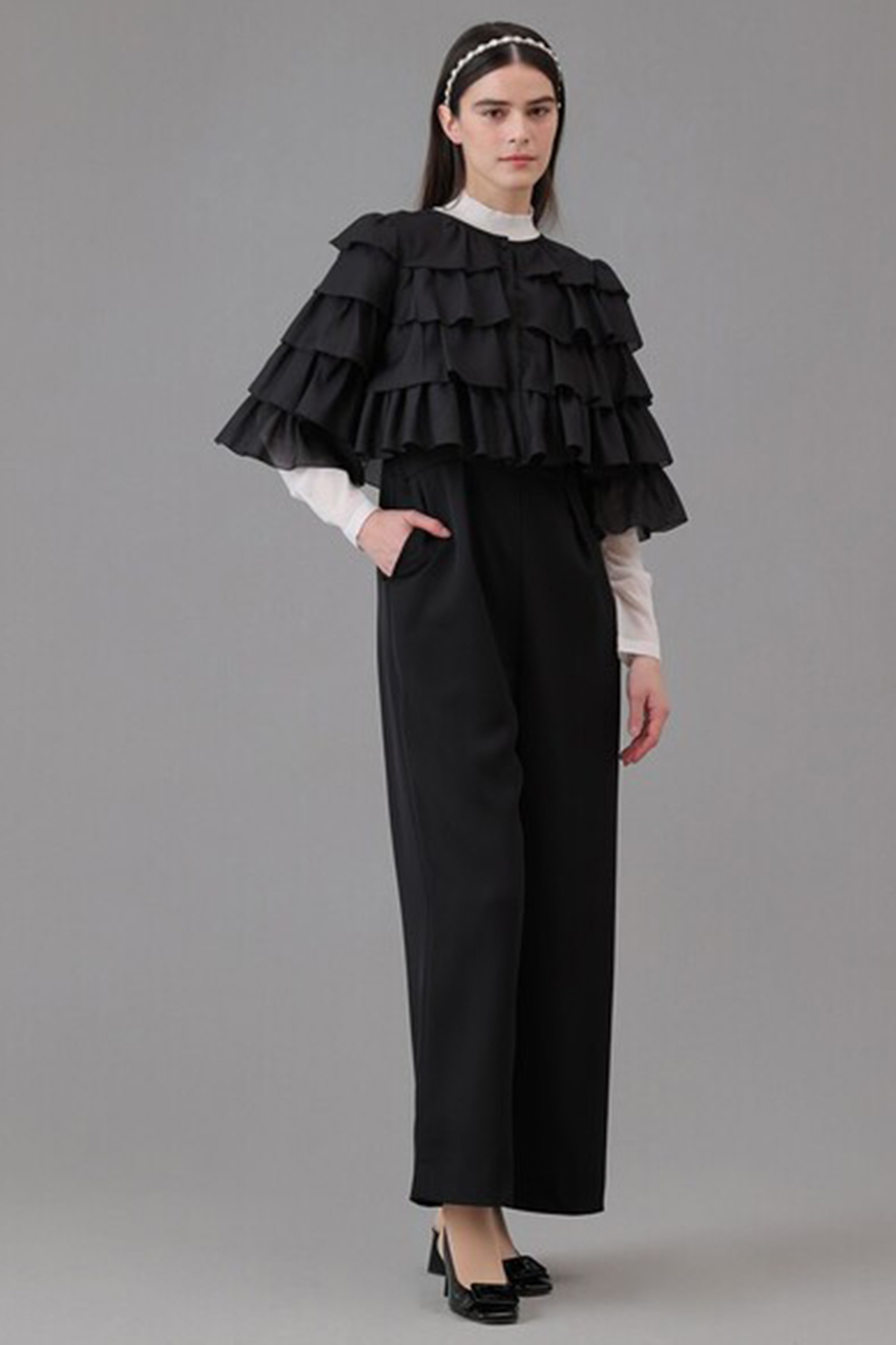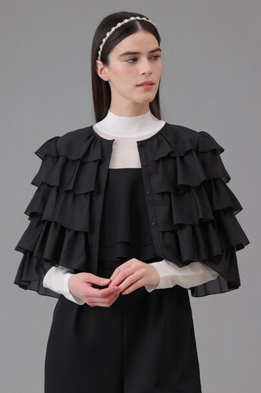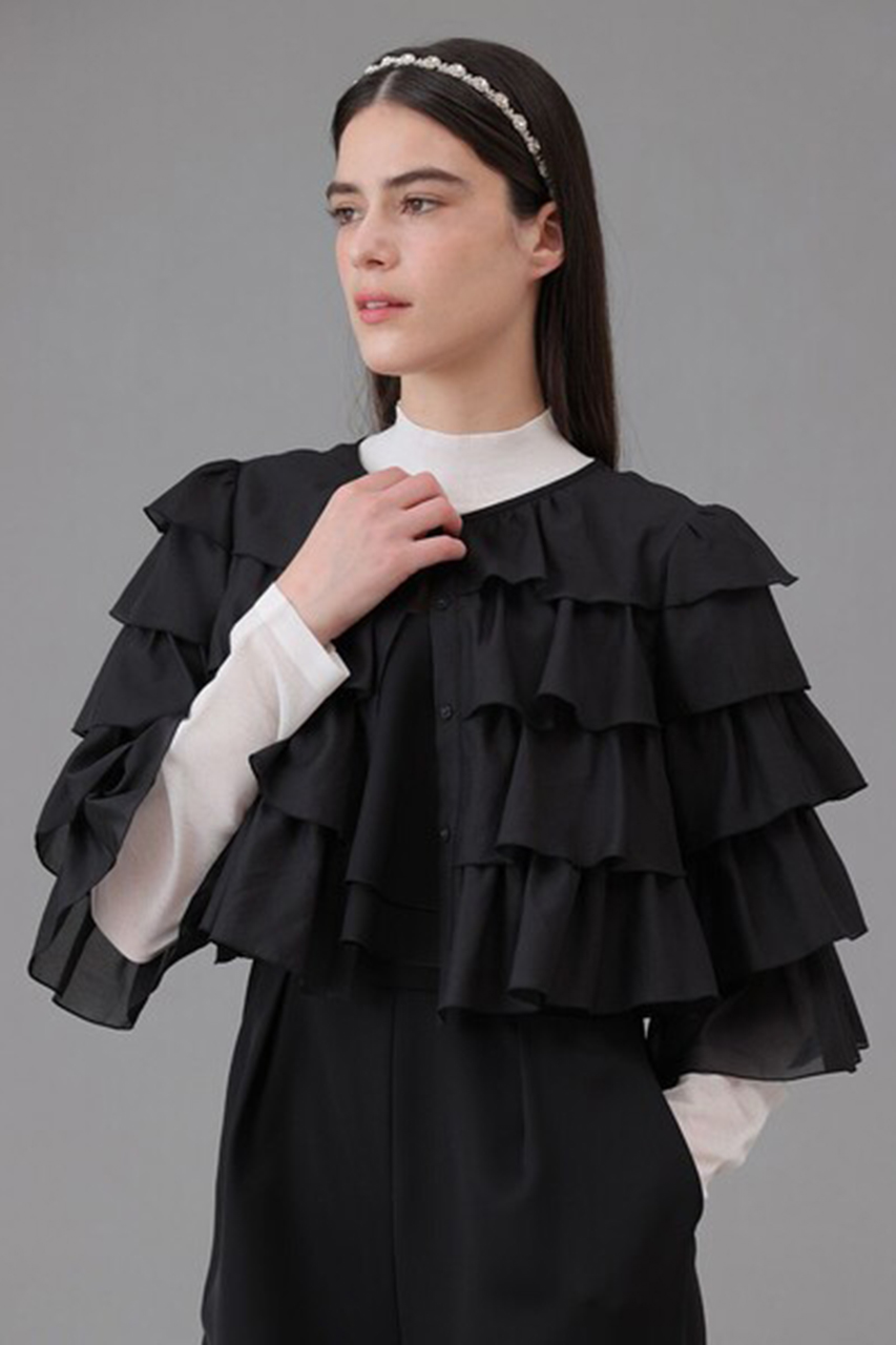 短丈なので前開き、または第一釦のみ留めて頂いてシンプルなワンピースの上にボレロとしても好相性。