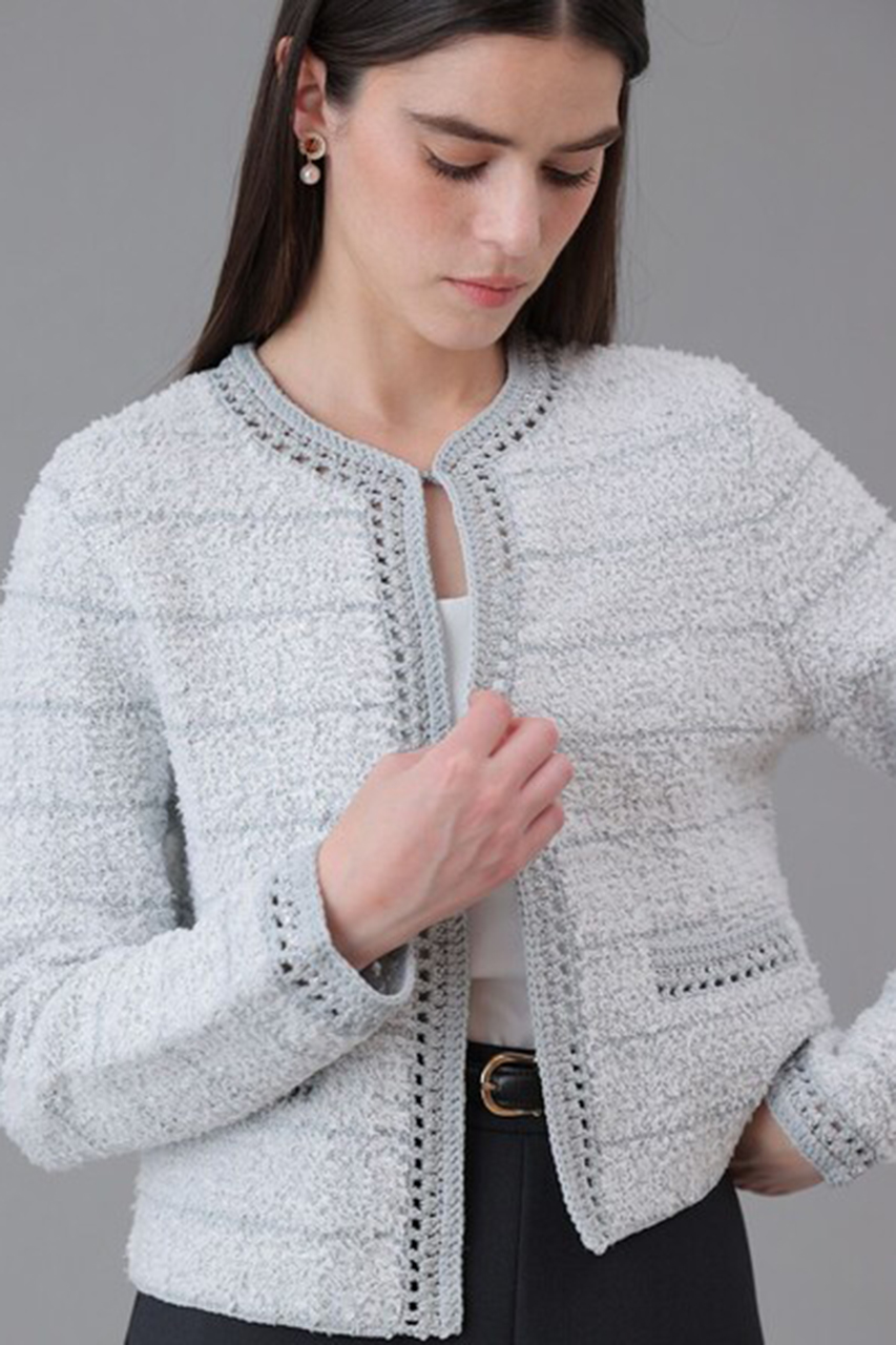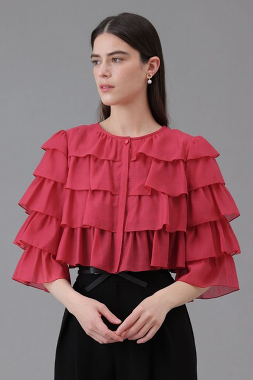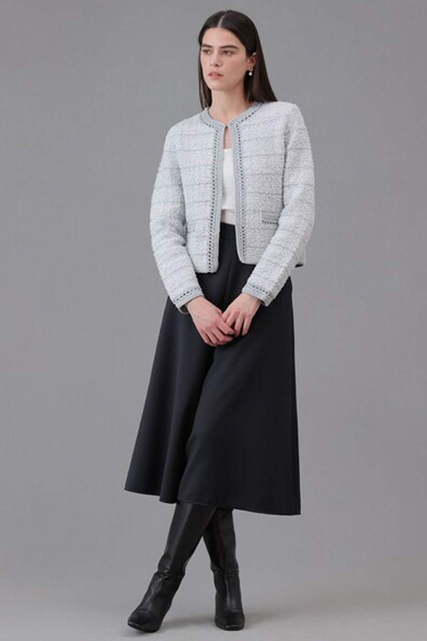 短丈なので前開き、または第一釦のみ留めて頂いてシンプルなワンピースの上にボレロとしても好相性。