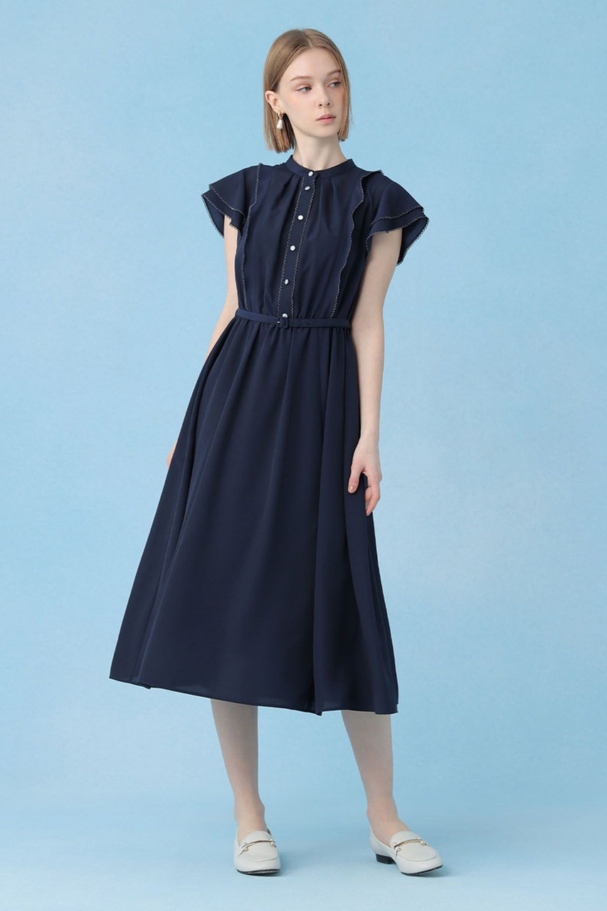 スカラ刺繍を袖や上身頃にあしらったフレンチスリーブのワンピース。