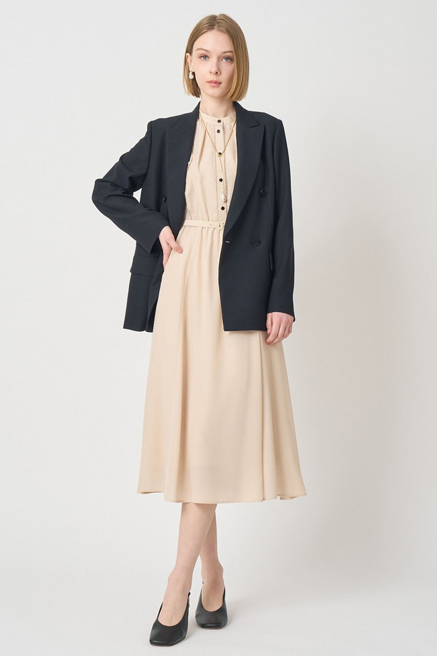 光沢のあるトップ釦がポイントに。ジャガードのちょうど良い肉感とハリ感で1枚で完結する春にぴったりなワンピースです。