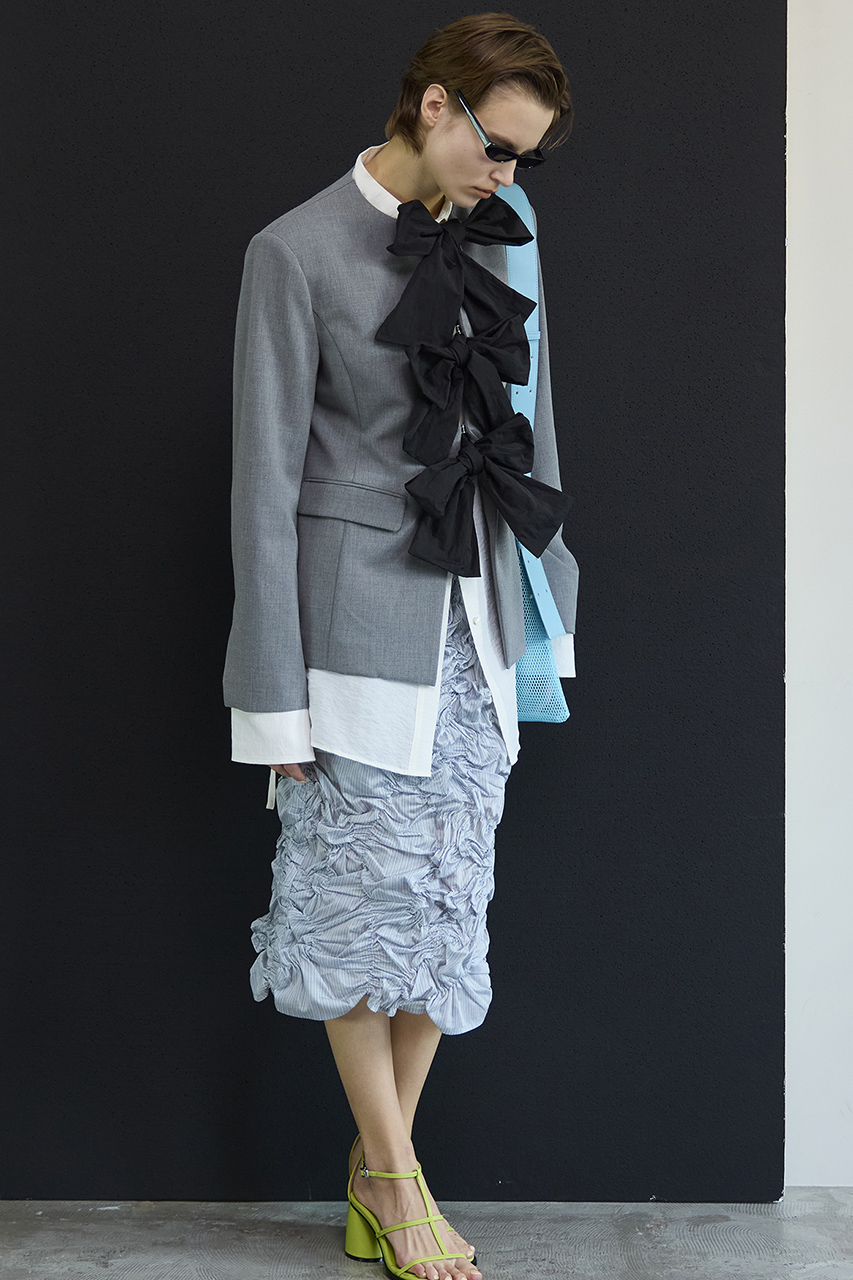 リボンの結び方で表情が変わる2WAYデザインだから、気分やスタイリングに合わせて、自在な着こなしが楽しめるのも魅力。セレモニーシーズンにもぴったりな一着。