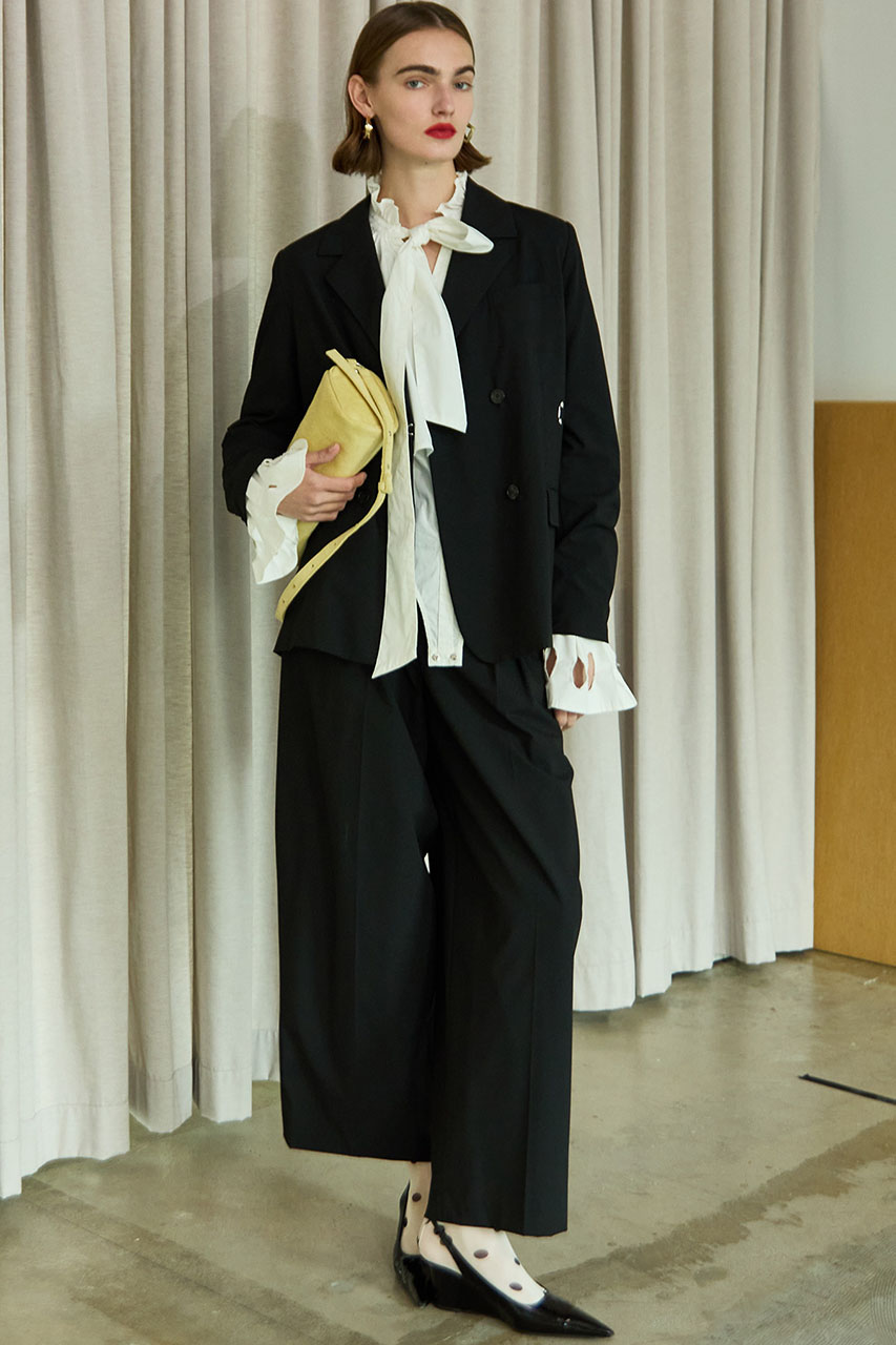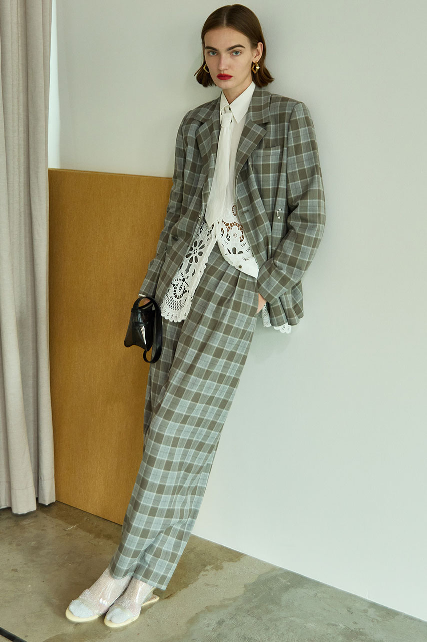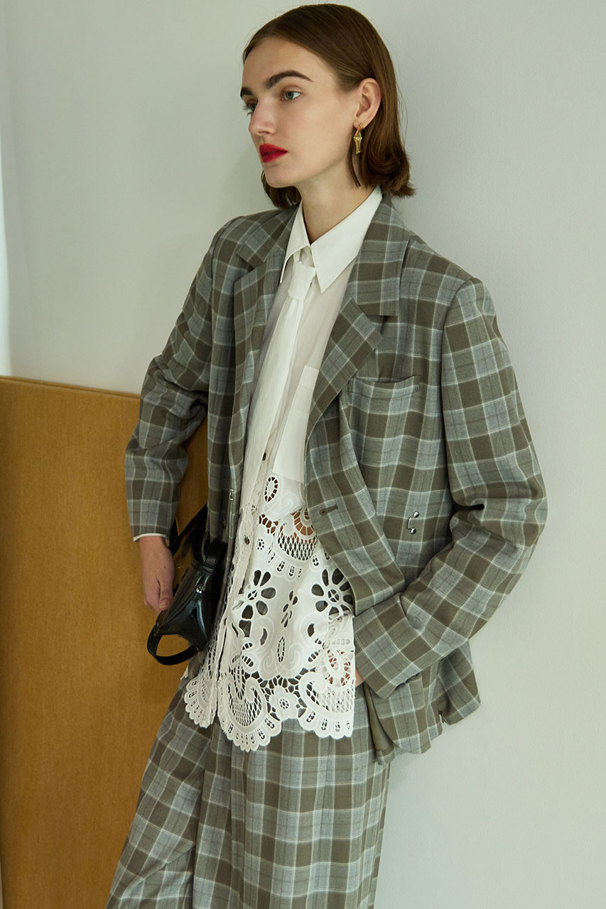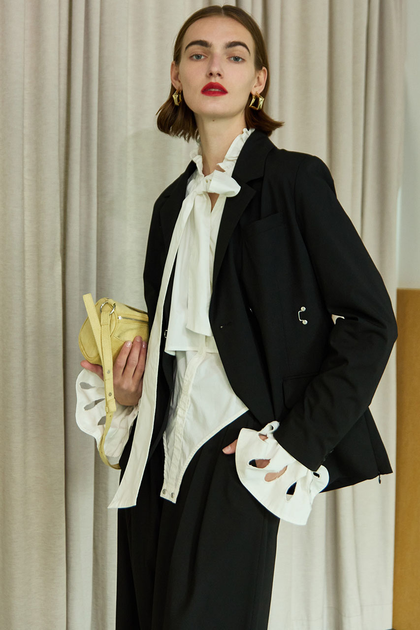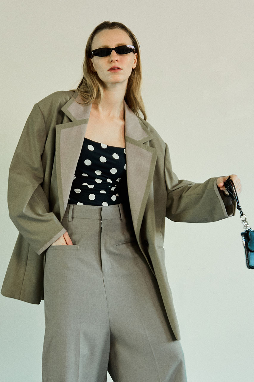 バックにはプリーツを施し、フェミニンな要素をマニッシュなテーラードに融合。1枚で着こなしの幅を広げてくれる、今季注目のアイテム。