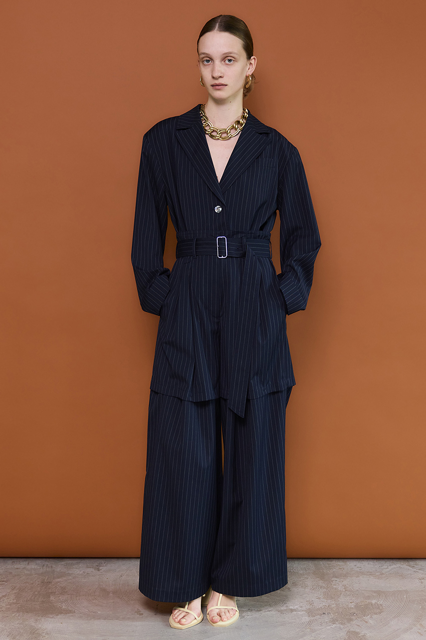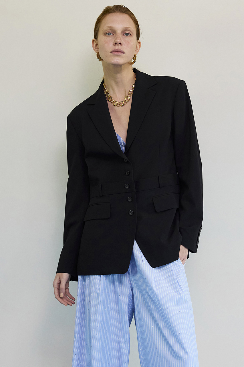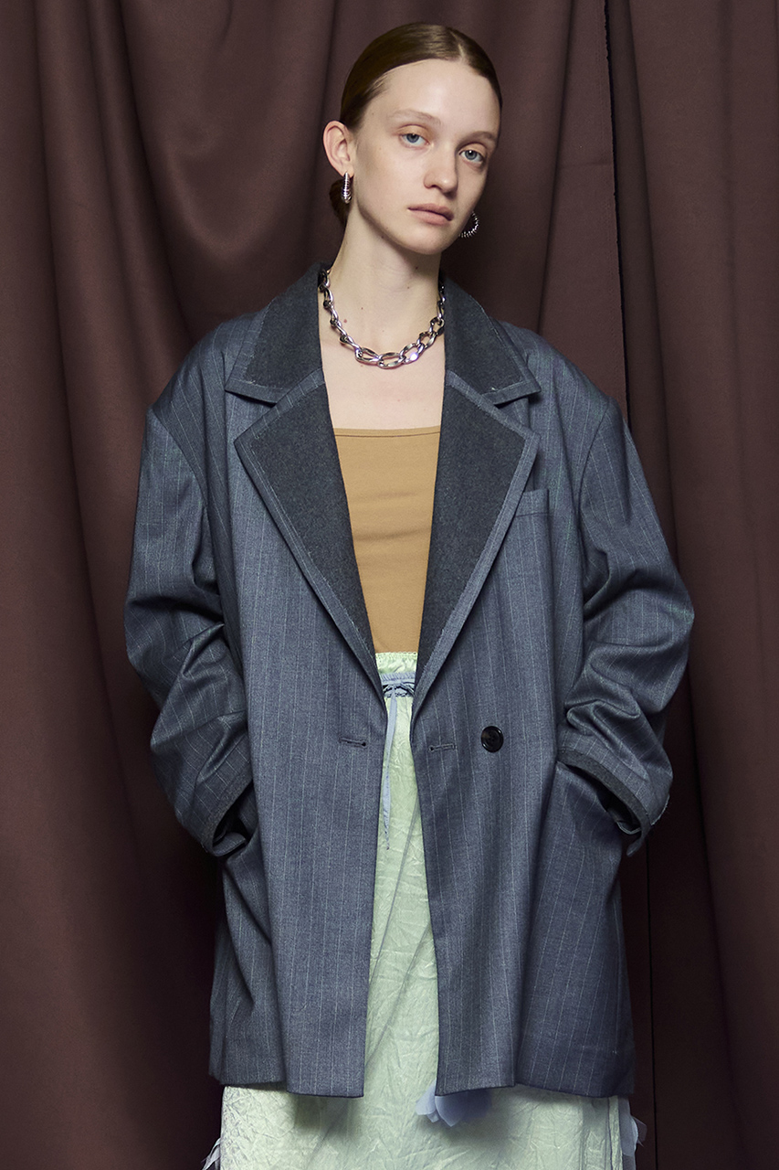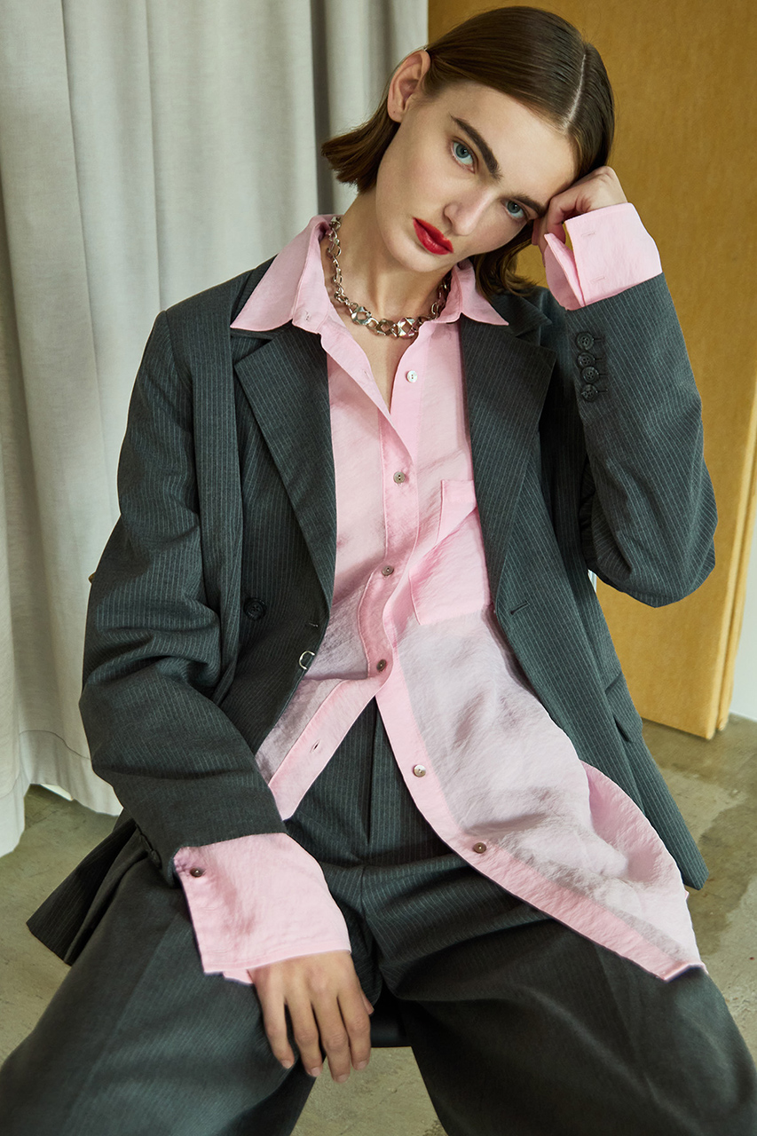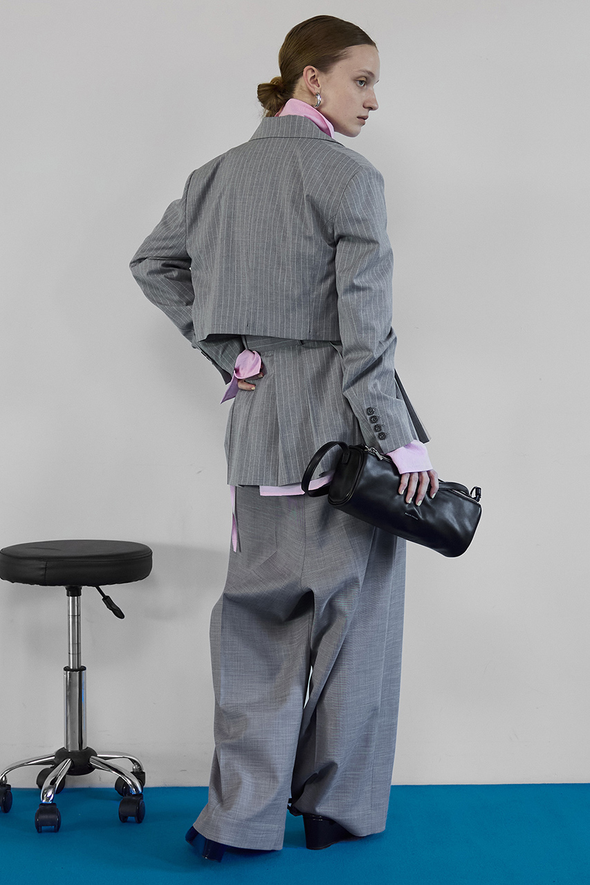 バックにはプリーツを施し、フェミニンな要素をマニッシュなテーラードに融合。1枚で着こなしの幅を広げてくれる、今季注目のアイテム。