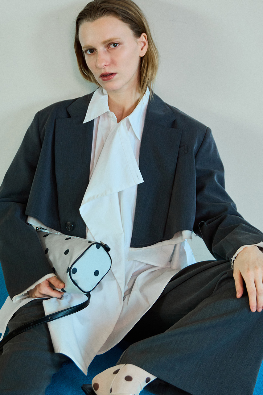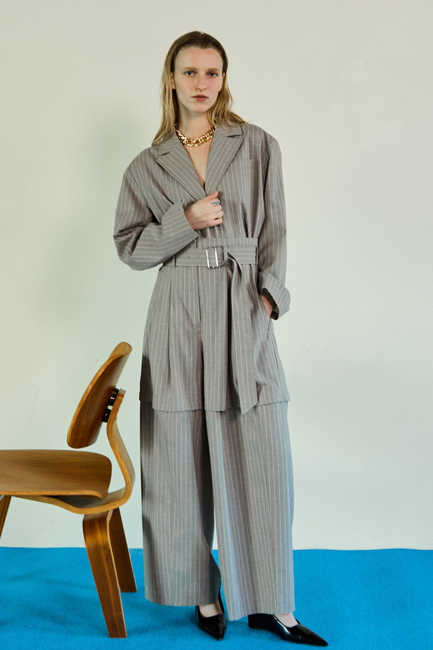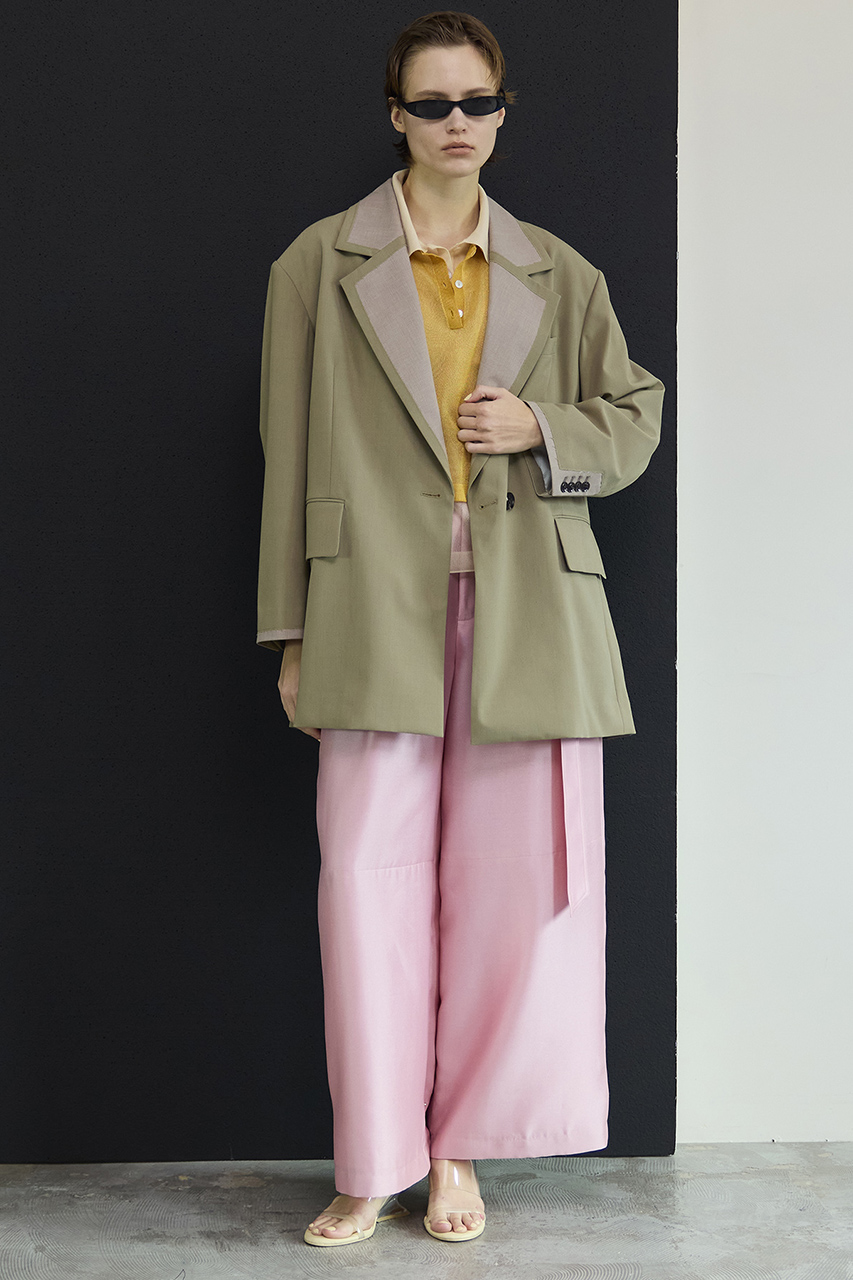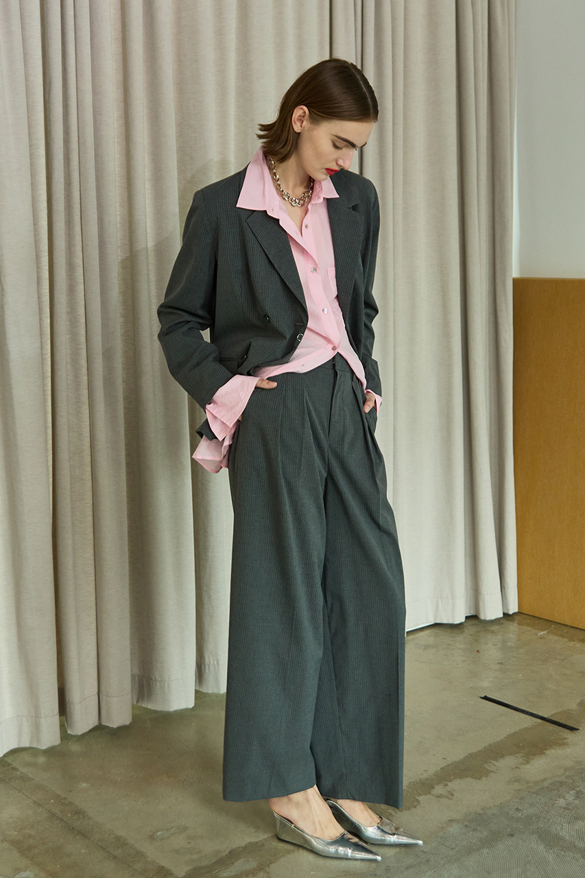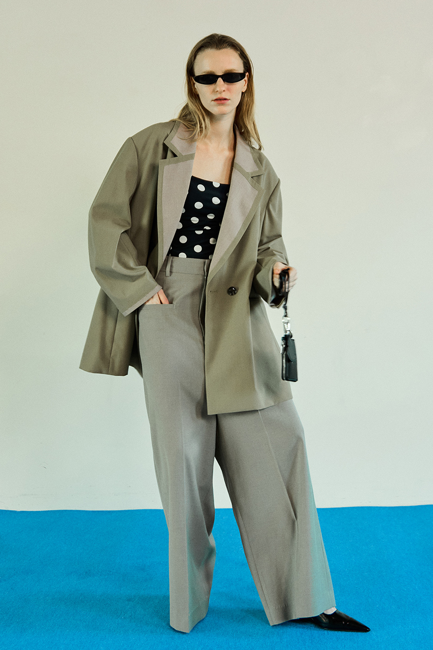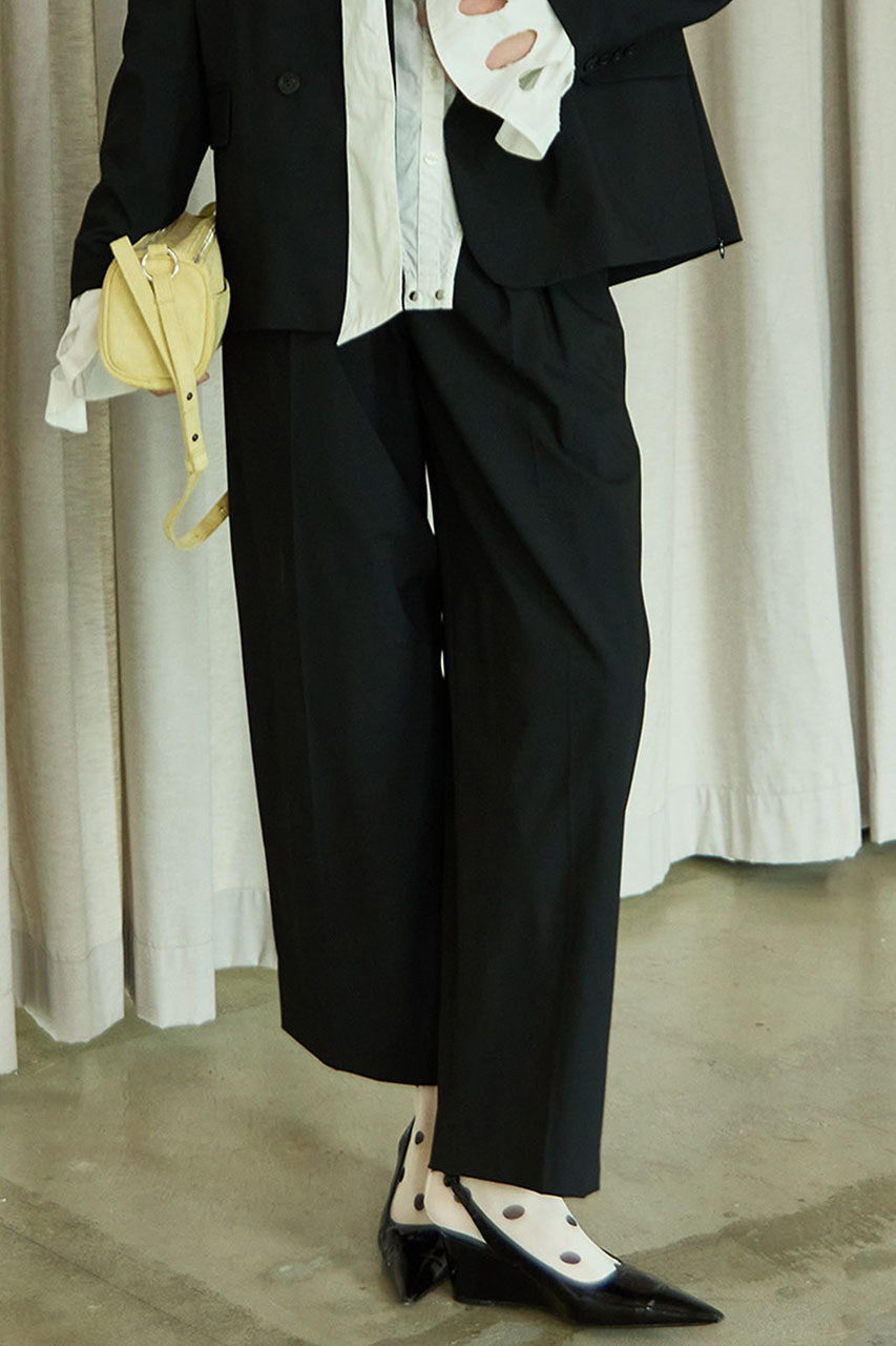バックにはプリーツを施し、フェミニンな要素をマニッシュなテーラードに融合。1枚で着こなしの幅を広げてくれる、今季注目のアイテム。