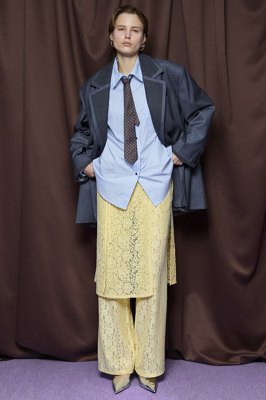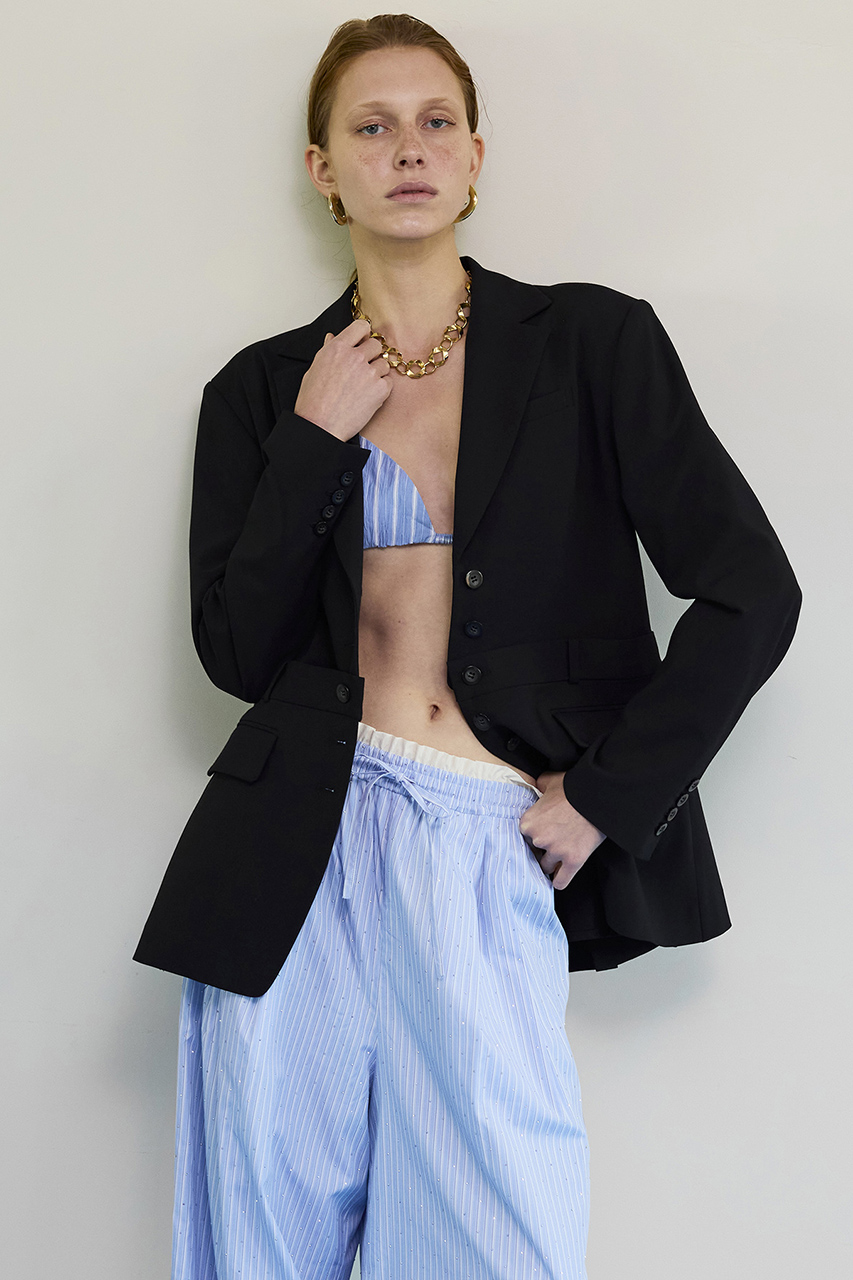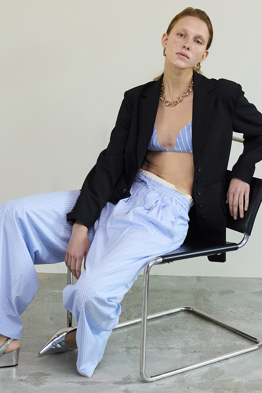Tシャツやスニーカーを合わせればデイリーに、シアーインナーやアクセでドレスアップすればナイトシーンにも対応。組み合わせ次第で幅広い表情を見せる万能な一枚。