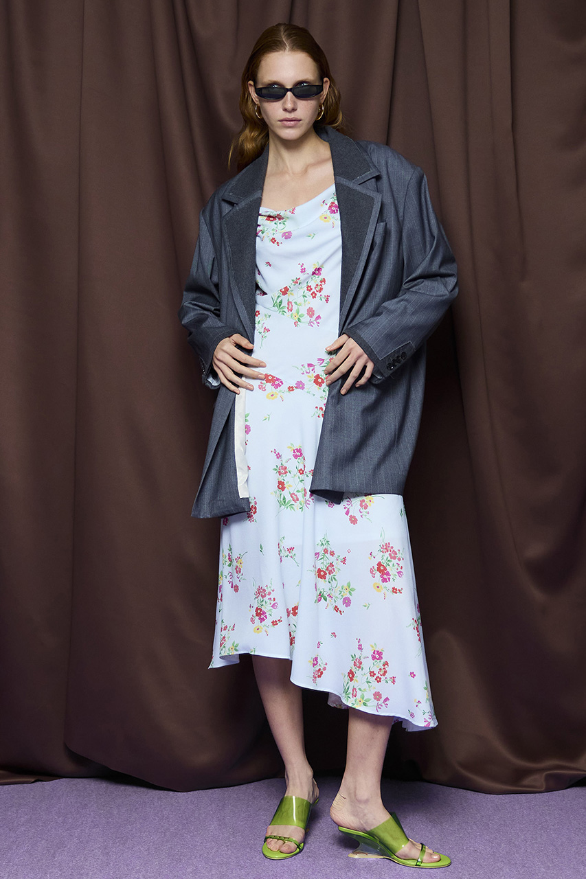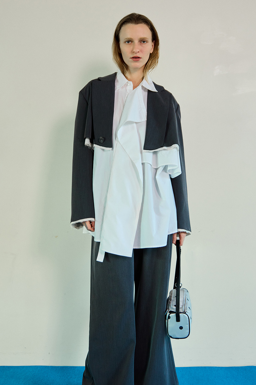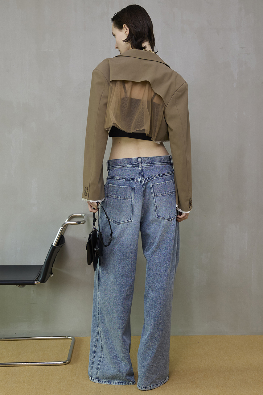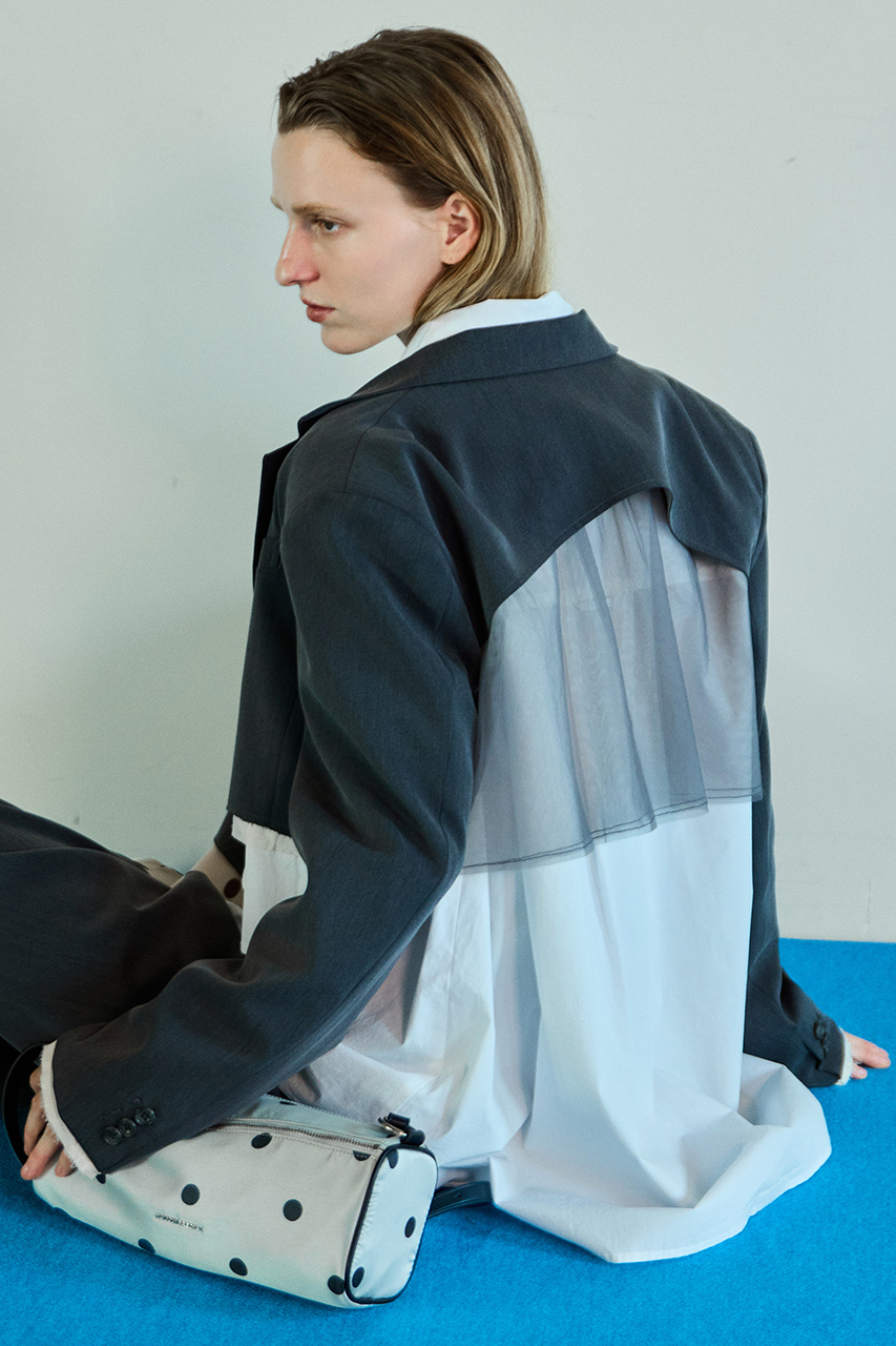 構築的なショートジャケットに、背面のチュールを掛け合わせたドラマティックな一着。フロントはシャープで無機質に、バックは繊細な透け感で軽やかな動きを生むコントラストが魅力。