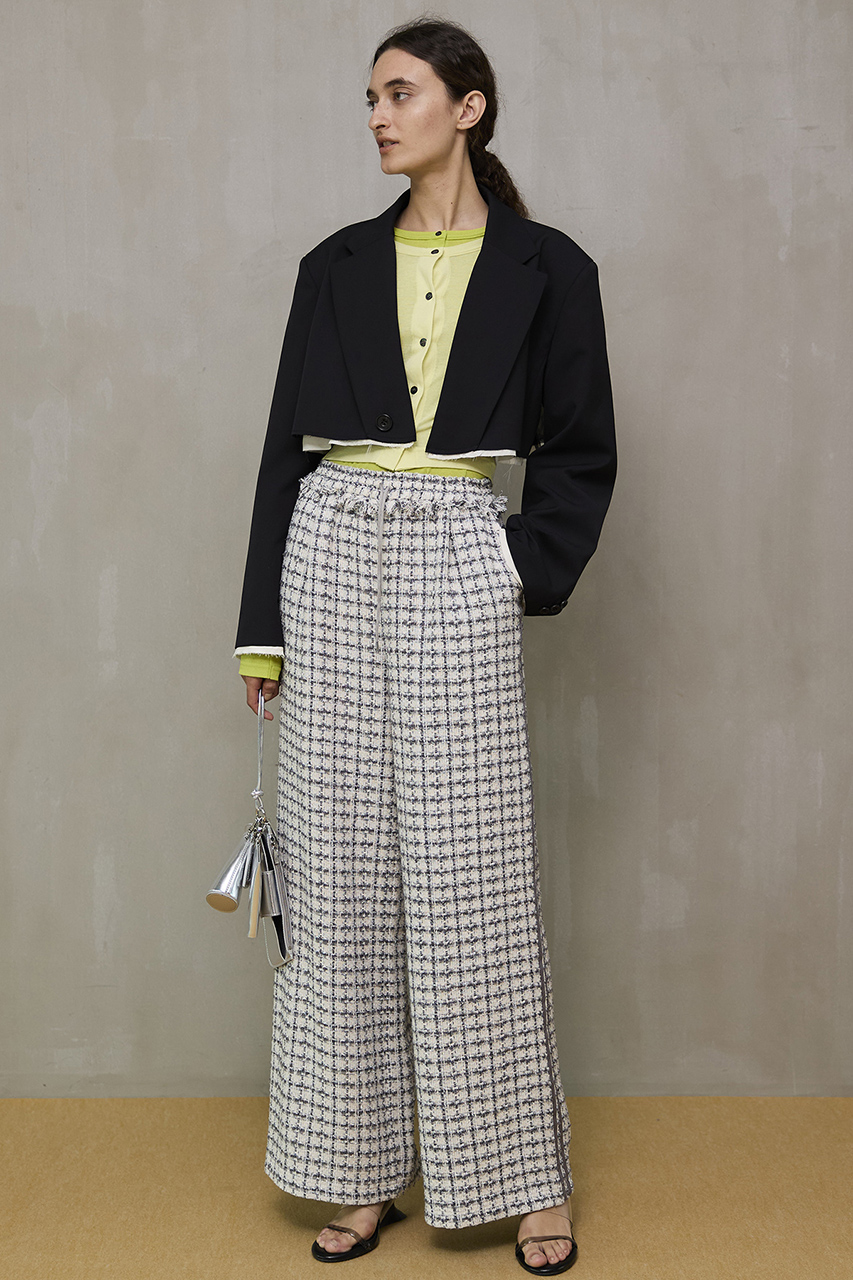 異素材が描く立体感がシルエットの美しさを際立たせ、ウエスト位置を高く見せるショート丈はボリュームボトムとも好相性。同素材のパンツとのセットアップも可能。