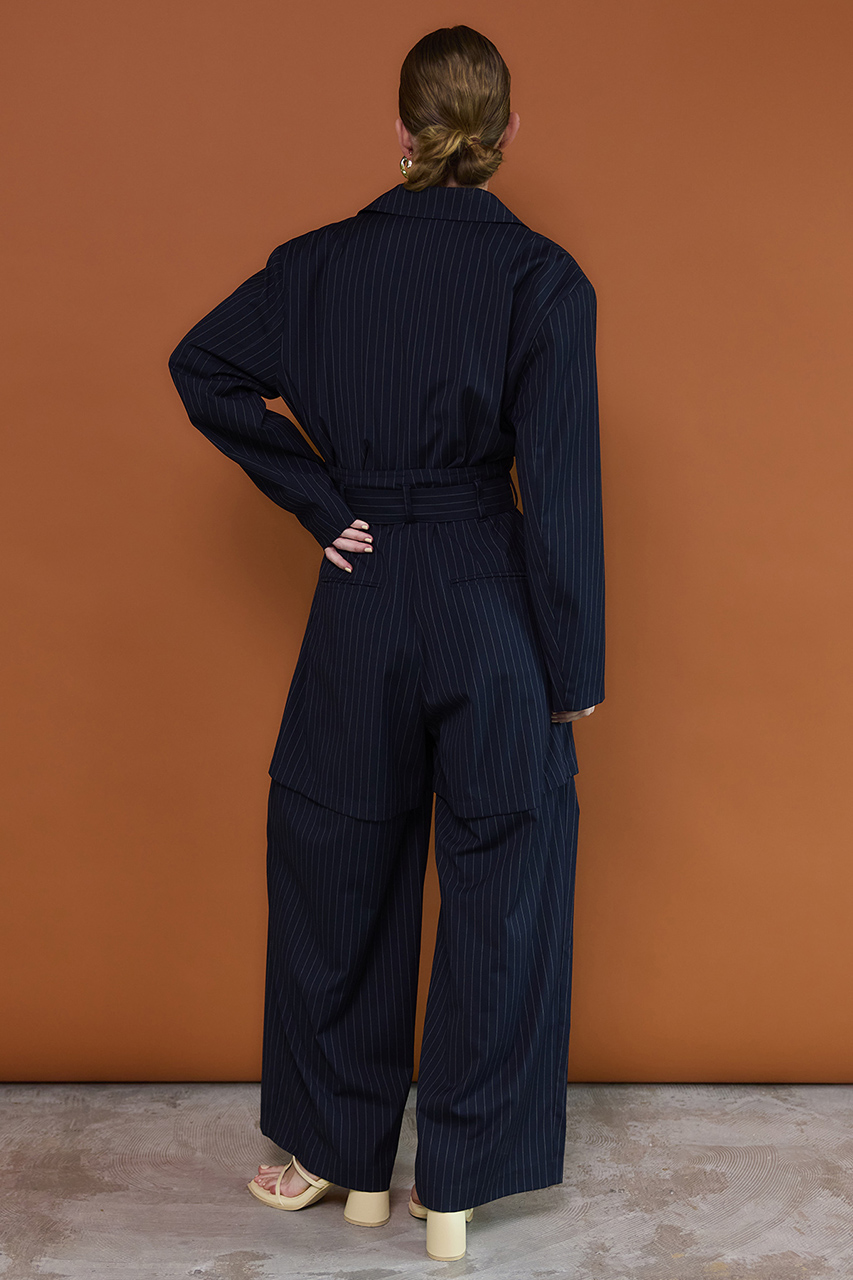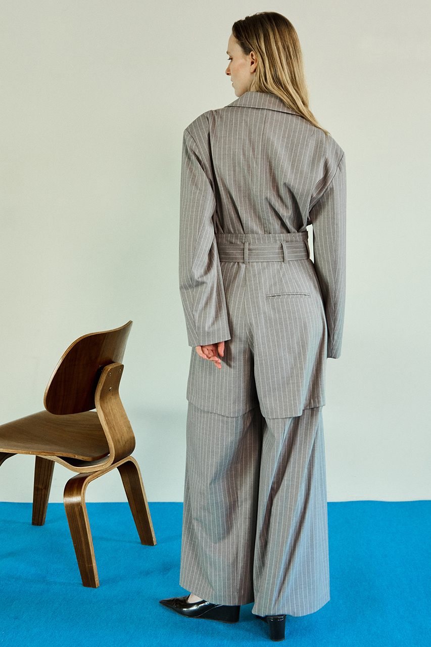 クラシックなテーラードをベースに、シェルボタンやボトムインで抜け感を効かせたオールインワン。ウエストのボタンで上下を切り離して単品使いでき、パンツはショート丈にも変形可能な多機能デザイン。