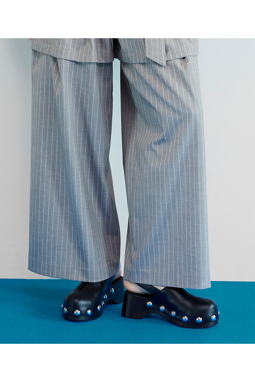 ナチュラルな雰囲気になりすぎないようウッドはダークブラウンに染色し、遊びを感じる大きめのスタッズでMAISON SPECIALらしい一足に。サクッと履けるミュールタイプですが、