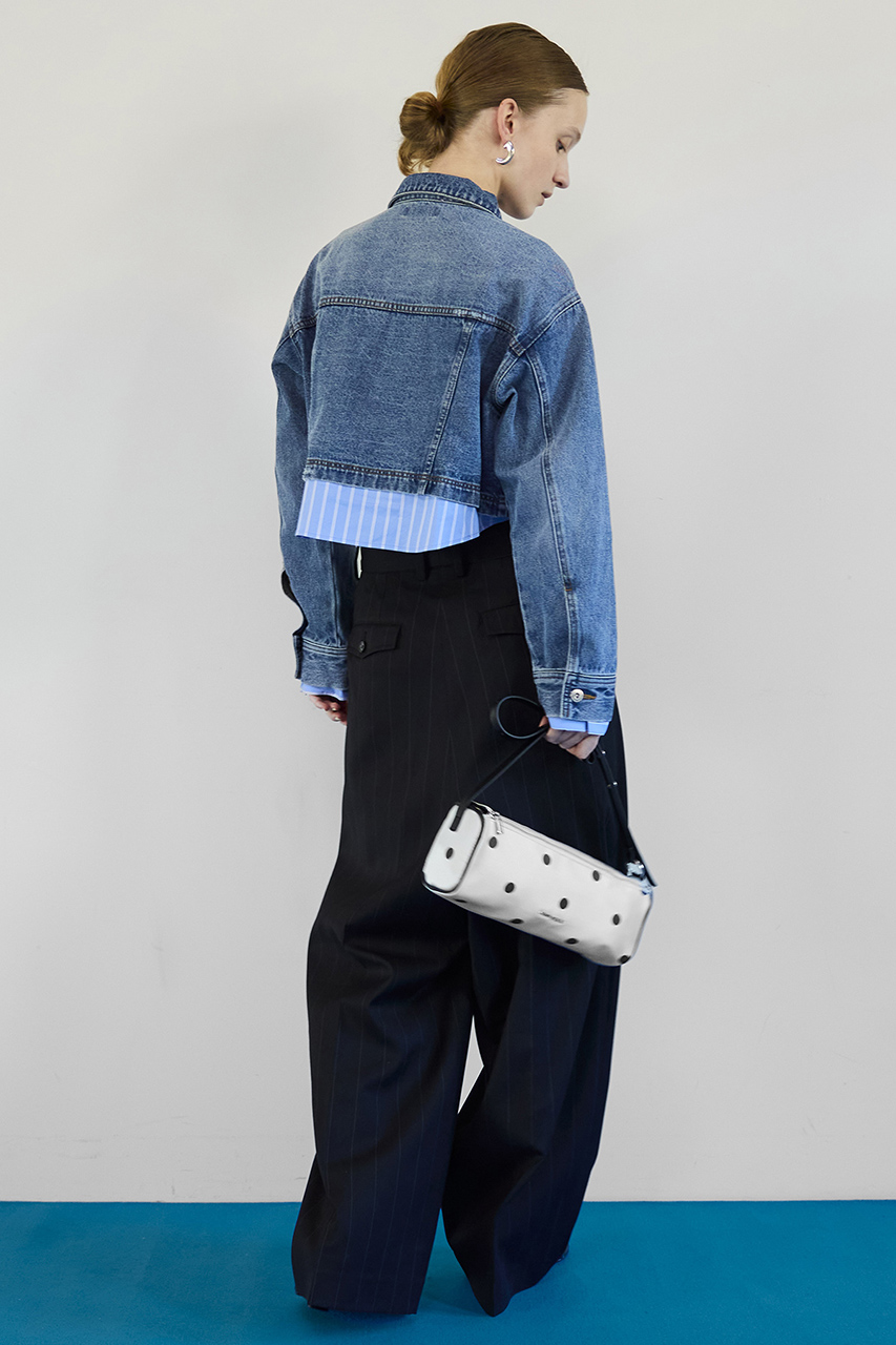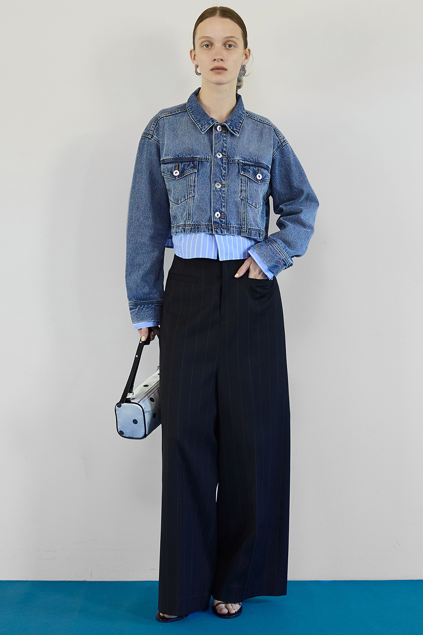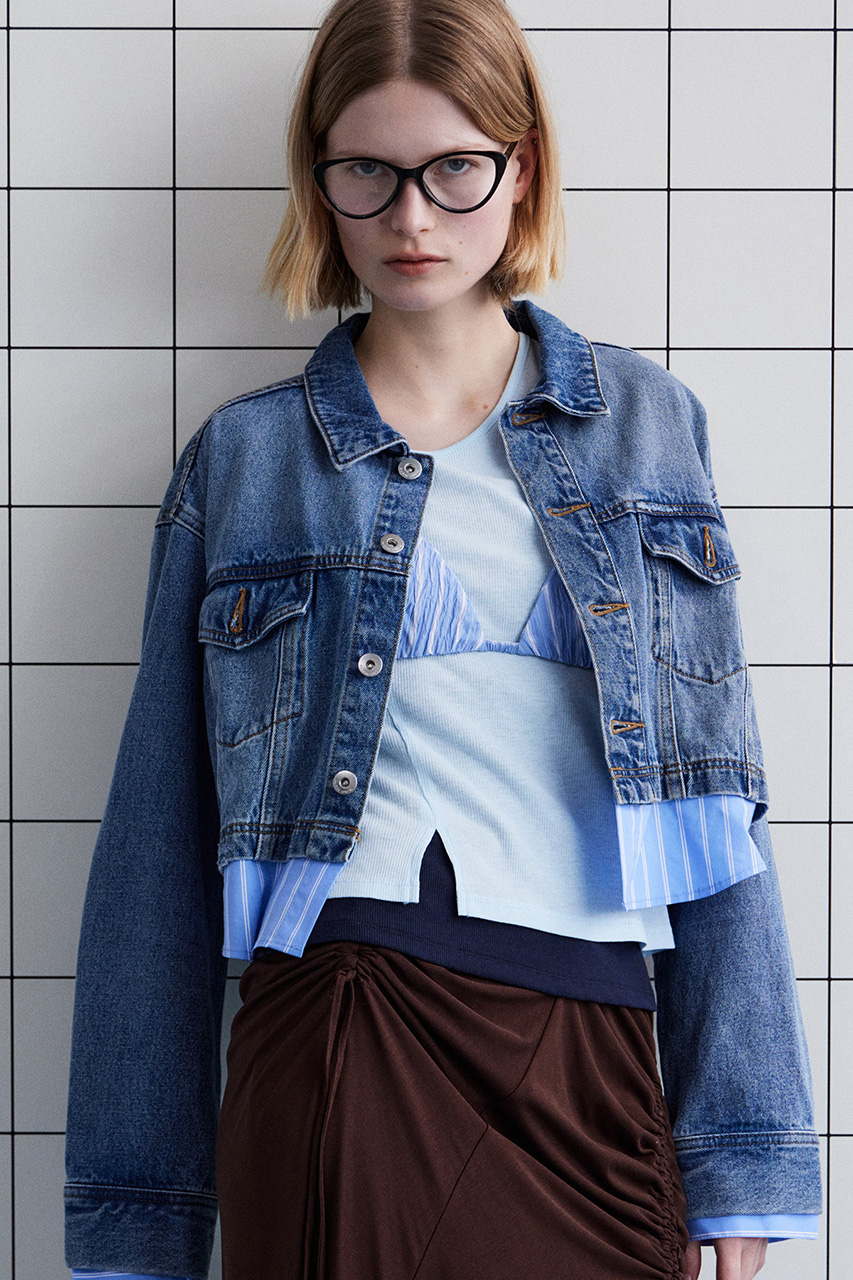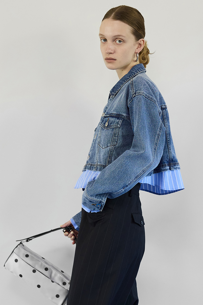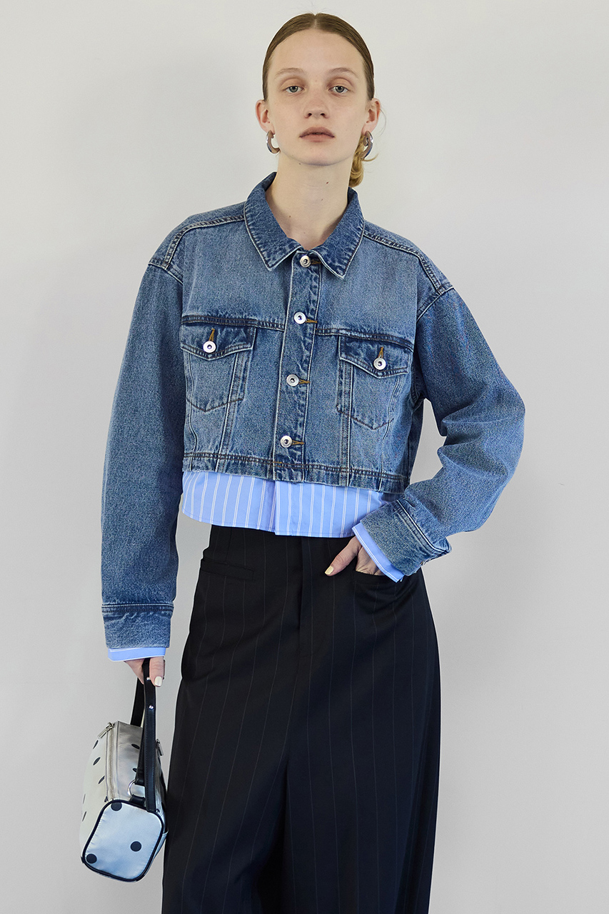 トレンド感あふれるショート丈のデニムジャケットに裾と袖口にシャツをレイヤードしたようなアクセントで着こなしの広がる逸品。ボトムは暗めの色で引き締めて。