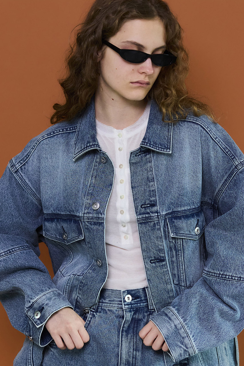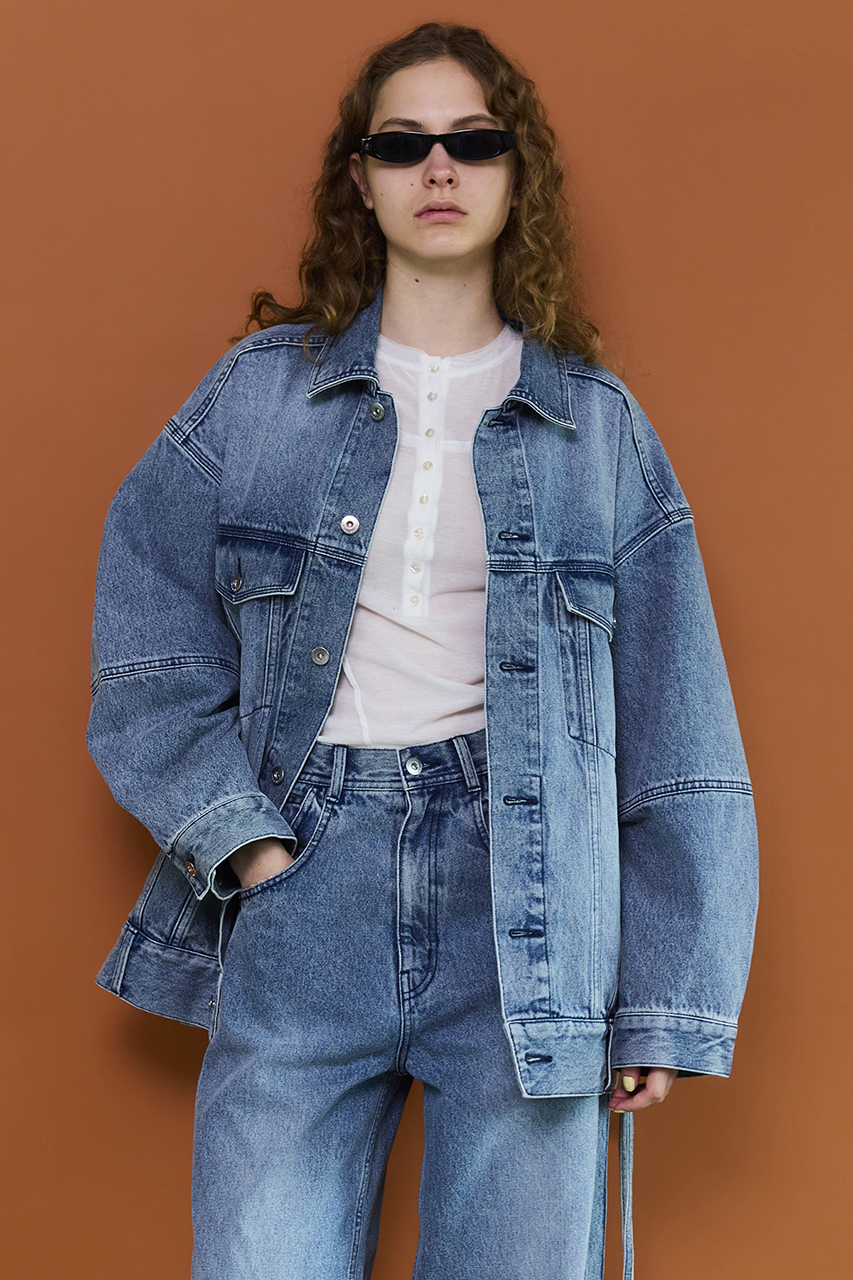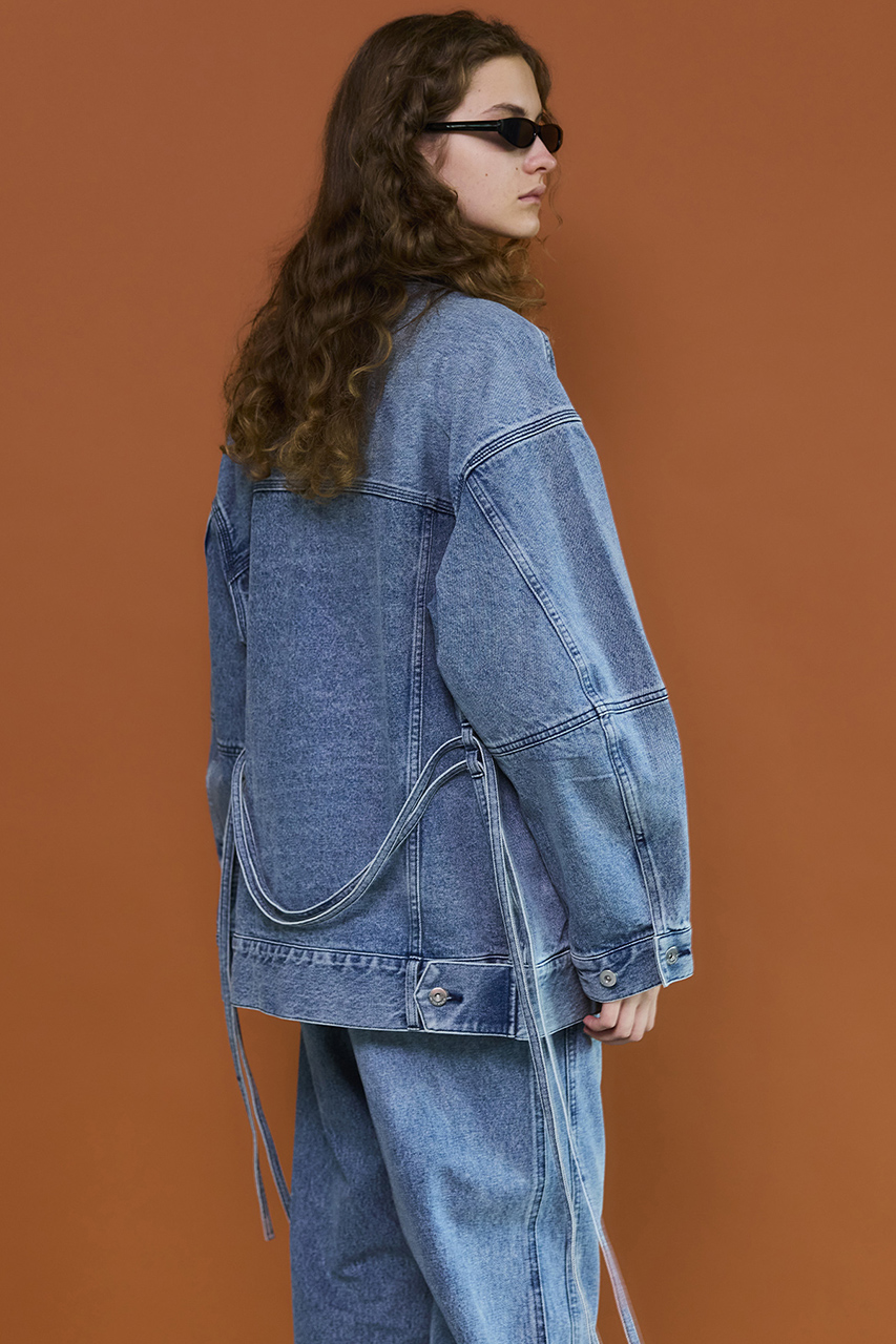 オーバーサイズがポイントのデニムジャケット。本体両脇裾のタブでサイズの調整が可能。また付属のストラップを結んでいただくとウエストマークした着こなしもでき、ストラップは取り外しが可能なので気分に合わせたスタイリングが楽しめます。デニムオンデニムで取り入れやすいトレンドを楽しんで。