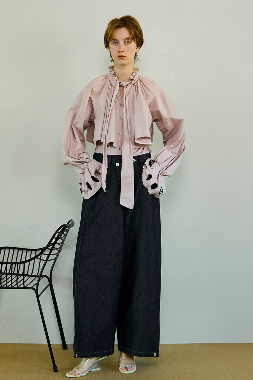 カジュアルな中にモードな魅力を放つ主役顔デニムパンツ。脇に深めのタックを入れたボリュームコクーンシルエットがレッグをカバーしつつ、存在感たっぷり。裾ボタンを開閉することでシルエット調節も可能。