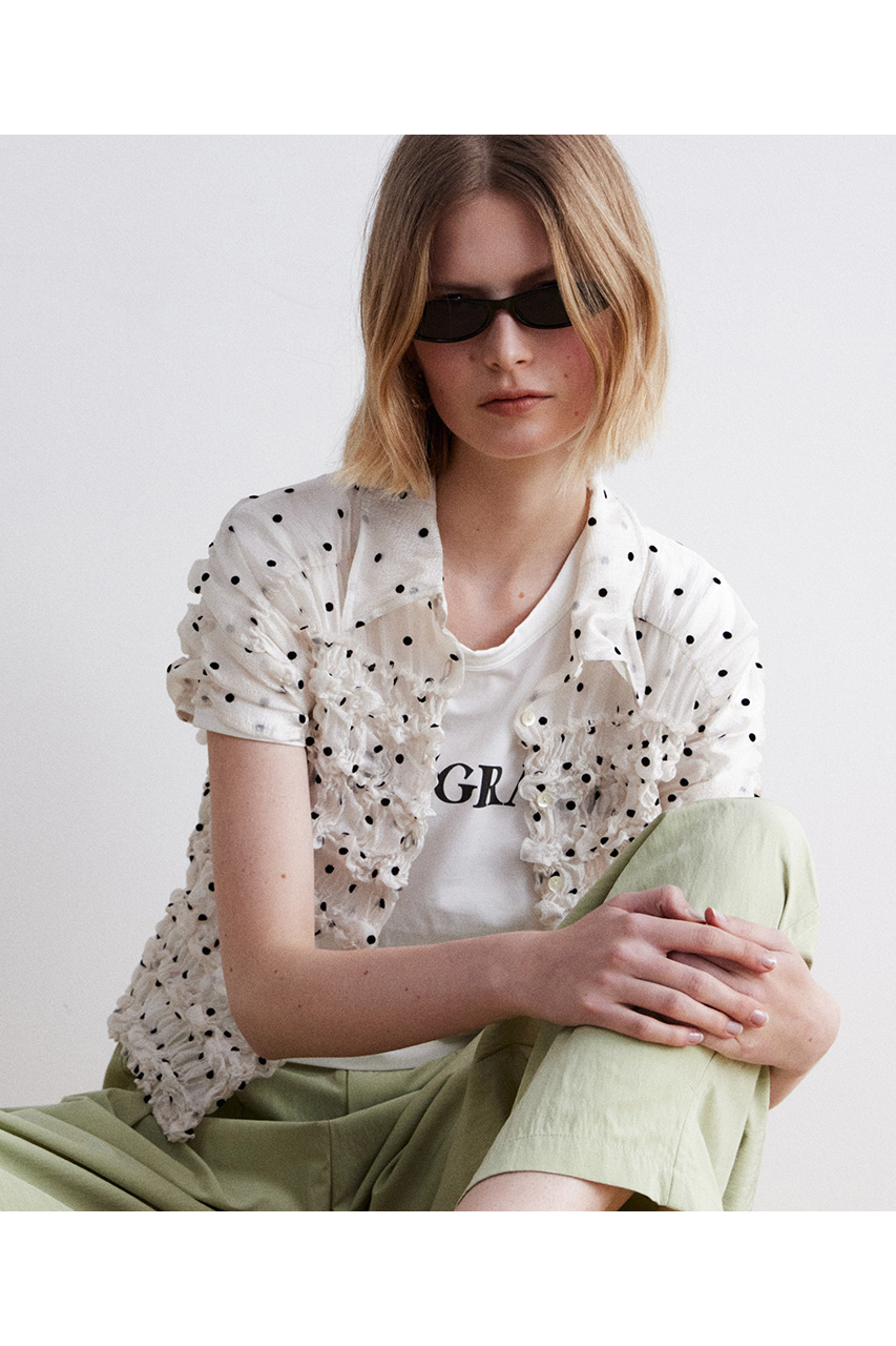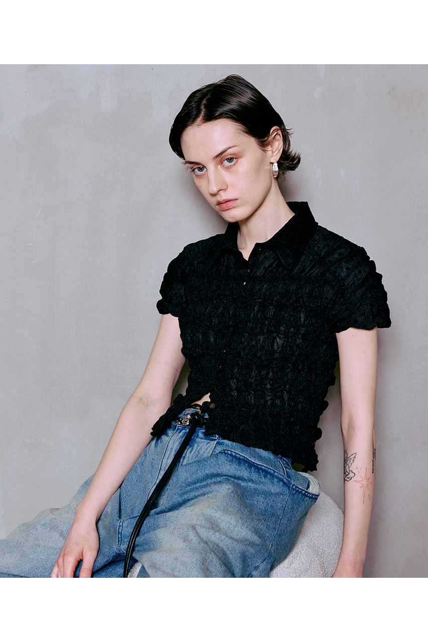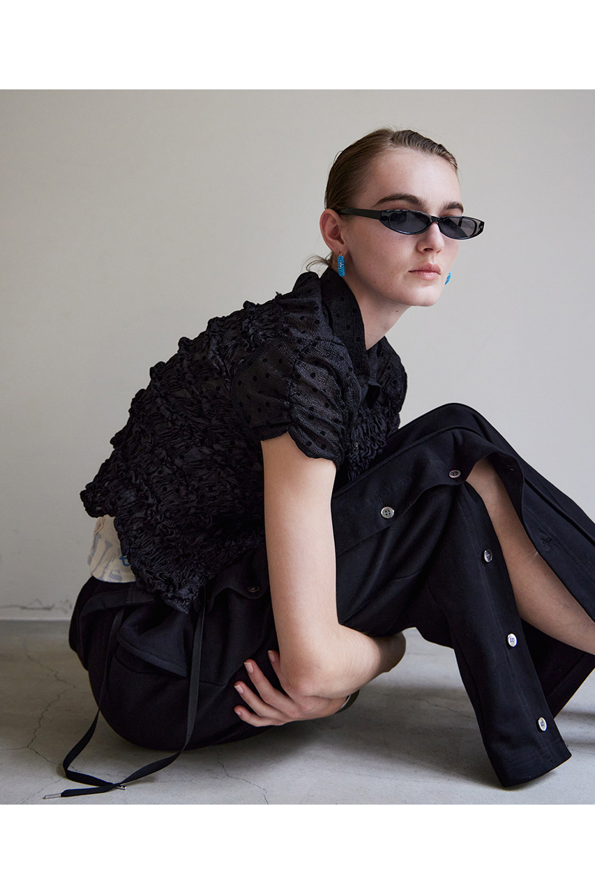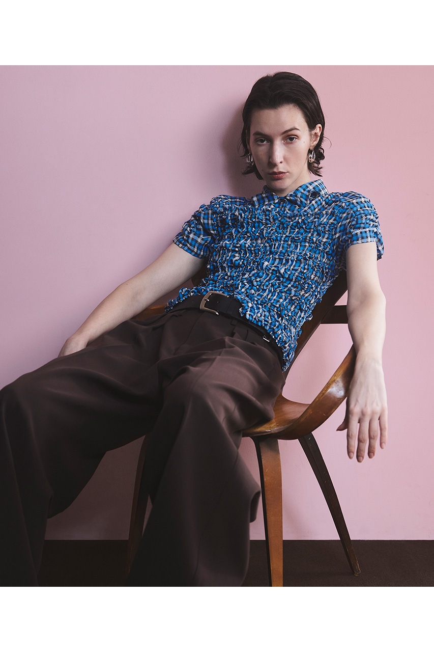 襟元に忍ばせた形状記憶ワイヤーが、甘さを抑えたエッジィな表情を演出。波打たせたり、立ち上げたり、ラフに寝かせたりと、フォルムは気分次第で自在にアレンジ可能。肩まわりはあえてシャーリングを省き、すっきりとした印象に。コンパクトな丈感と構築的なシルエットで、インせずともバランスよく決まる計算された一枚。