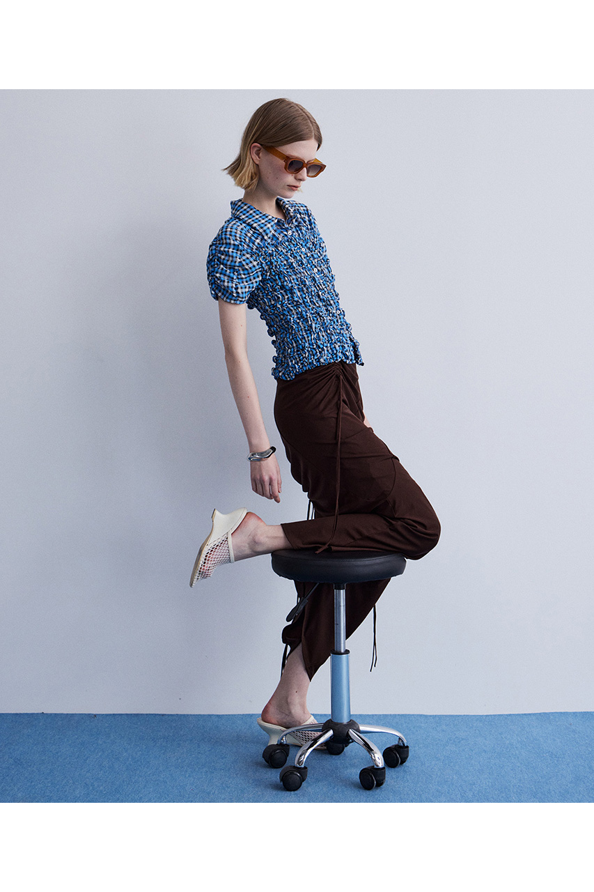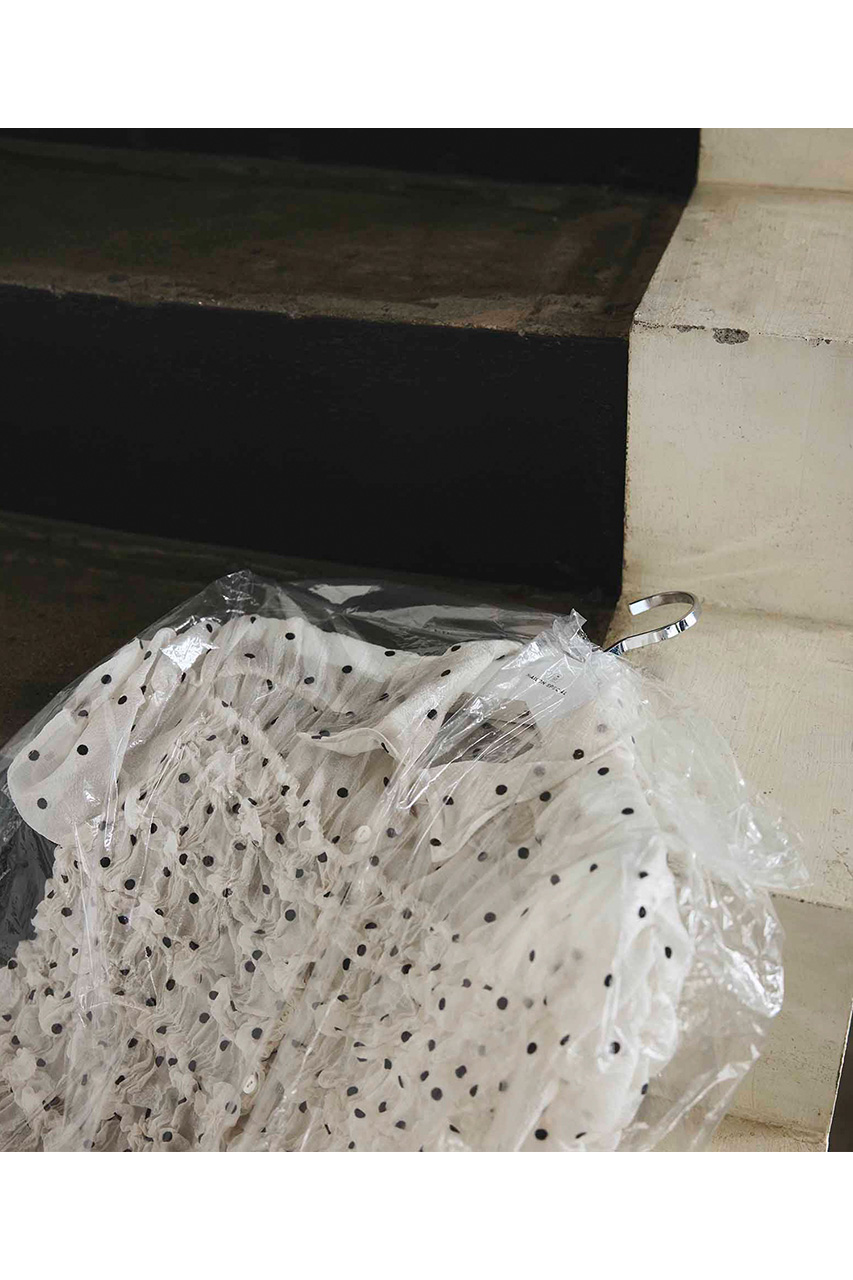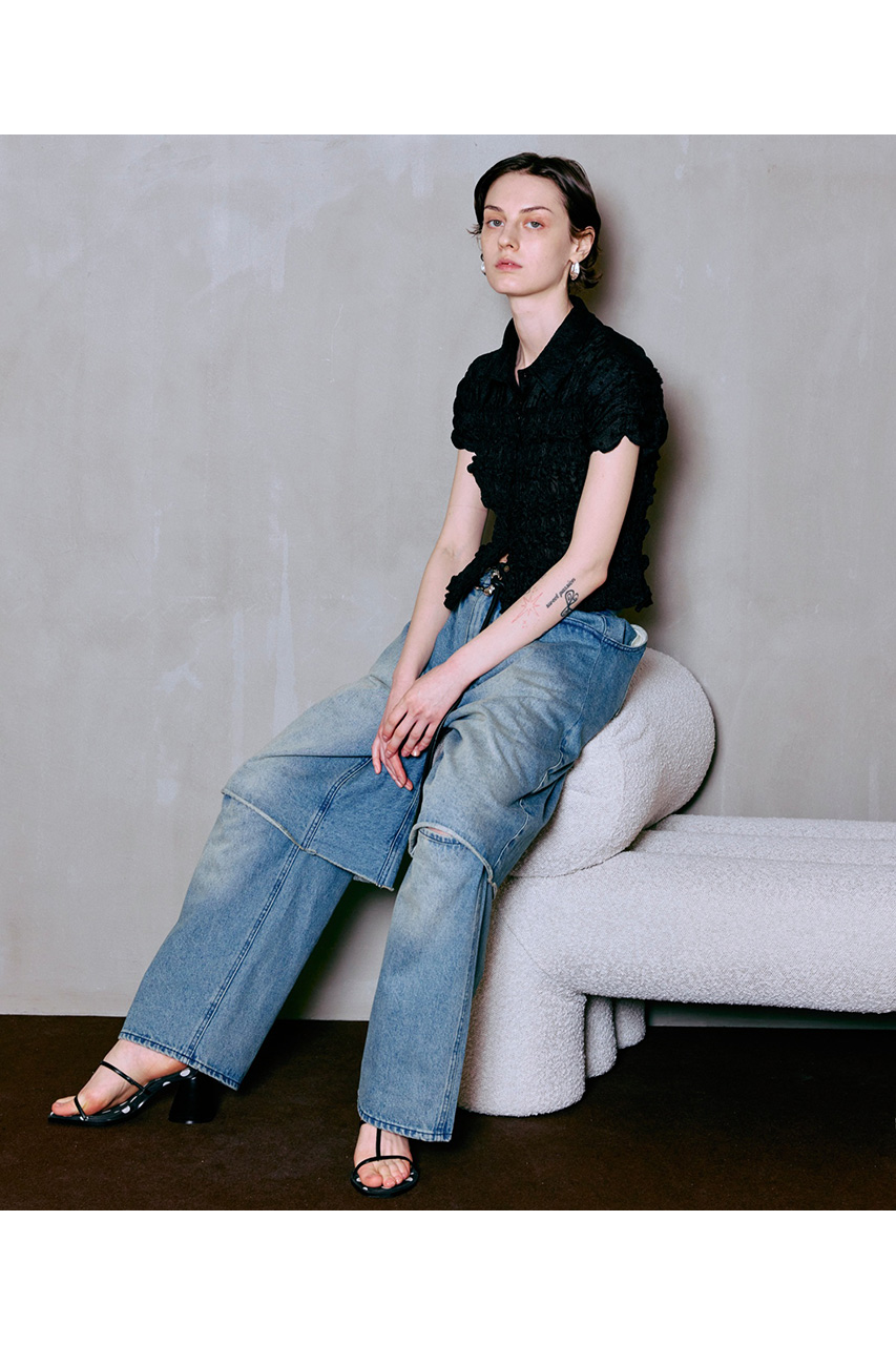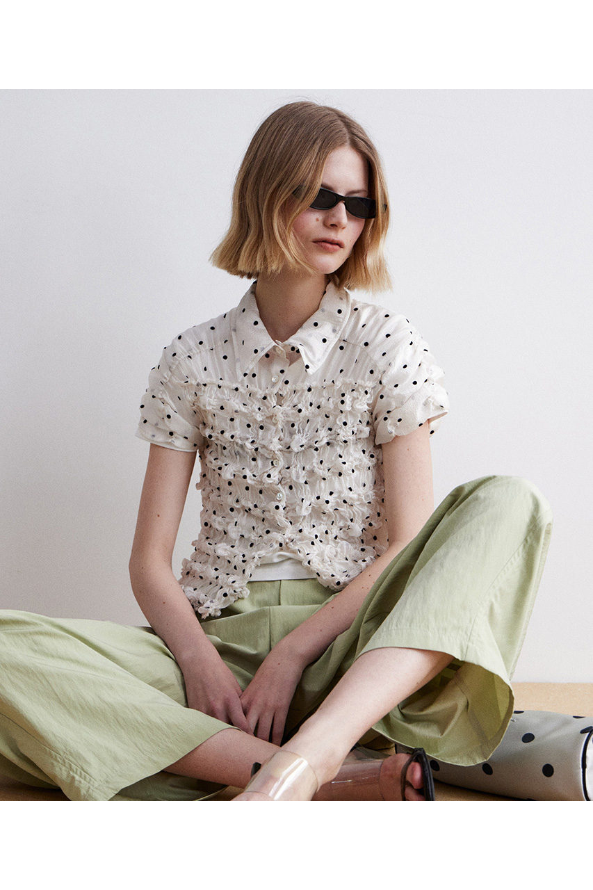 襟元に忍ばせた形状記憶ワイヤーが、甘さを抑えたエッジィな表情を演出。波打たせたり、立ち上げたり、ラフに寝かせたりと、フォルムは気分次第で自在にアレンジ可能。肩まわりはあえてシャーリングを省き、すっきりとした印象に。コンパクトな丈感と構築的なシルエットで、インせずともバランスよく決まる計算された一枚。