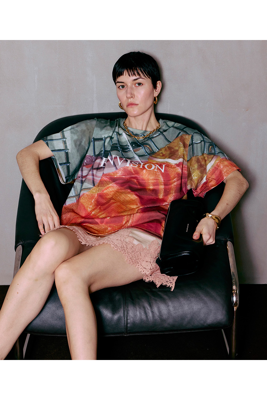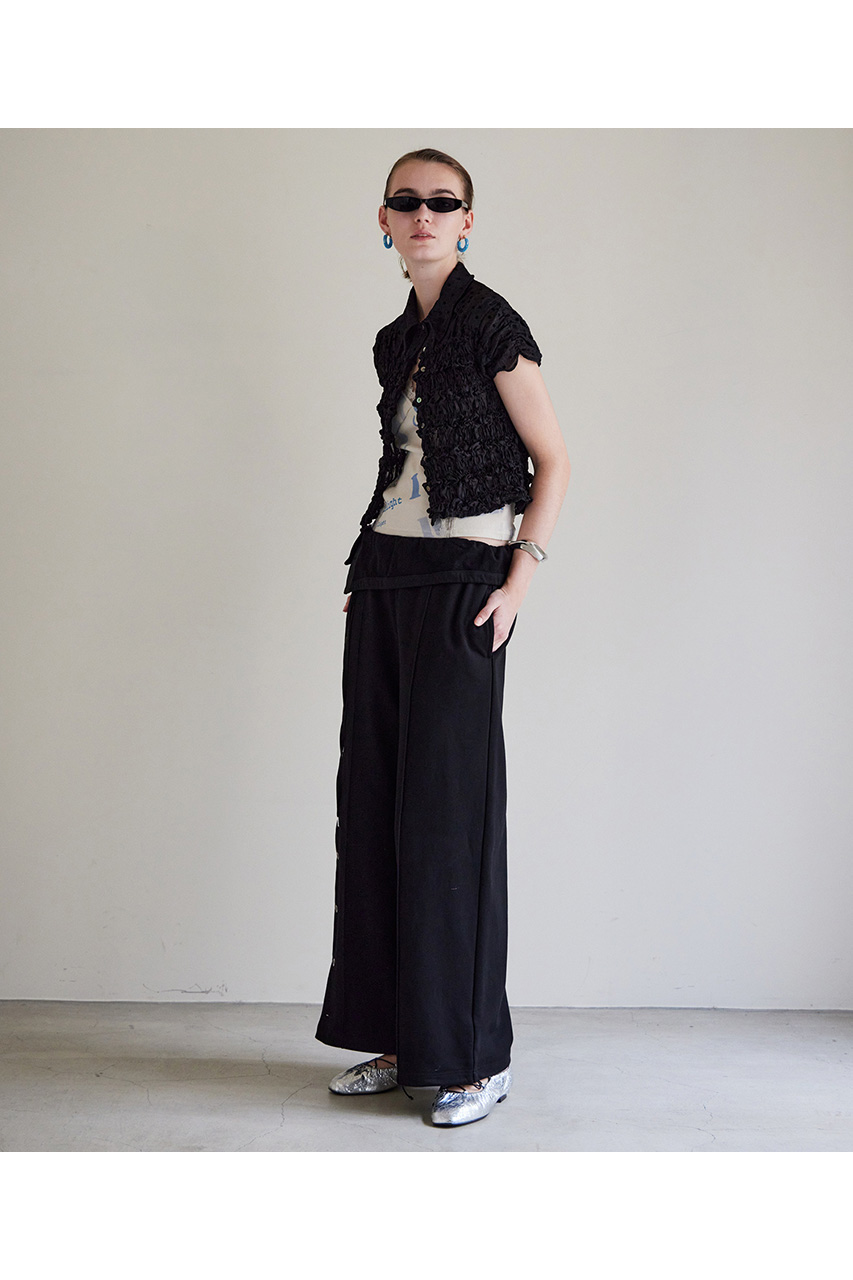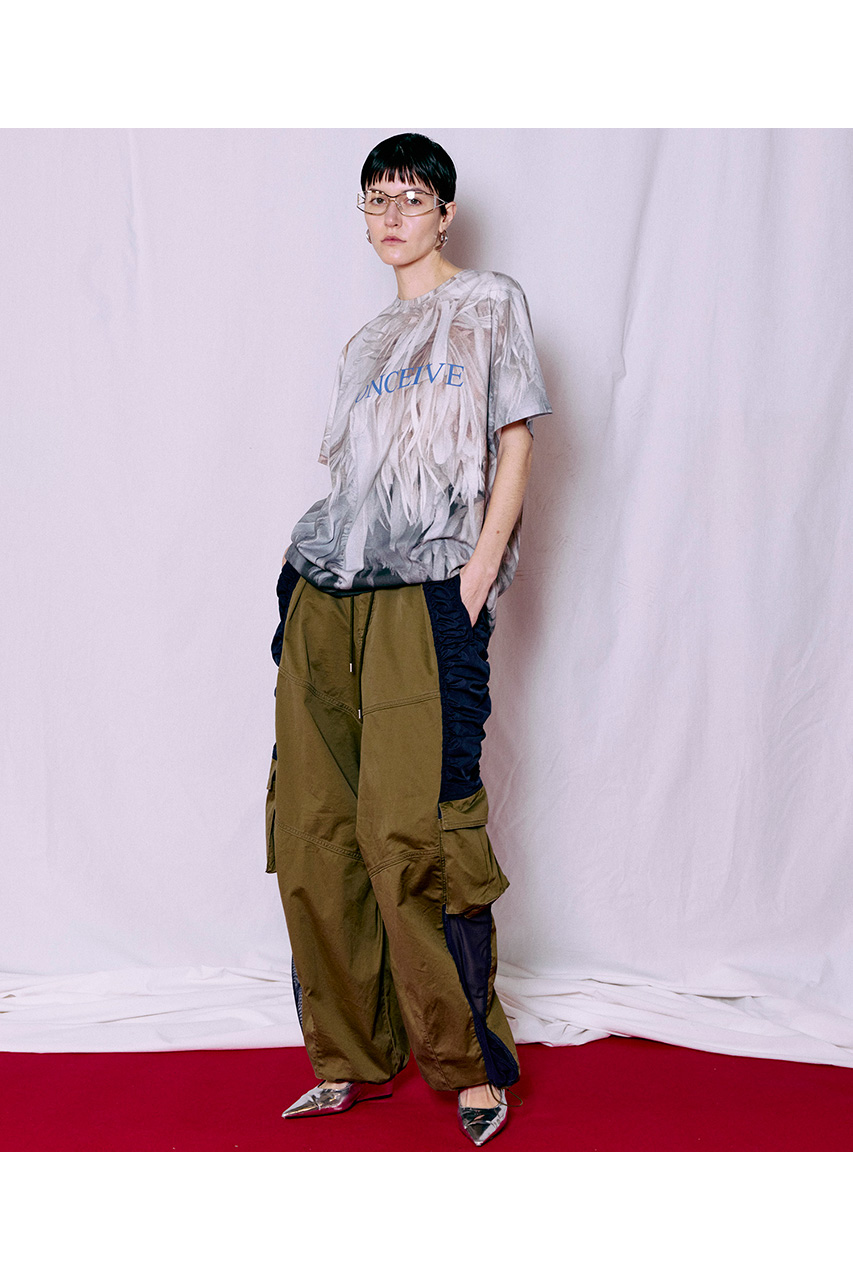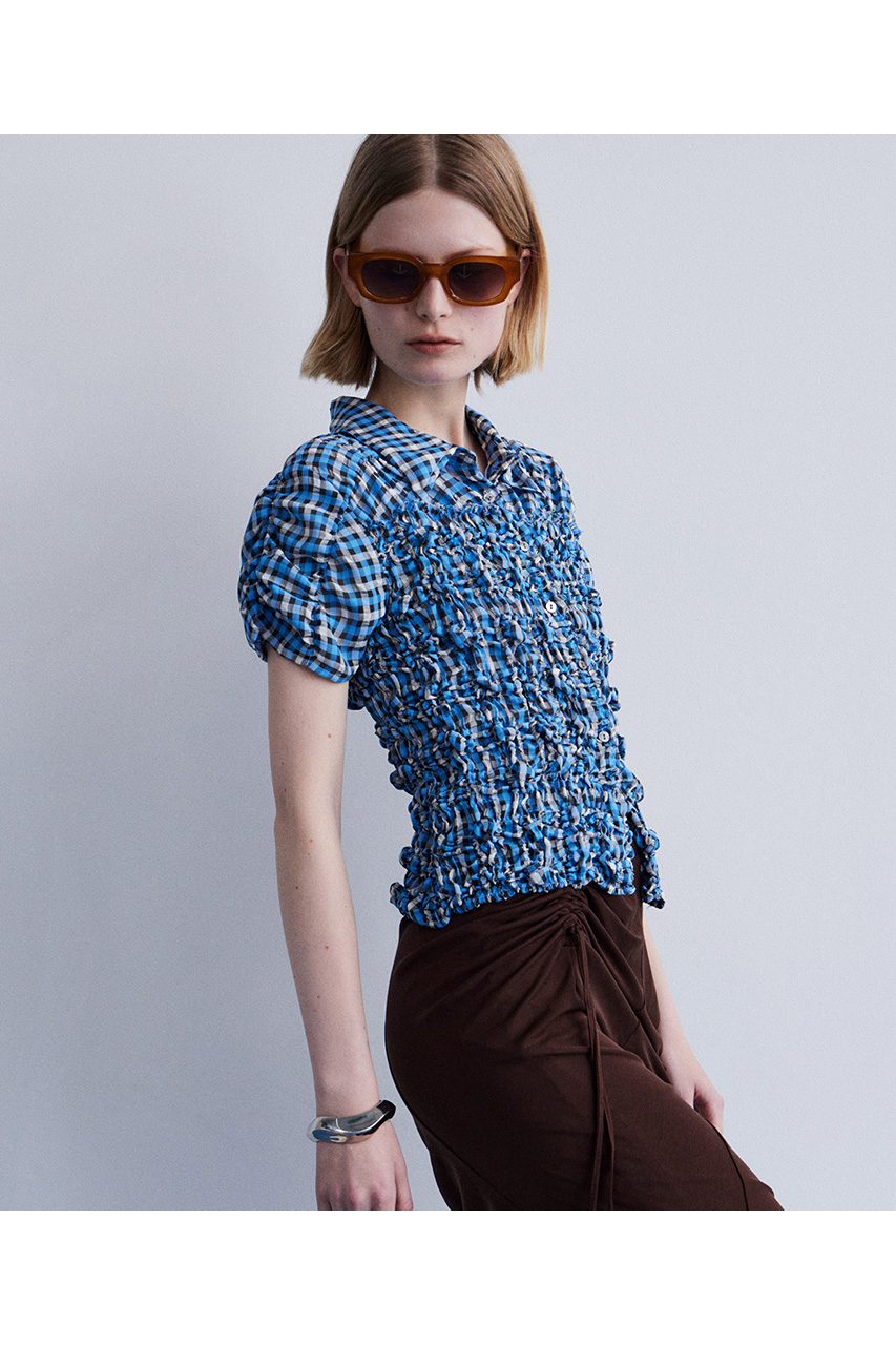 襟元に忍ばせた形状記憶ワイヤーが、甘さを抑えたエッジィな表情を演出。波打たせたり、立ち上げたり、ラフに寝かせたりと、フォルムは気分次第で自在にアレンジ可能。肩まわりはあえてシャーリングを省き、すっきりとした印象に。コンパクトな丈感と構築的なシルエットで、インせずともバランスよく決まる計算された一枚。