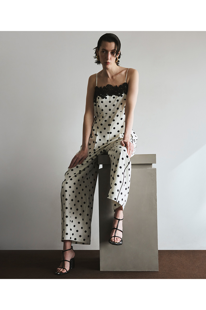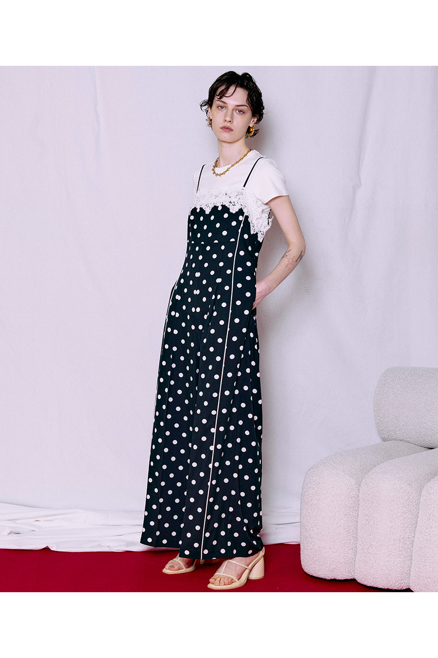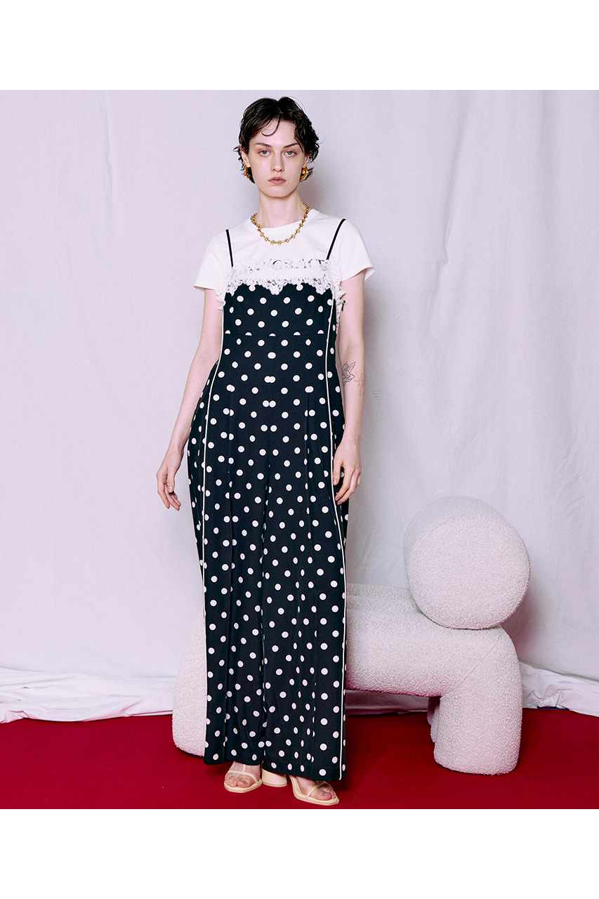 フェミニンなムードをベースに、配色のコントラストとシャープなラインで甘さを洗練へと昇華した一着。華奢なストラップと縦のラインを強調するディテールが、すっきりとした佇まいを叶えます。一枚でさらりと着るのはもちろん、レイヤードや羽織り次第で表情が広がる、着回し力の高いアイテム。