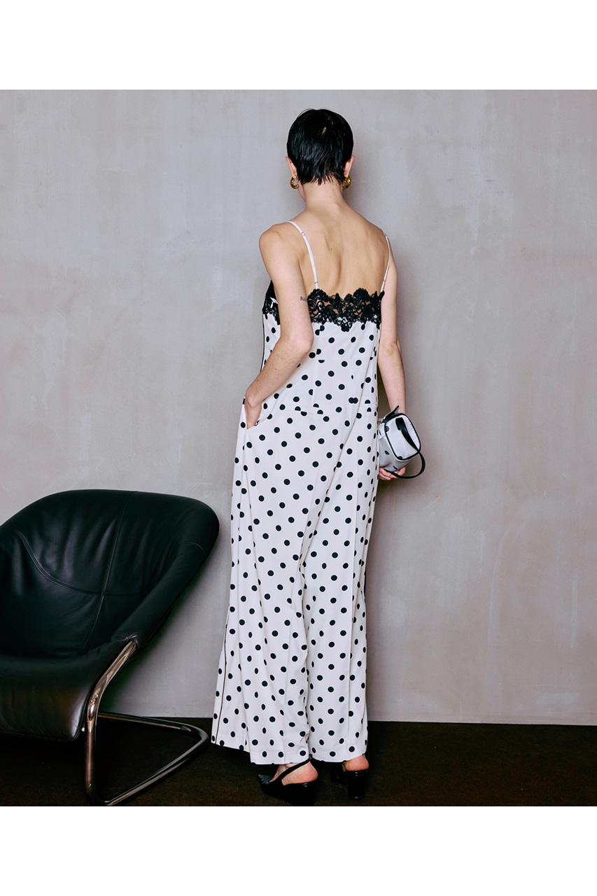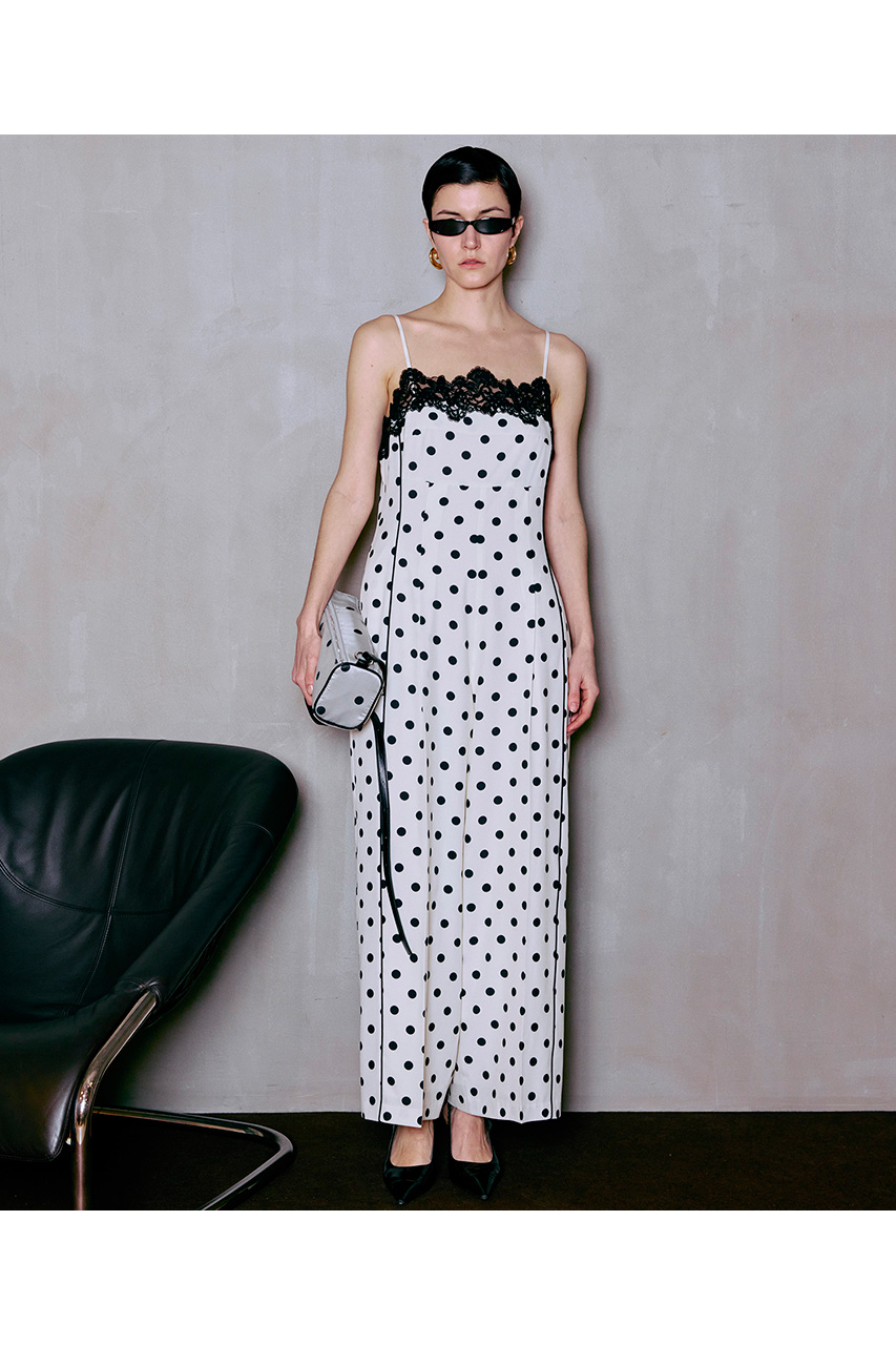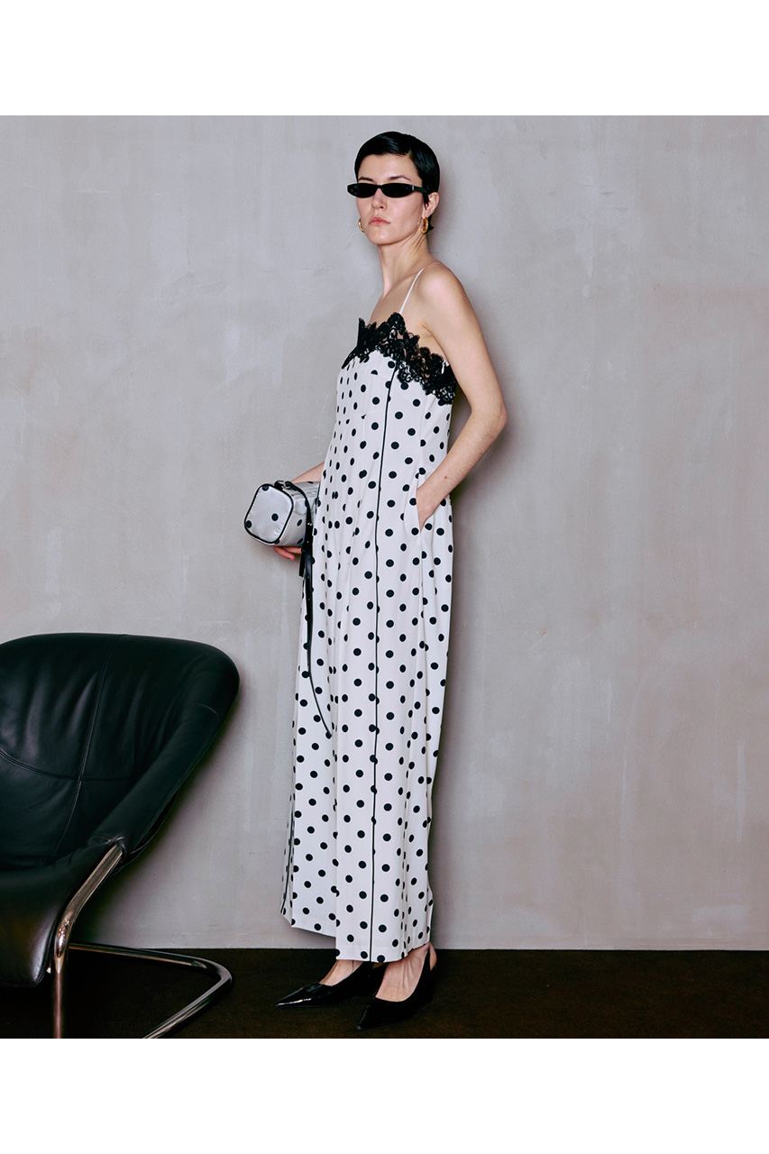 フェミニンなムードをベースに、配色のコントラストとシャープなラインで甘さを洗練へと昇華した一着。華奢なストラップと縦のラインを強調するディテールが、すっきりとした佇まいを叶えます。一枚でさらりと着るのはもちろん、レイヤードや羽織り次第で表情が広がる、着回し力の高いアイテム。