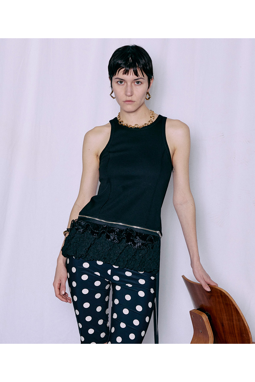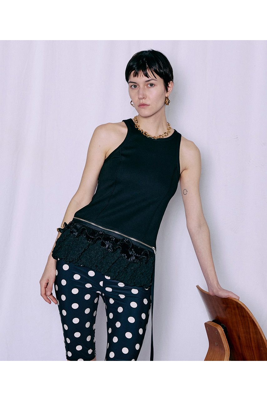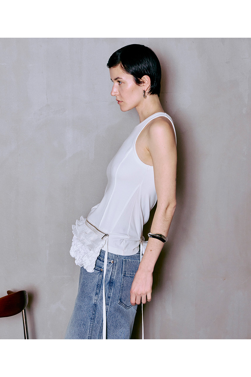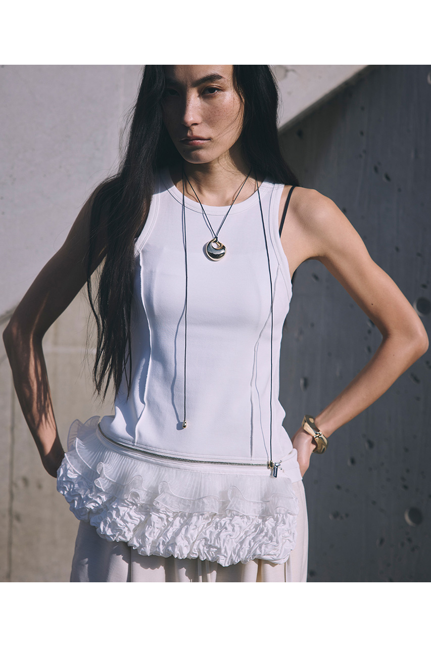 ファスナーでフリルの着脱ができ、表情を自在に変えられるタンクトップ。フリルを付ければ華やかでモードな印象に、外せばミニマルでクリーンな佇まいにシフト。トレンド感を取り入れつつ上品さも備え、レイヤードにも一枚着にも対応する、夏のワードローブで活躍する万能アイテム。