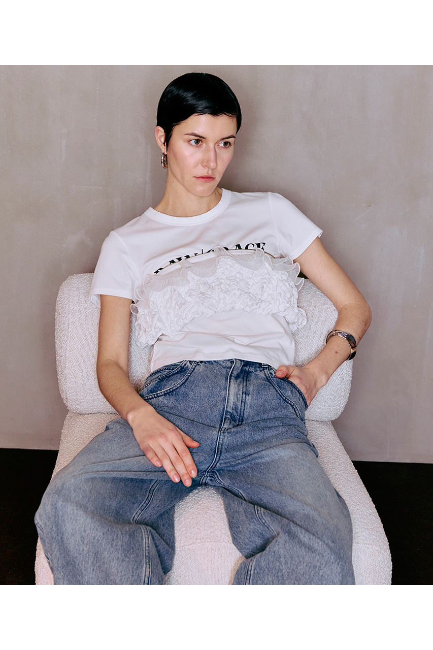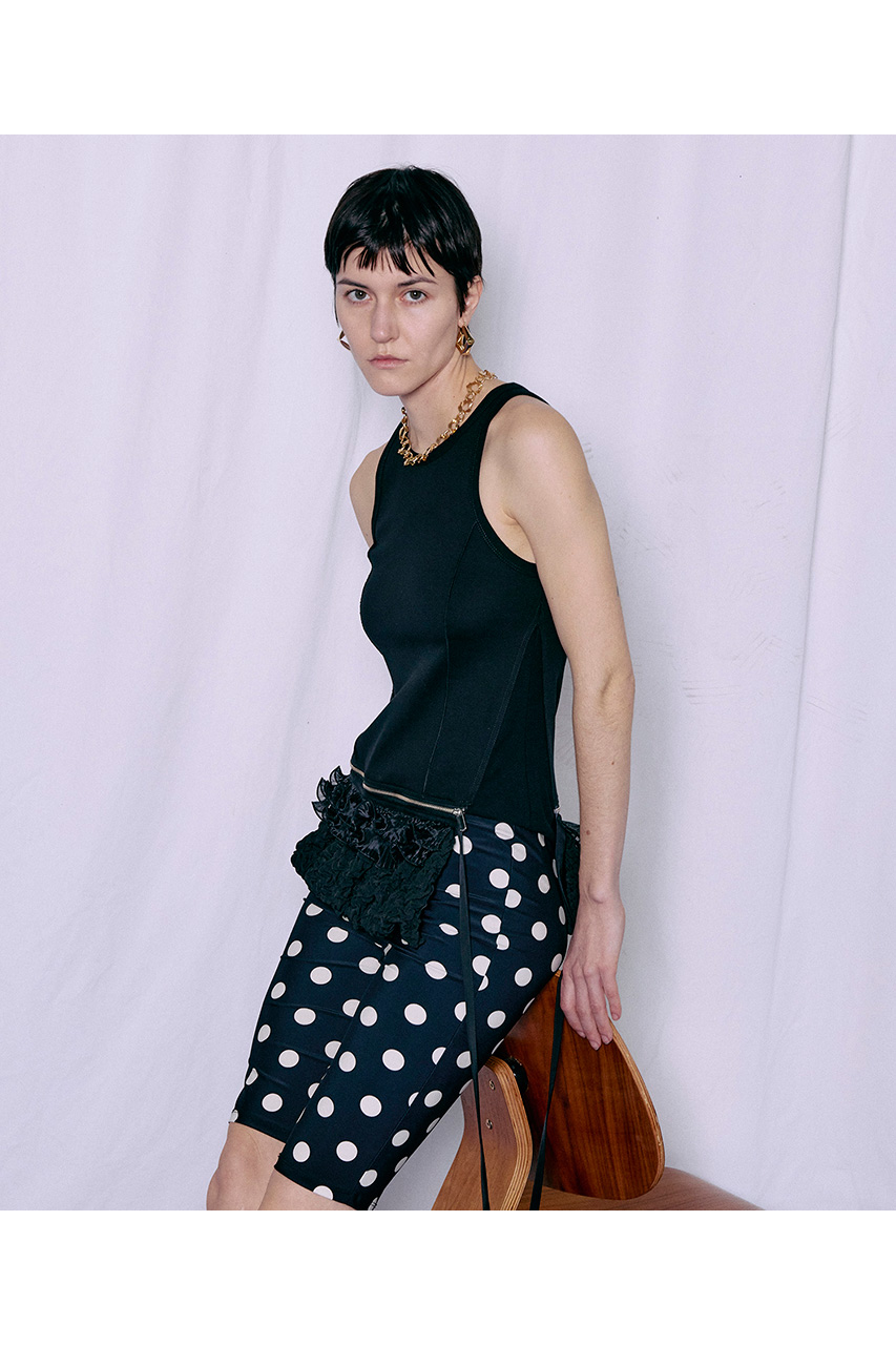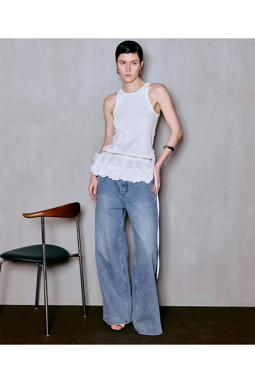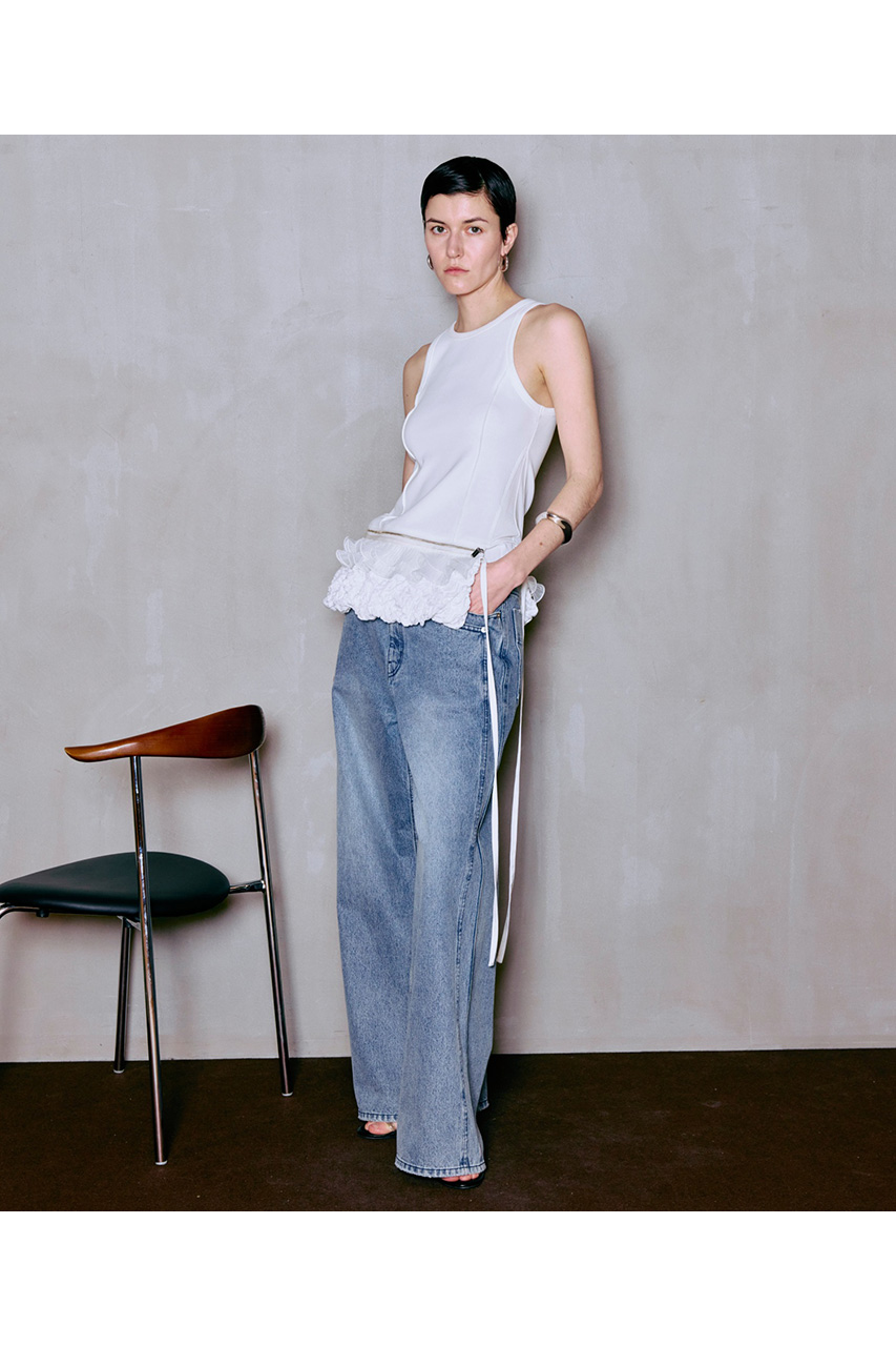 ファスナーでフリルの着脱ができ、表情を自在に変えられるタンクトップ。フリルを付ければ華やかでモードな印象に、外せばミニマルでクリーンな佇まいにシフト。トレンド感を取り入れつつ上品さも備え、レイヤードにも一枚着にも対応する、夏のワードローブで活躍する万能アイテム。