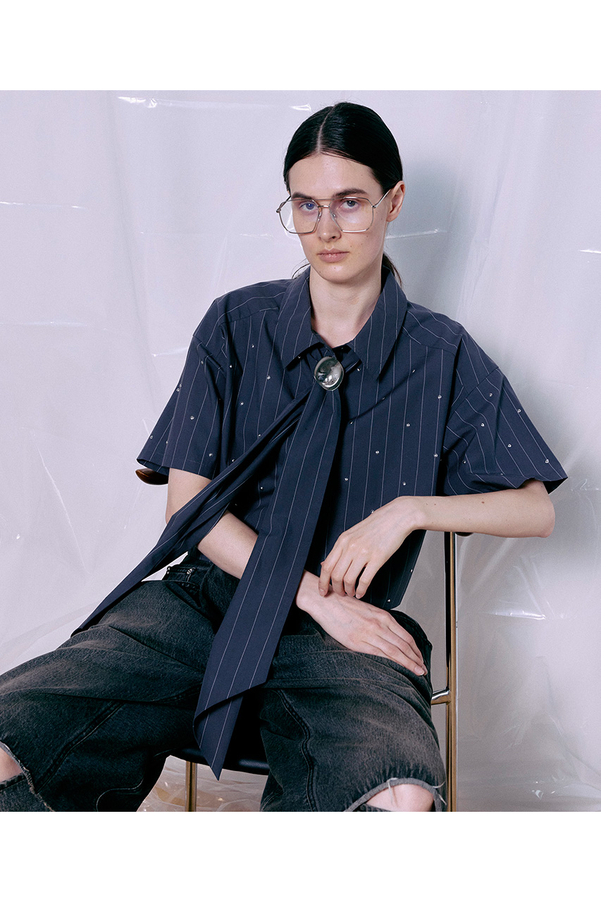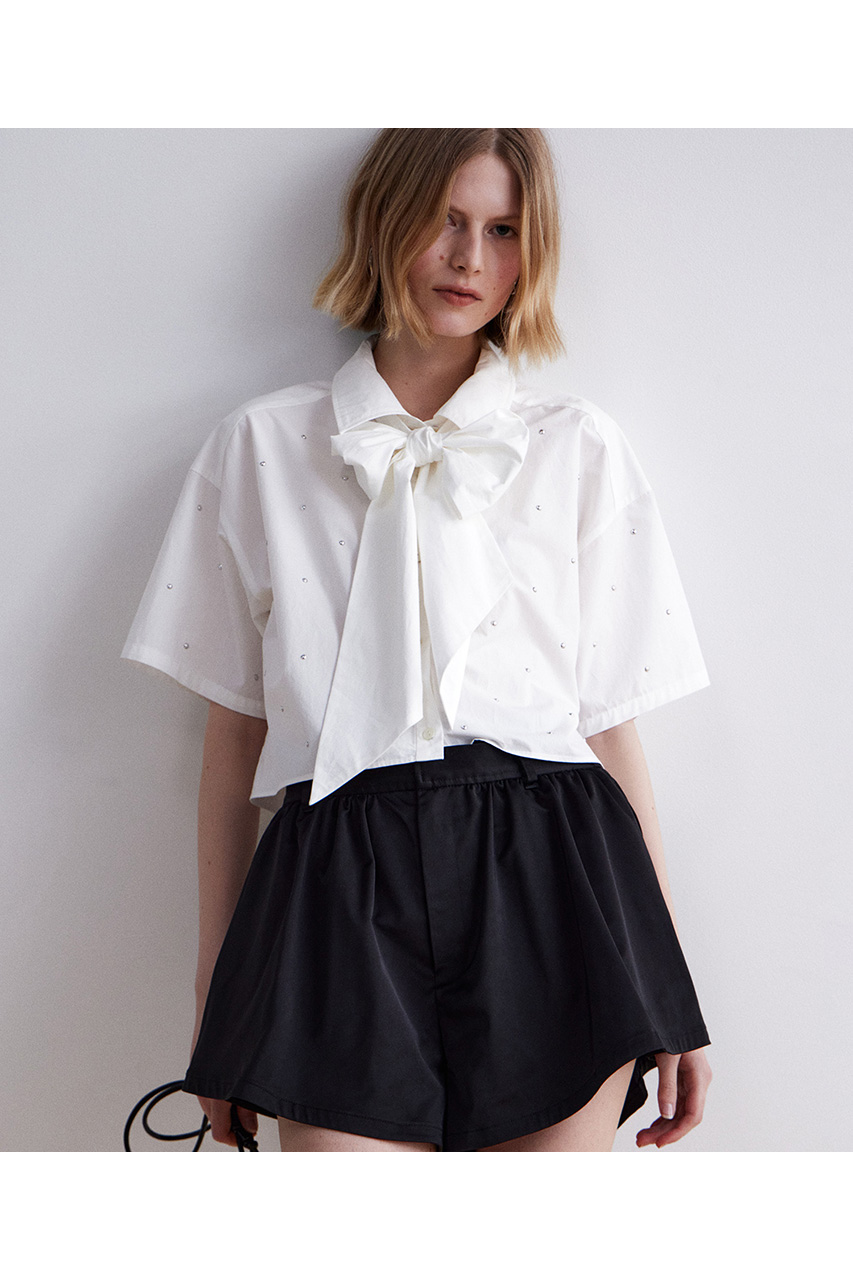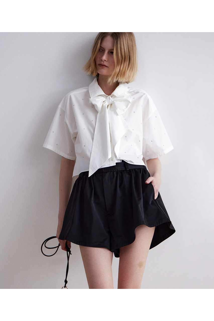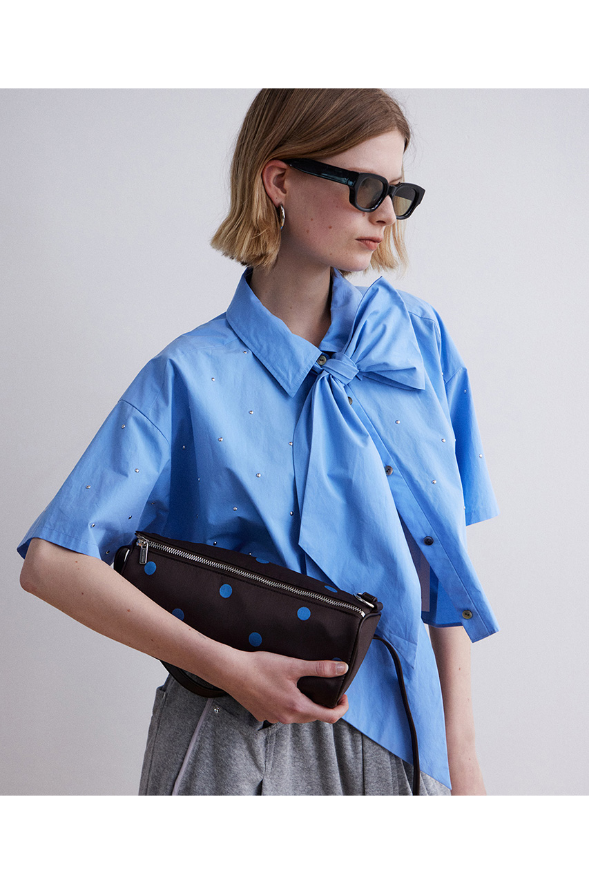 襟元にボウタイとホットフィックスをあしらった、存在感のあるデザインシャツ。片結びで程よくモードに、リボン結びでフェミニンに、ラフに垂らせばエッジィな印象へと、結び方次第で表情が変化。一枚着はもちろん、インナーとしても映え、シーズンレスに活躍する一着。