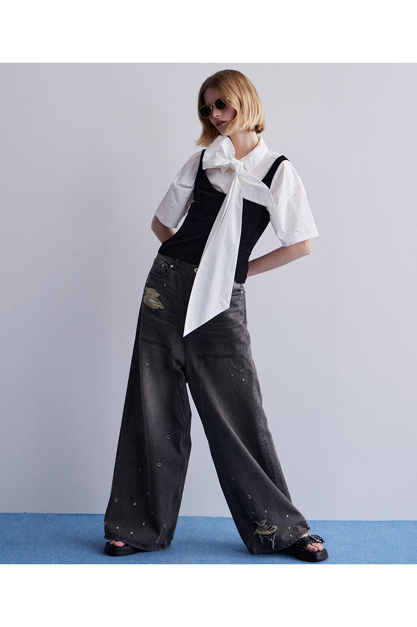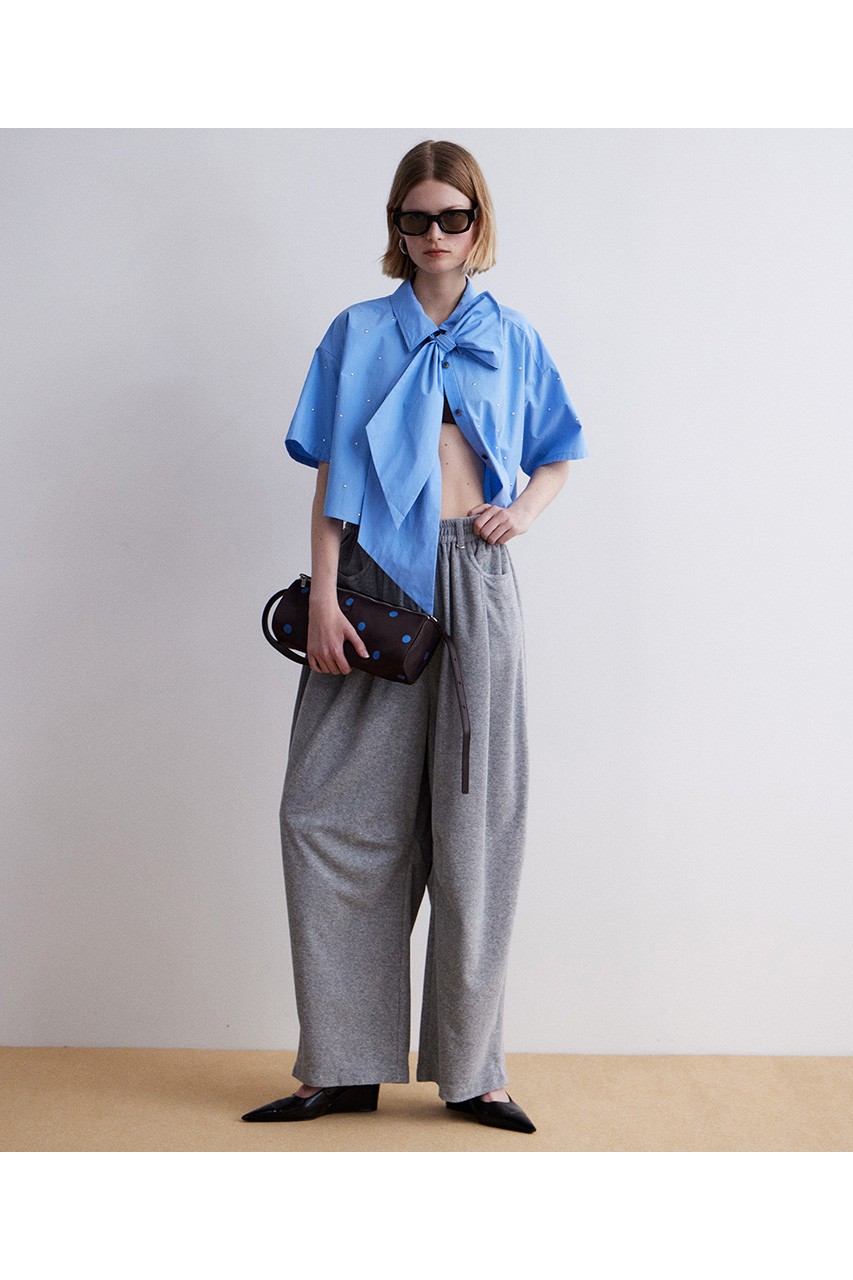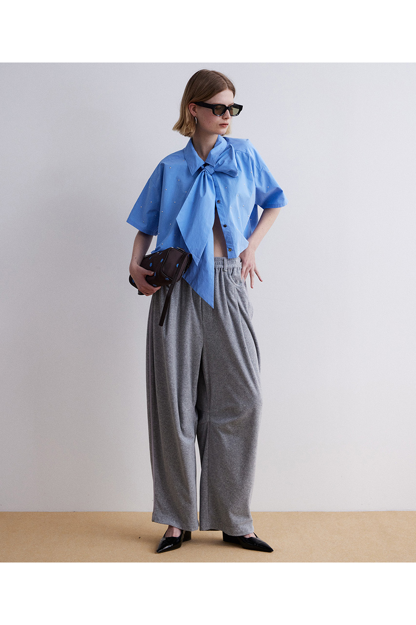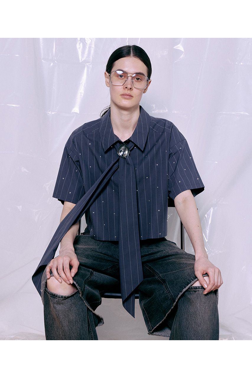 襟元にボウタイとホットフィックスをあしらった、存在感のあるデザインシャツ。片結びで程よくモードに、リボン結びでフェミニンに、ラフに垂らせばエッジィな印象へと、結び方次第で表情が変化。一枚着はもちろん、インナーとしても映え、シーズンレスに活躍する一着。