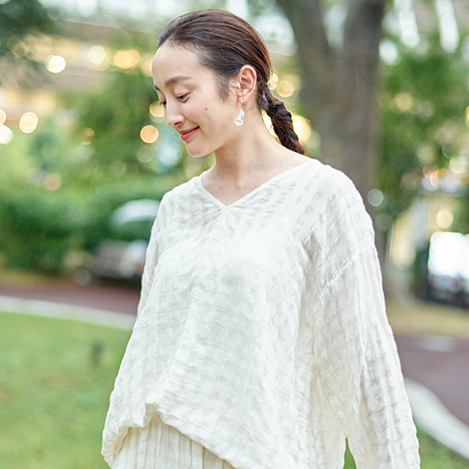 表情のある素材使いが目を引くシャーリングトップ。透け感と凹凸のある生地にシャーリングを施し、身体のラインを拾いすぎない快適な着心地を叶えます。襟元には形状記憶ワイヤーを内蔵し、フォルムを自在にアレンジ可能。コンパクトな丈感と構築的なシルエットで、インせずともバランスよく決まる一着。