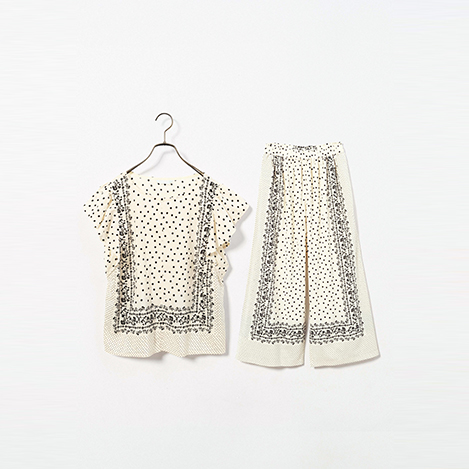 ルームウェアとしてもワンマイルとしても楽しめるバンダナドット柄のウェアが登場。綿レーヨン素材なので見た目の分量感より軽くすっきりした着こなしになります。